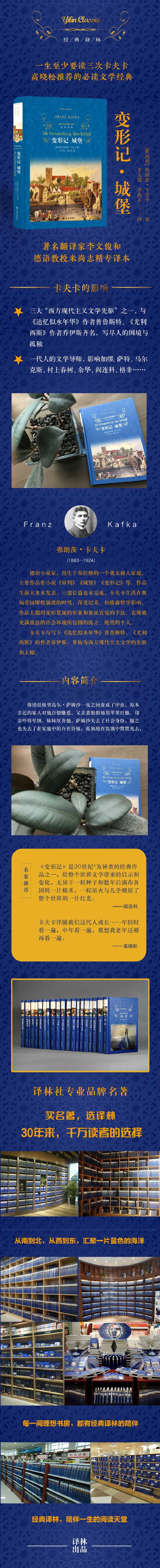 弗朗茨·卡夫卡,著,弗兰兹•卡夫卡,生活于奥匈帝国(奥地利帝国和匈牙利组成的政合国)统治下的捷克德语小说家,本职为保险业职员。主要作品有小说《审判》《城堡》《变形记》等。卡夫卡1883年出生犹太商人家庭,18岁入布拉格大学学习文学和法律,1904年开始写作,主要作品为四部短篇小说集和三部长篇小说。可惜生前大多未发表,三部长篇也均未写完。他生活在奥匈帝国即将崩溃的时代,又深受尼采、柏格森哲学影响,对政治事件也一直抱旁观态度,故其作品大都用变形荒诞的形象和象征直觉的手法,表现被充满敌意的社会环境所包围的孤立、绝望的个人。