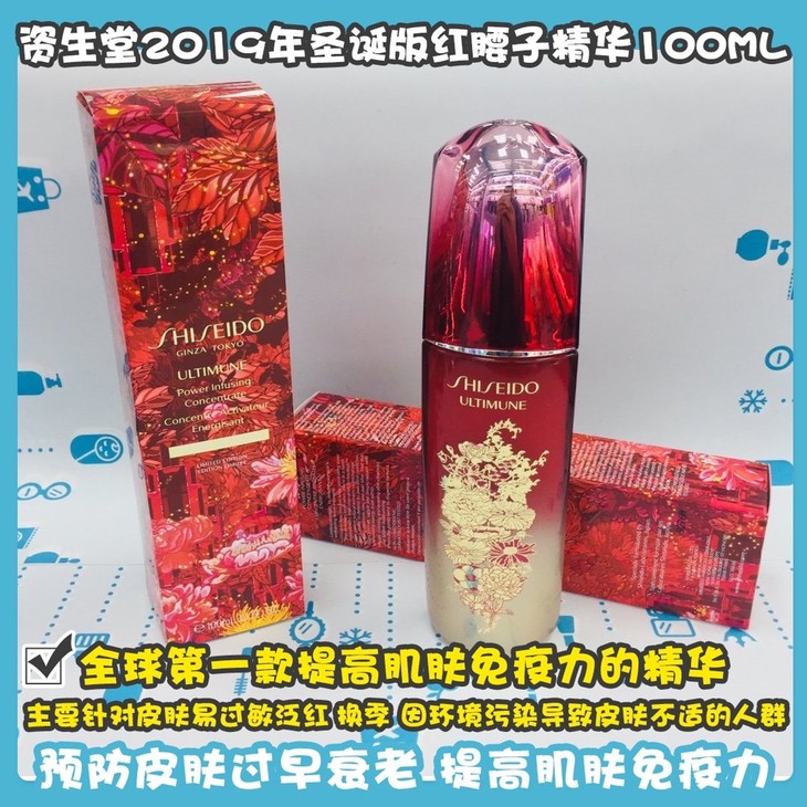资生堂2019年圣诞版红腰子精华100ML 👍作为全球第一款提高肌肤免疫力的精华,圣诞限量版怎么允许错过🎅!主要针对皮肤易过敏泛红❌,换季🍂或因环境污染导致皮肤不适的人群。通过抵御外界刺激,👊预防皮肤过早衰老。提高肌肤免疫力,☑改善红血丝、痘痘肌,修复毛孔,补水保湿💦令暗沉肤色散发自然光泽✨,并且能够抵抗紫外线与大气污染带给皮肤的负担☀。