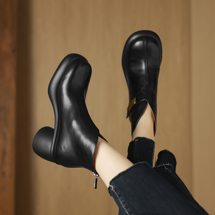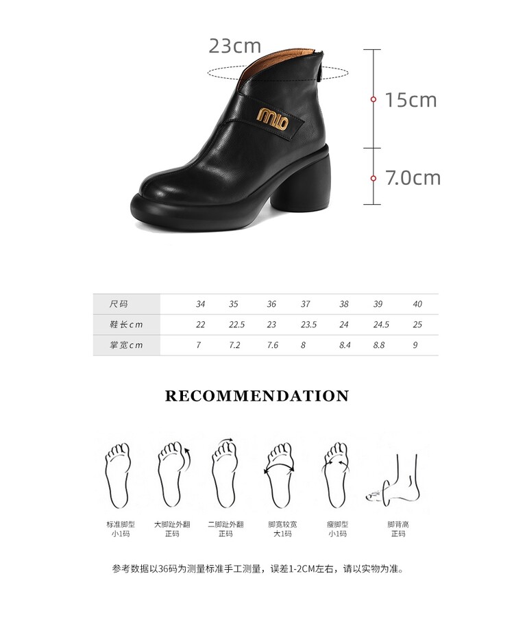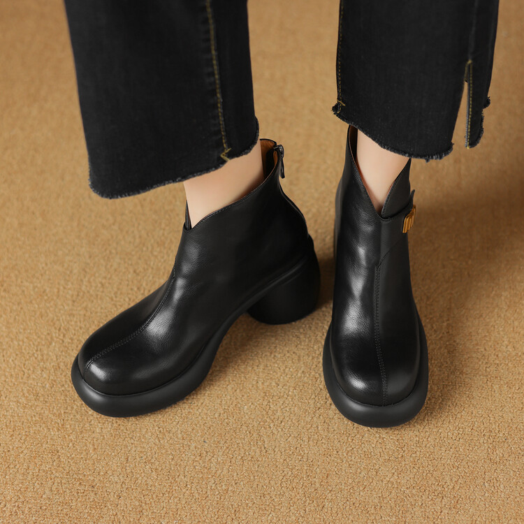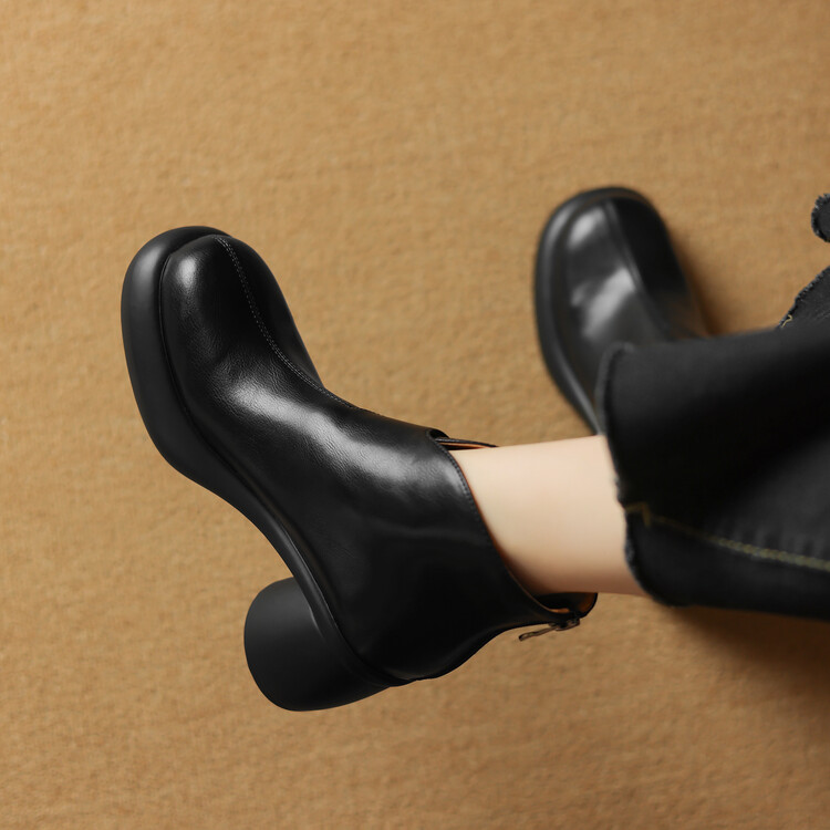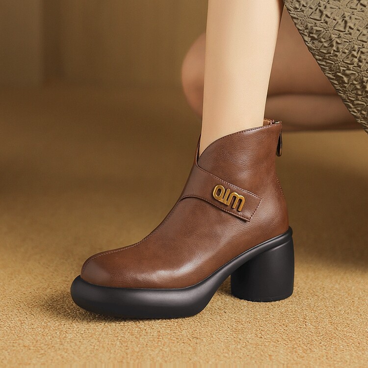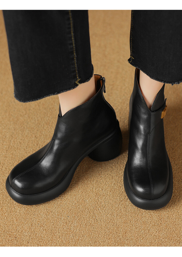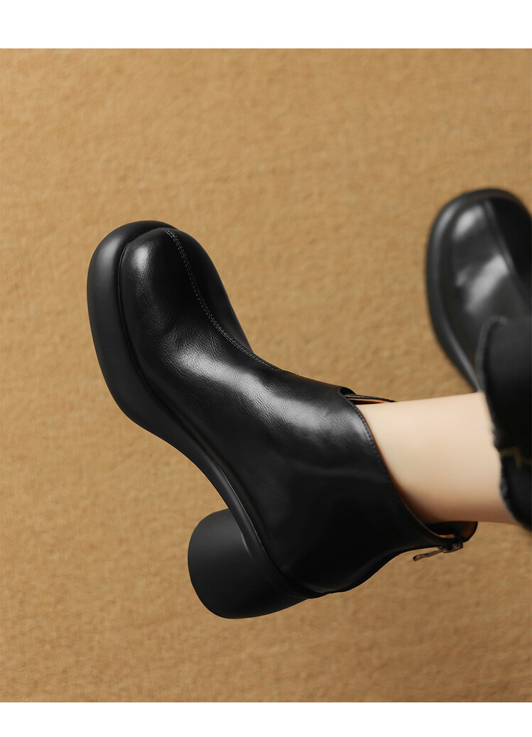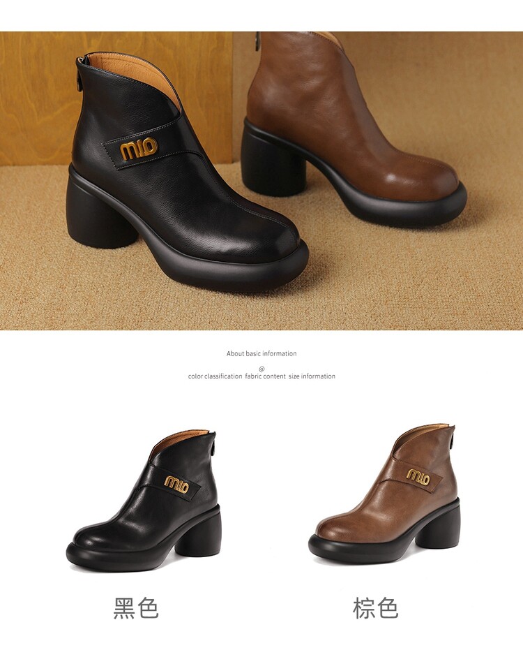 【预售5天】圆头粗跟短靴女冬季真皮,舒适短筒踝靴法式复古厚底高跟后拉链靴子DTN&X312-12