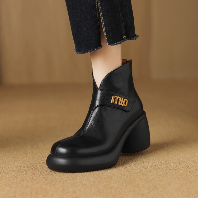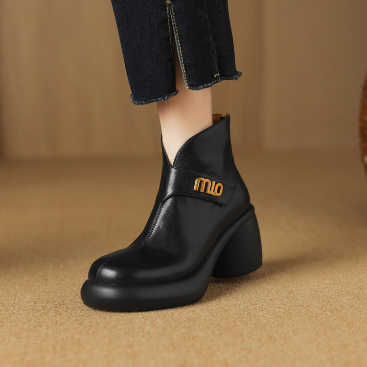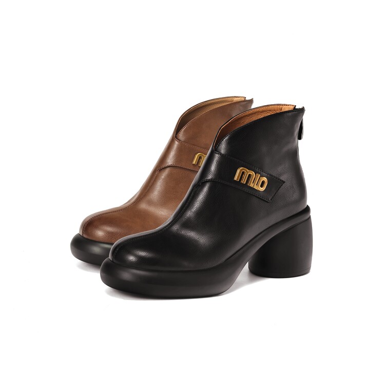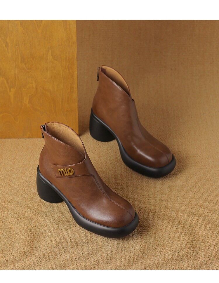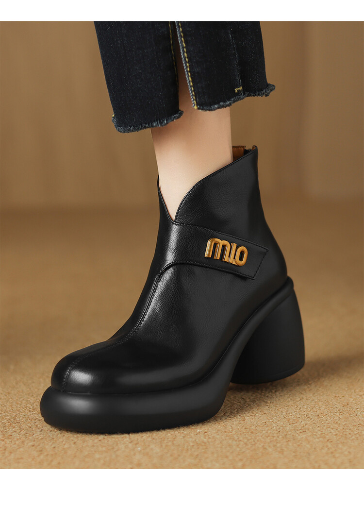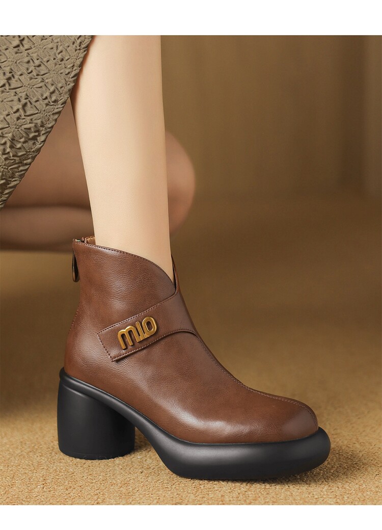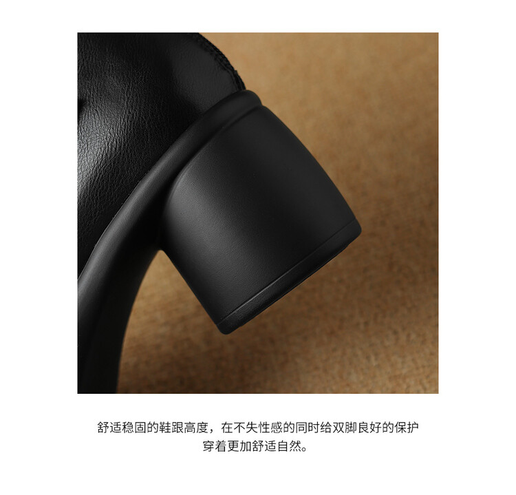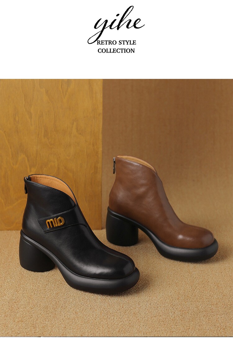 【预售5天】圆头粗跟短靴女冬季真皮,舒适短筒踝靴法式复古厚底高跟后拉链靴子DTN&X312-12