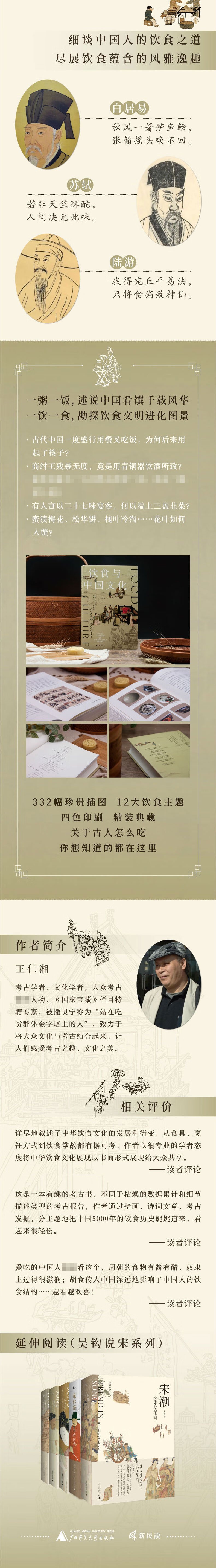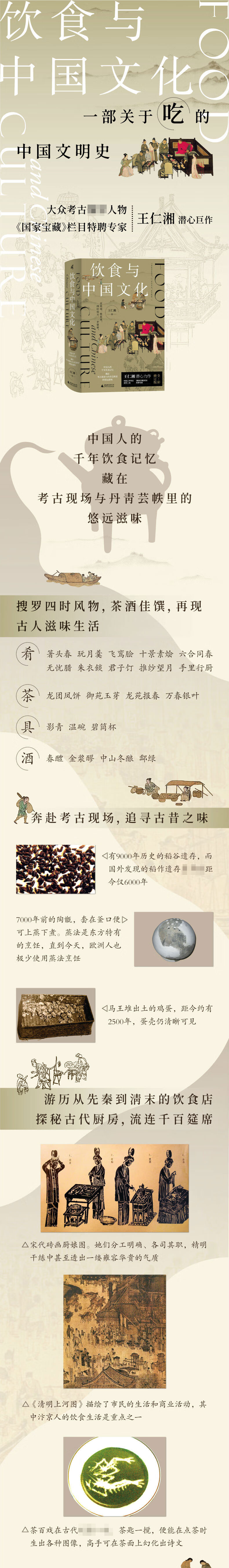 1.列数时令风物、诸方佳馔,再现古人有滋有味的饮食生活图景。“色同琥珀,又类真金,入口则消,状若凌雪”,“红白交错,恍如雪霁之霞”……记录食物达千种,或图示其形,或字释其味,甚至究其容器,解其命名,又细数种种烹饪技法,在纸上铺陈一场场饕餮盛宴,邀君入席。 2.到考古现场追溯先民饮食,探究中国饮食传统源流。“六畜”驯化于何时?古人使用怎样的炊具?为什么中国人选择了筷子而不是叉子?看我们习以为常的一粥一饭,如何与遥远往昔紧密关联。 3.古代食物蕴含了何等的巧思和情意?食物背后有哪些趣史逸闻?商纣王残暴无度,其实是用青铜器饮酒导致的?有人言以二十七味宴客,为何却端上三盘韭菜?让美食家苏轼称为“人间此味的”,竟然是一碗萝卜羹?大臣早上吃了几个鸡蛋,为何让乾隆羡慕不已? 4.何为至味?细述饮食在古人礼仪和日常生活中的重要地位,从对食物的重视和种种讲究中,看饮食之道对中国人气质和性情的深刻影响。 5.揭开尘封文物里的历史细节,感受中华文明千年饮食智慧。饮食文化藏在李白、苏轼的诗文中,藏在重见天日的文物中,藏在流传至今的饮食习惯中,作者在书中通过食之味、食之时、食之人、食之具、食之艺、食之礼、食之功等一一展现。饮食跨越千年,仍能激起现代人的味觉,它展现出几千年人们生活的图景,以及人类文明进化的脉络。中华民族千年的智慧,也蕴藏在吃里,随着滋味飘散而来。
