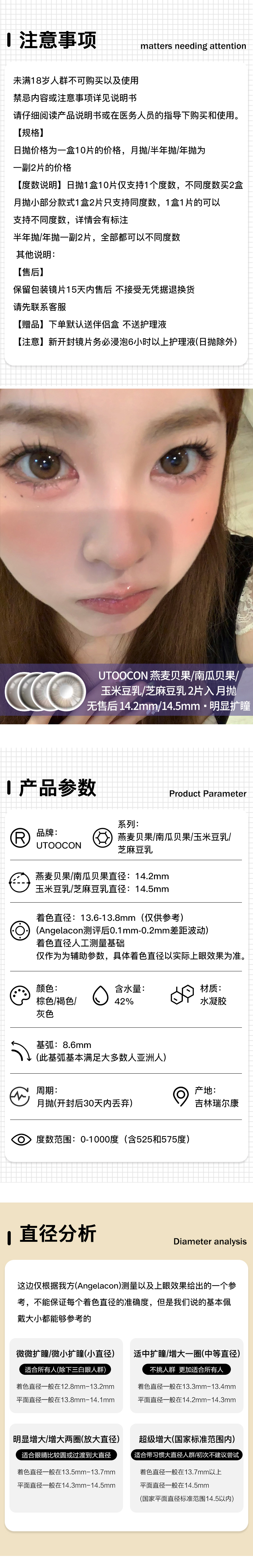 UTOOCON / 美瞳月抛 / 燕麦贝果/南瓜贝果/玉米豆乳/芝麻豆乳 / 2片入 / 14.2mm-14.5mm /明显扩瞳