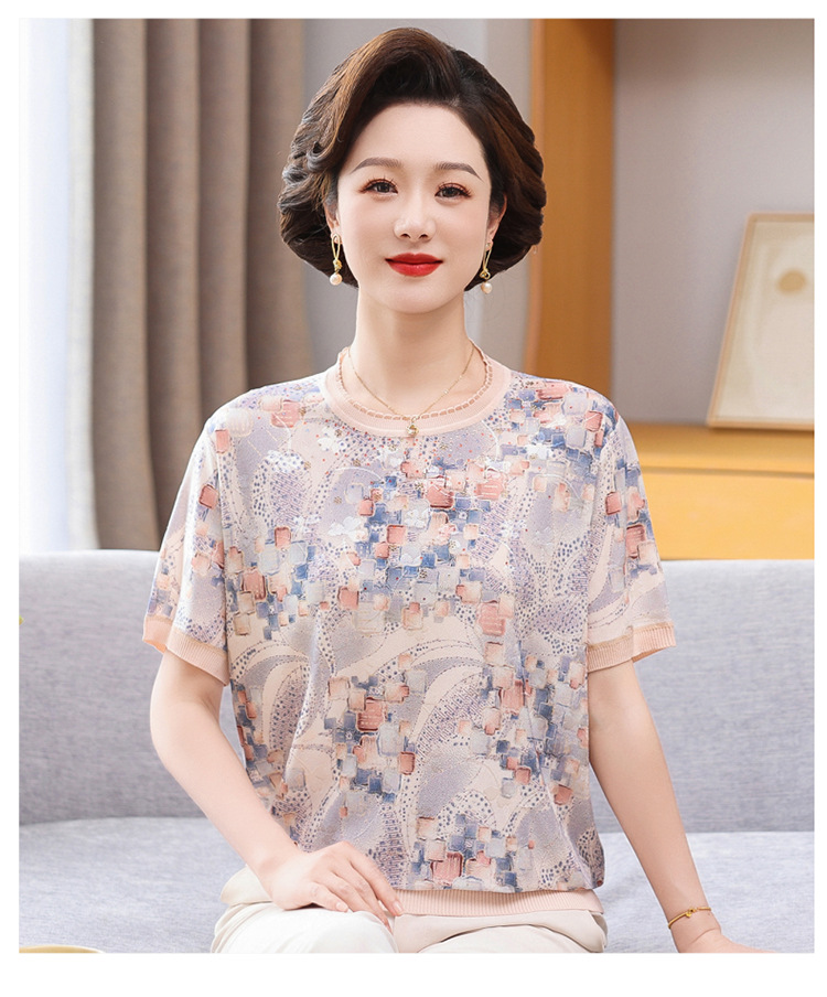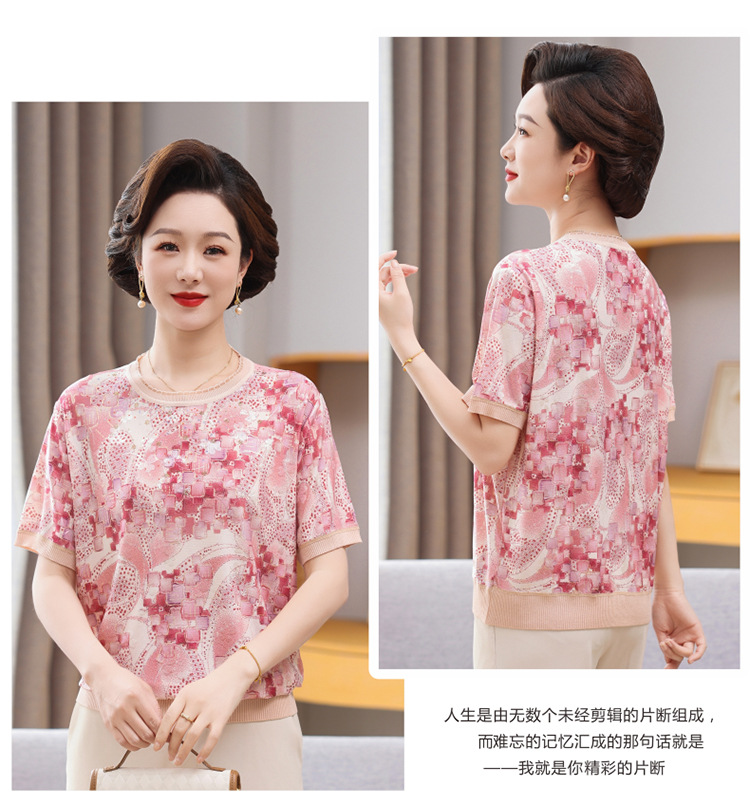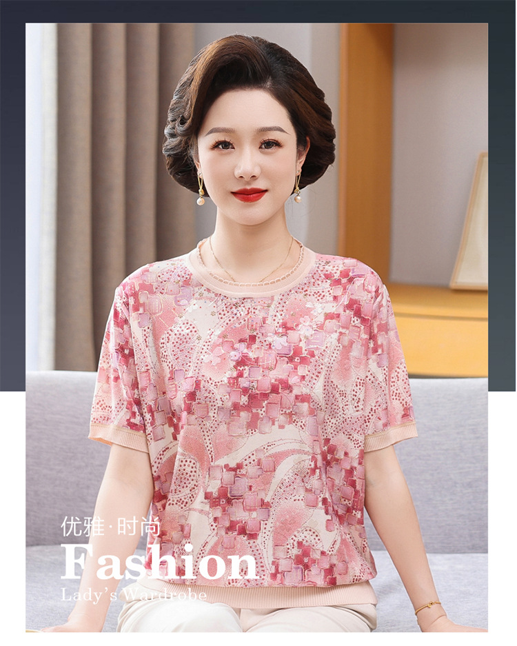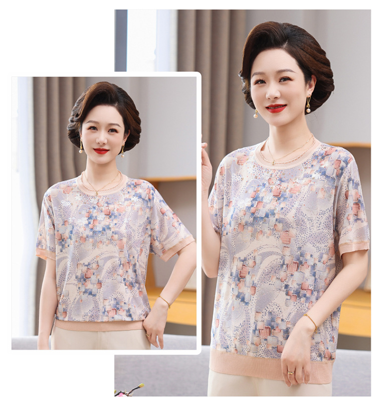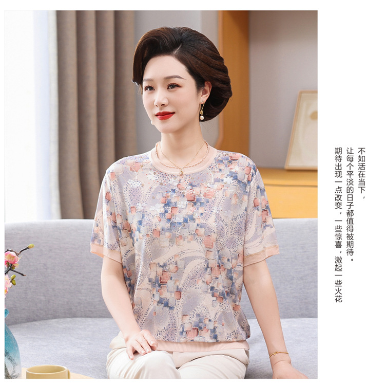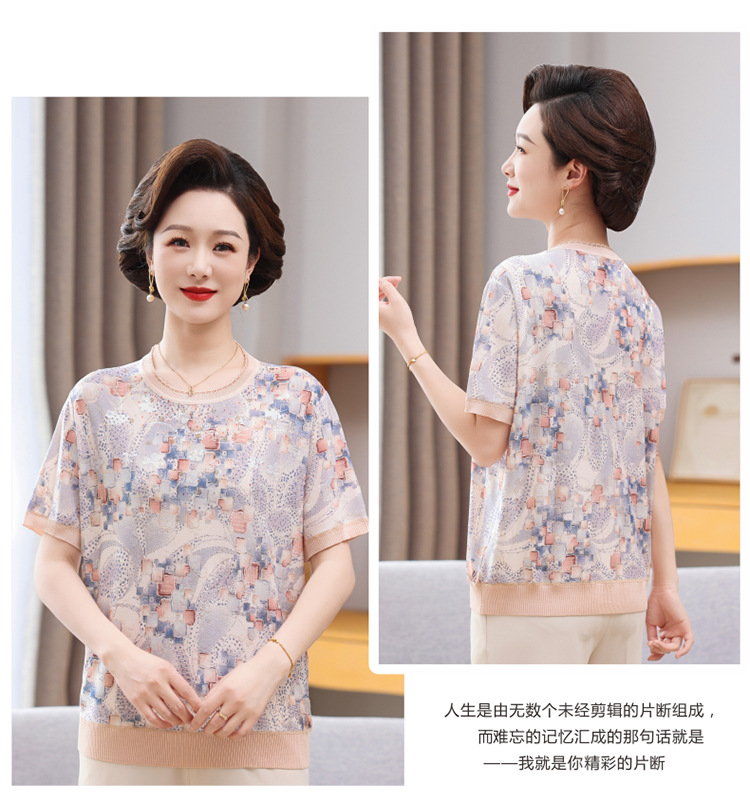 W052-2531-65-108时尚妈妈夏装新款高档冰丝小衫宽松上衣中老年女装洋气短袖T恤衫