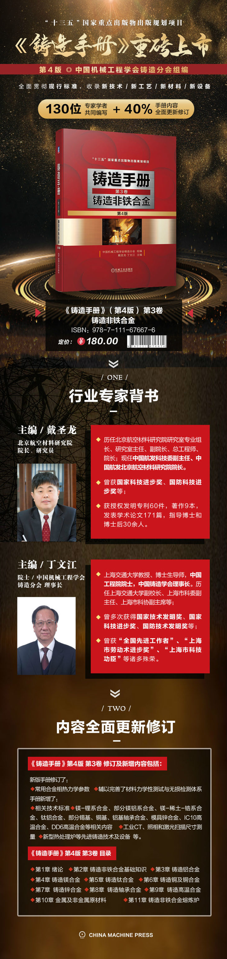 《铸造手册》第3版出版后的近10年来,科学技术发展迅猛,先进制造技术不断涌现,技术标准及工艺参数不断更新和扩充,我国经济已由高速增长阶段转向高质量发展阶段,铸造行业的产品及技术结构发生了很大变化和提升,铸造生产节能环保要求不断提高,第3版手册的部分内容已不能适应当前铸造生产实际及技术发展的需要。