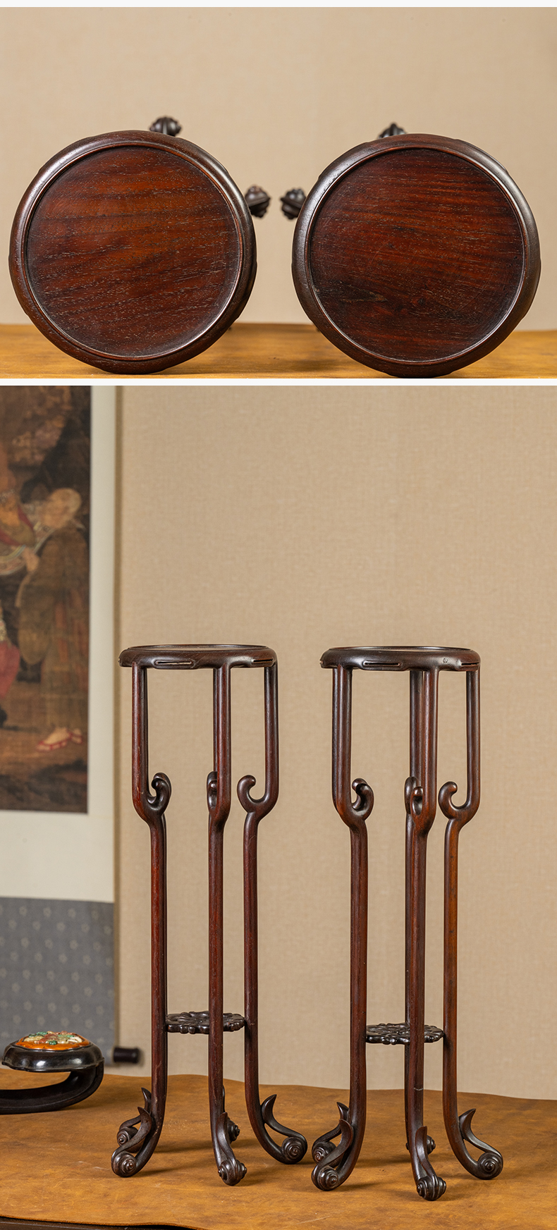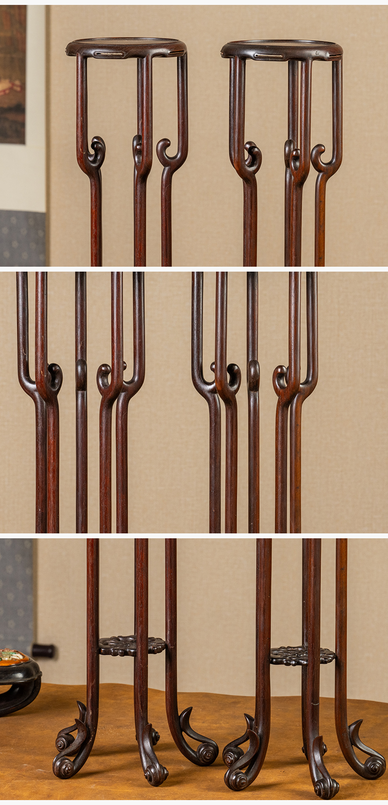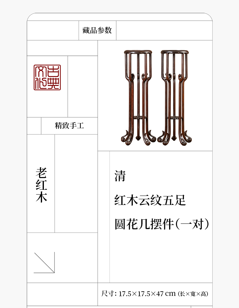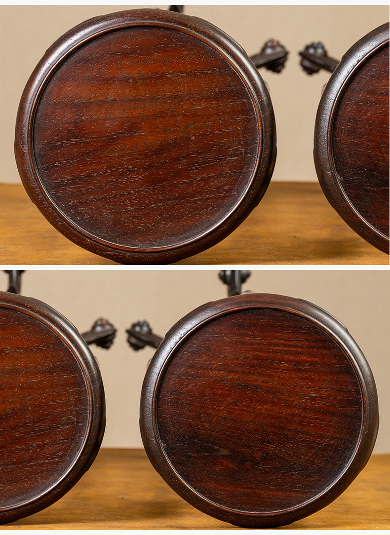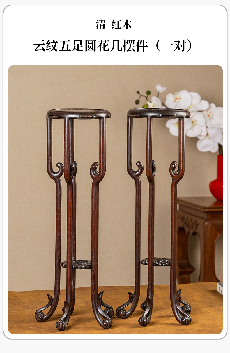 清 红木云纹五足圆花几摆件(一对)