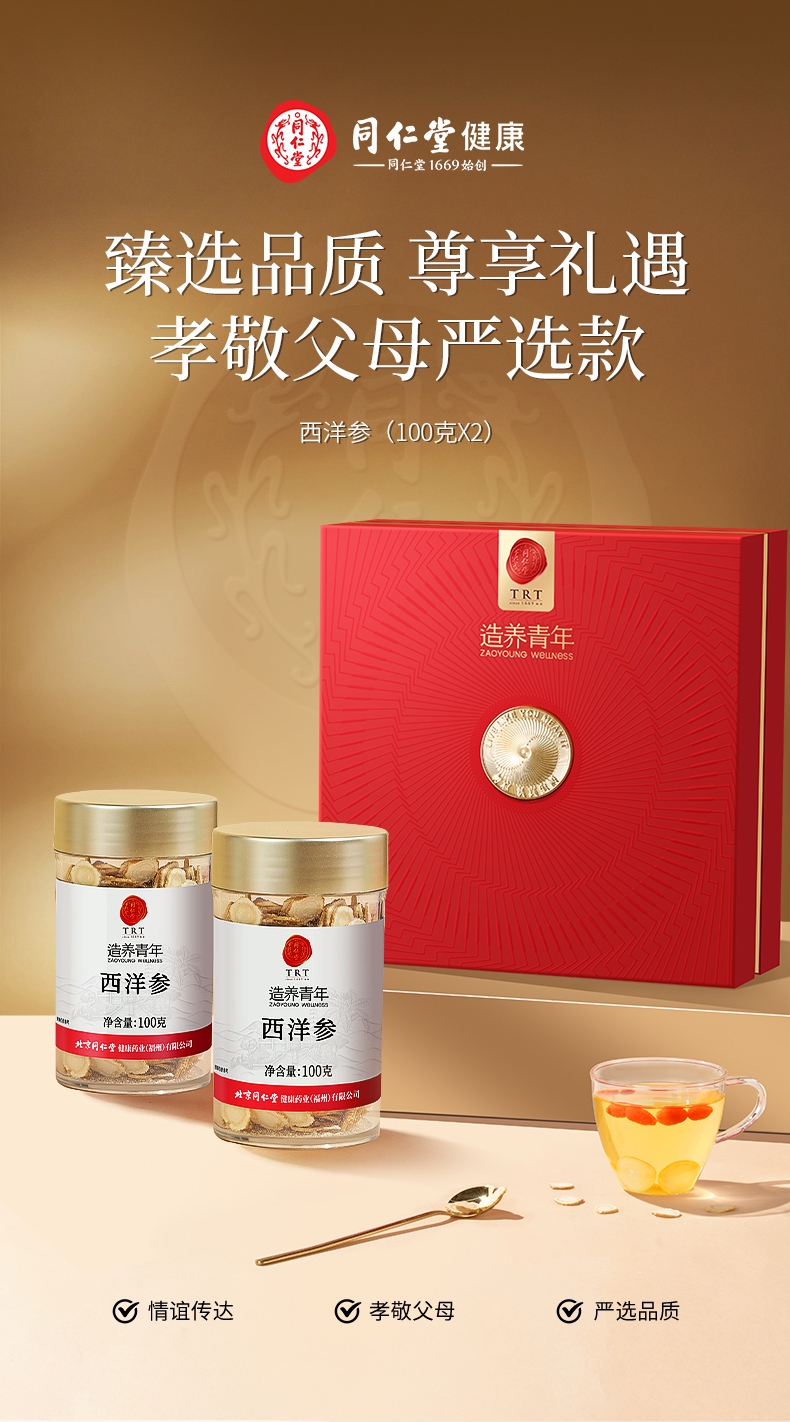 【正宗同仁堂品牌】北京同仁堂 国产西洋参金标款200克礼盒(100g*2瓶)1.4-1.8圆切厚片 参香味浓营养丰富SY