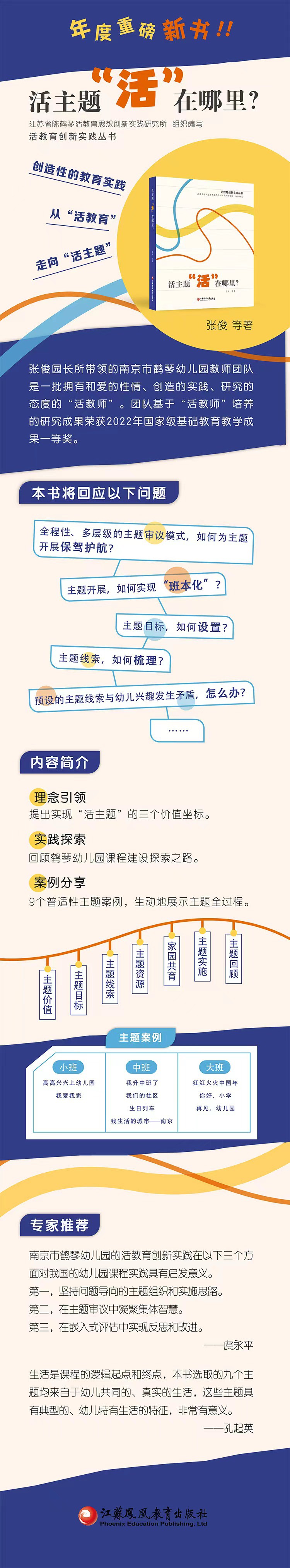 本书是江苏省陈鹤琴活教育思想创新实践研究所组织编写的“活教育创新实践丛书”的第一本,其创作主体是张俊园长所带领的南京市鹤琴幼儿园的一批“活教师”,他们基于“活教育”理念开展“活主题”研究,提出了实现“活主题”的三个价值坐标,分享了9个具有普适性的主题案例,生动展示了“活主题”的生发、审议、实施,以及评估与反思的全过程。