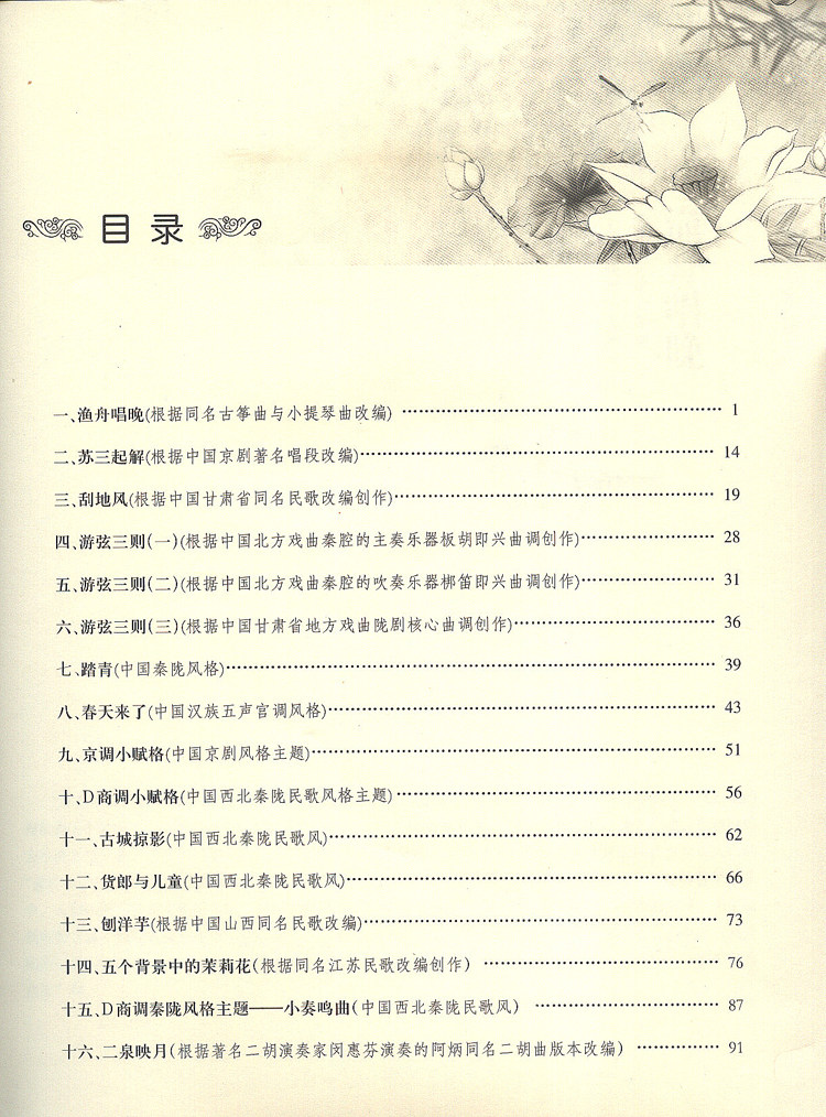 本曲集是深圳大学艺术系的校级科研课题“中国民族音乐钢琴教程体系的研究与构建”的成果之一。该研究力图把目标定位在中国戏剧、民歌、说唱等题材音乐的改编创作上,创新但不脱离中国民族乐思的风格特征。本曲集为第一集,基本上以秦陇风格或京剧为主。曲目包括《渔舟唱晚》《踏青》《刨洋芋》《二泉映月》等,每首曲子均附有作品赏析。