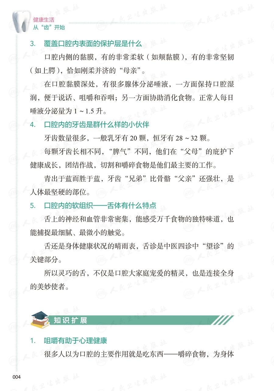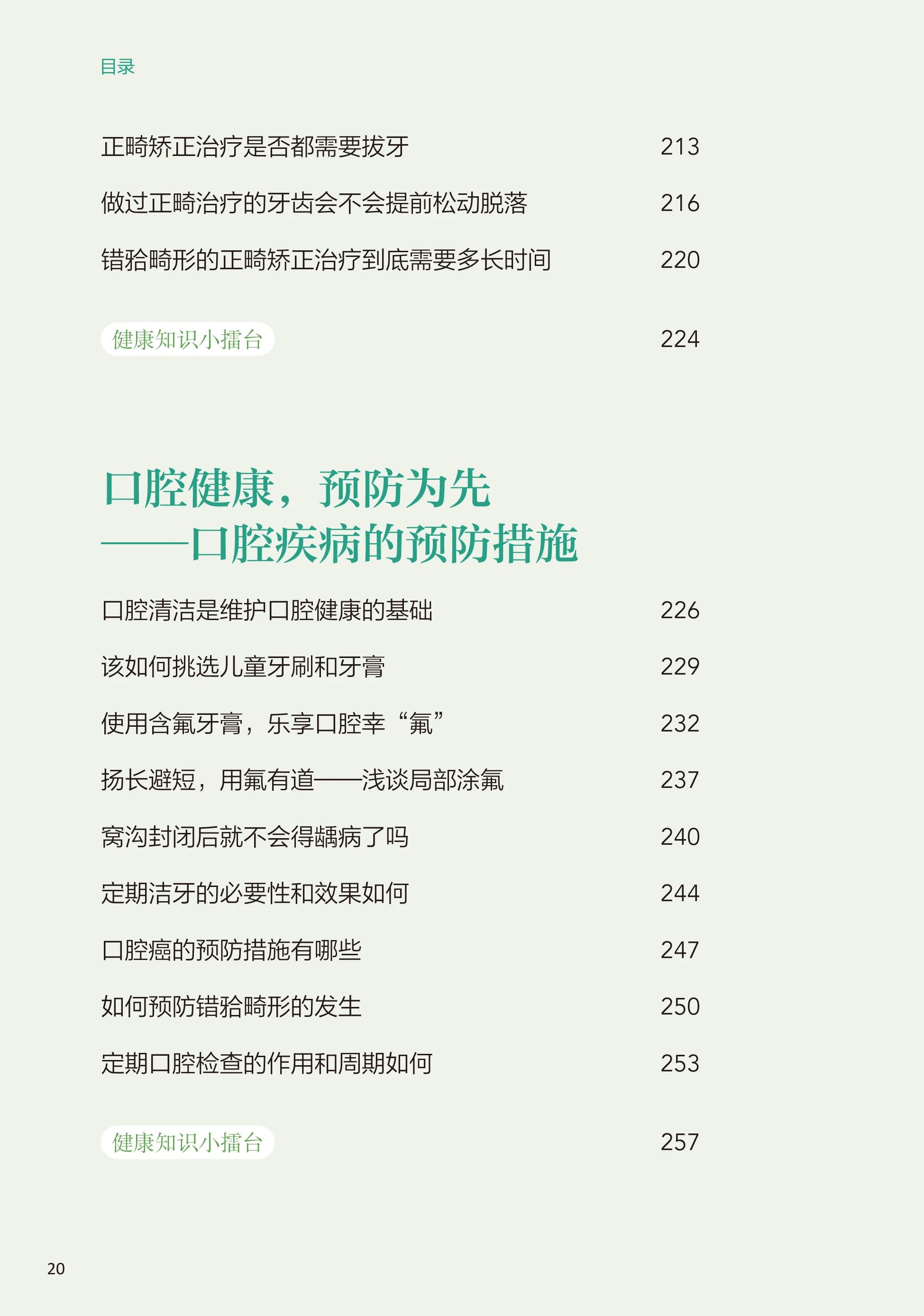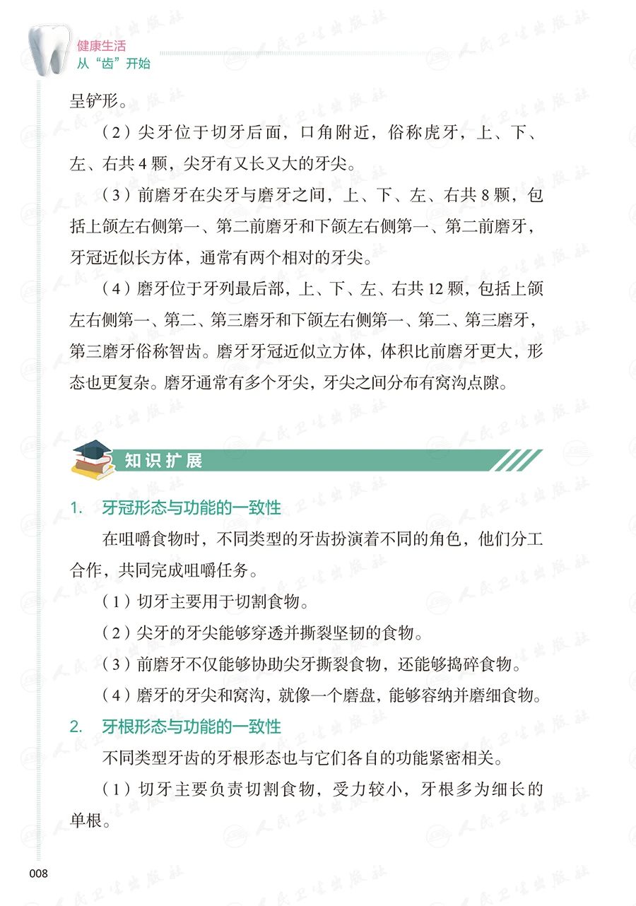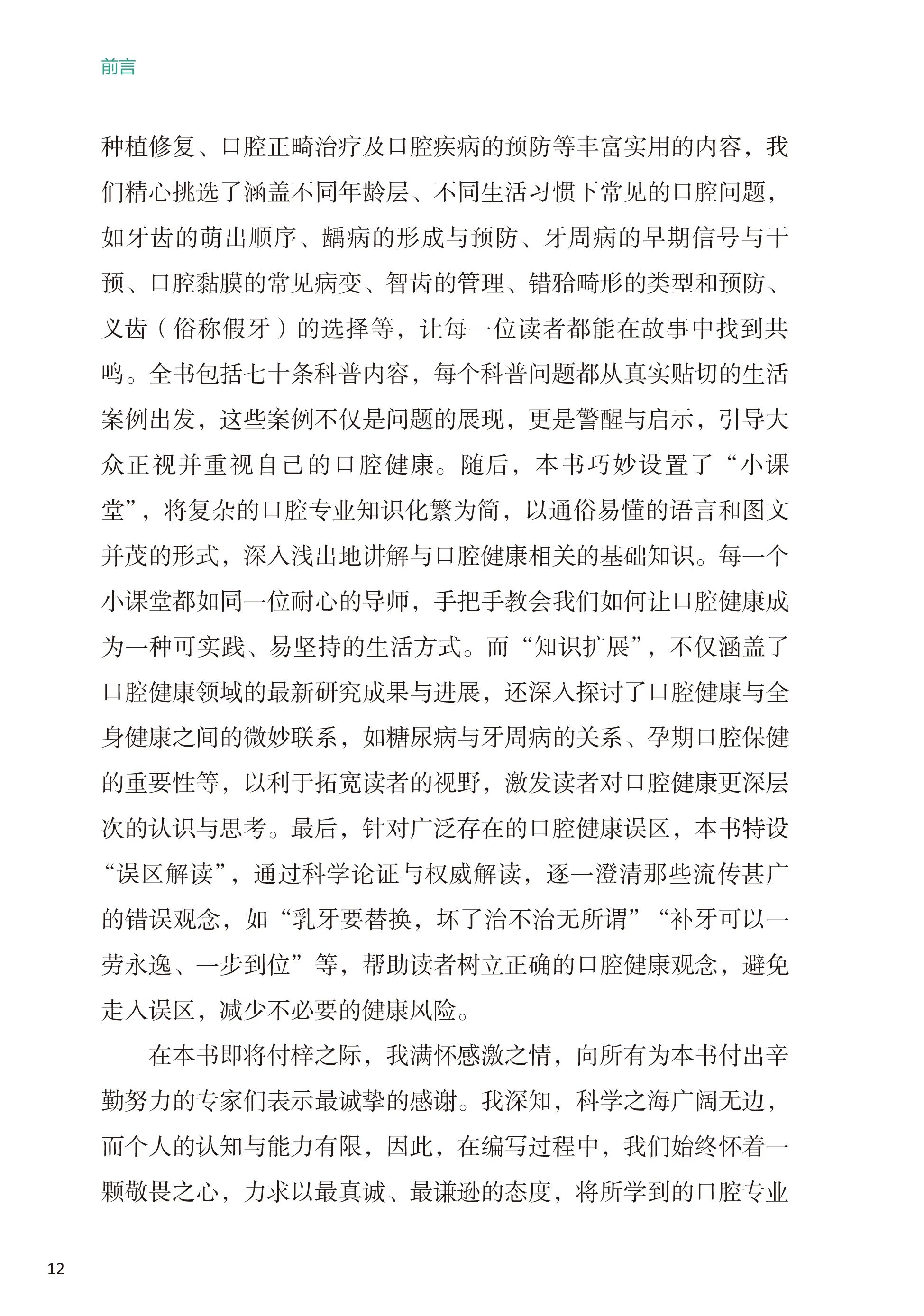 《健康生活,从“齿”开始》是“健康中国·你我同行”系列科普读物的又一新作。这部覆盖全生命周期的口腔健康百科全书,通过10章、70个知识点构建口腔健康的完整科普体系,系统解析口腔结构、疾病预防与治疗,从乳牙护理到种植修复,从日常牙齿保健到正畸美学需求,深度剖析牙体、黏膜、颌面等常见问题,创新性地将疾病治疗与预防体系相结合,通过场景化案例引发读者对口腔健康的关心关注,收获科学认知。