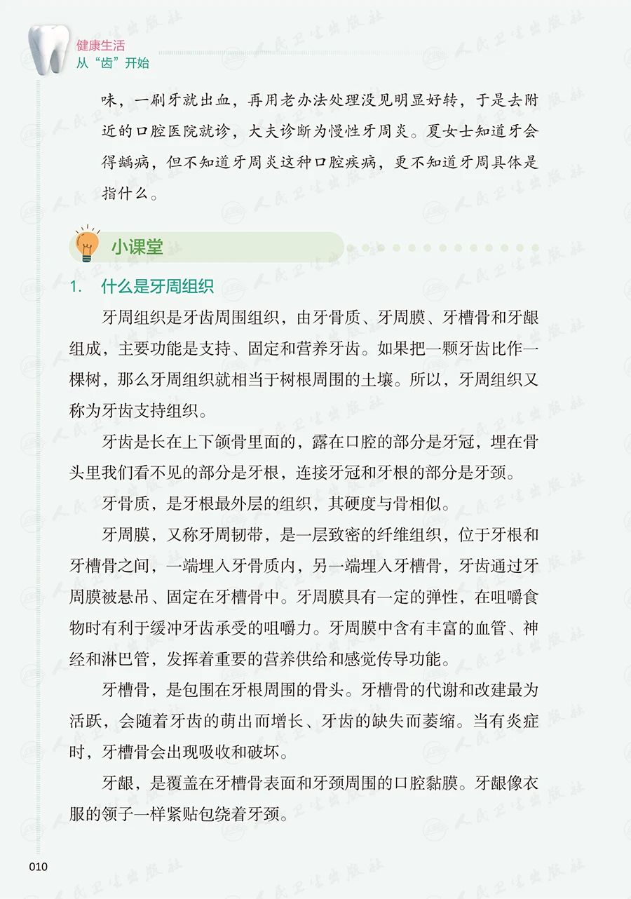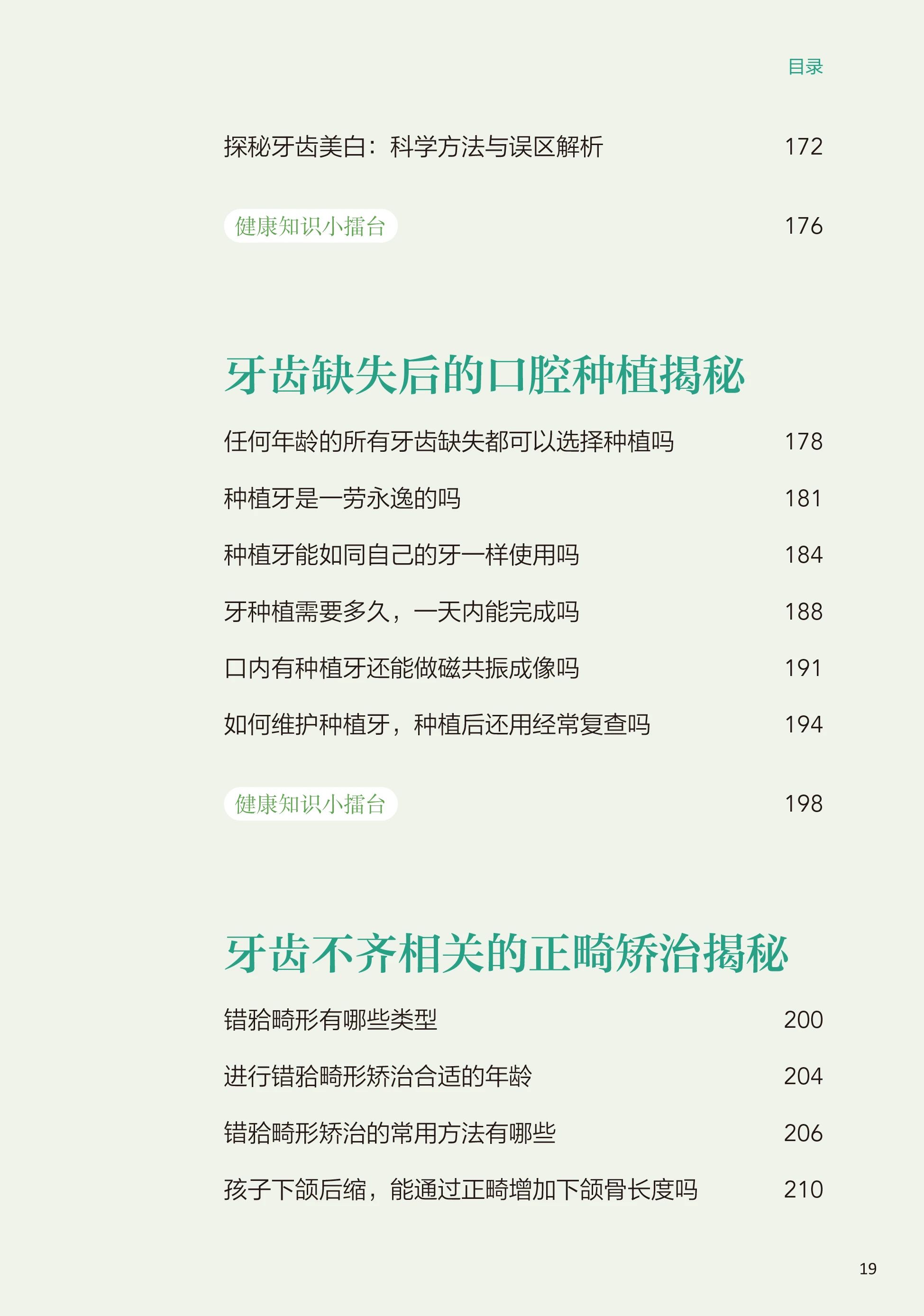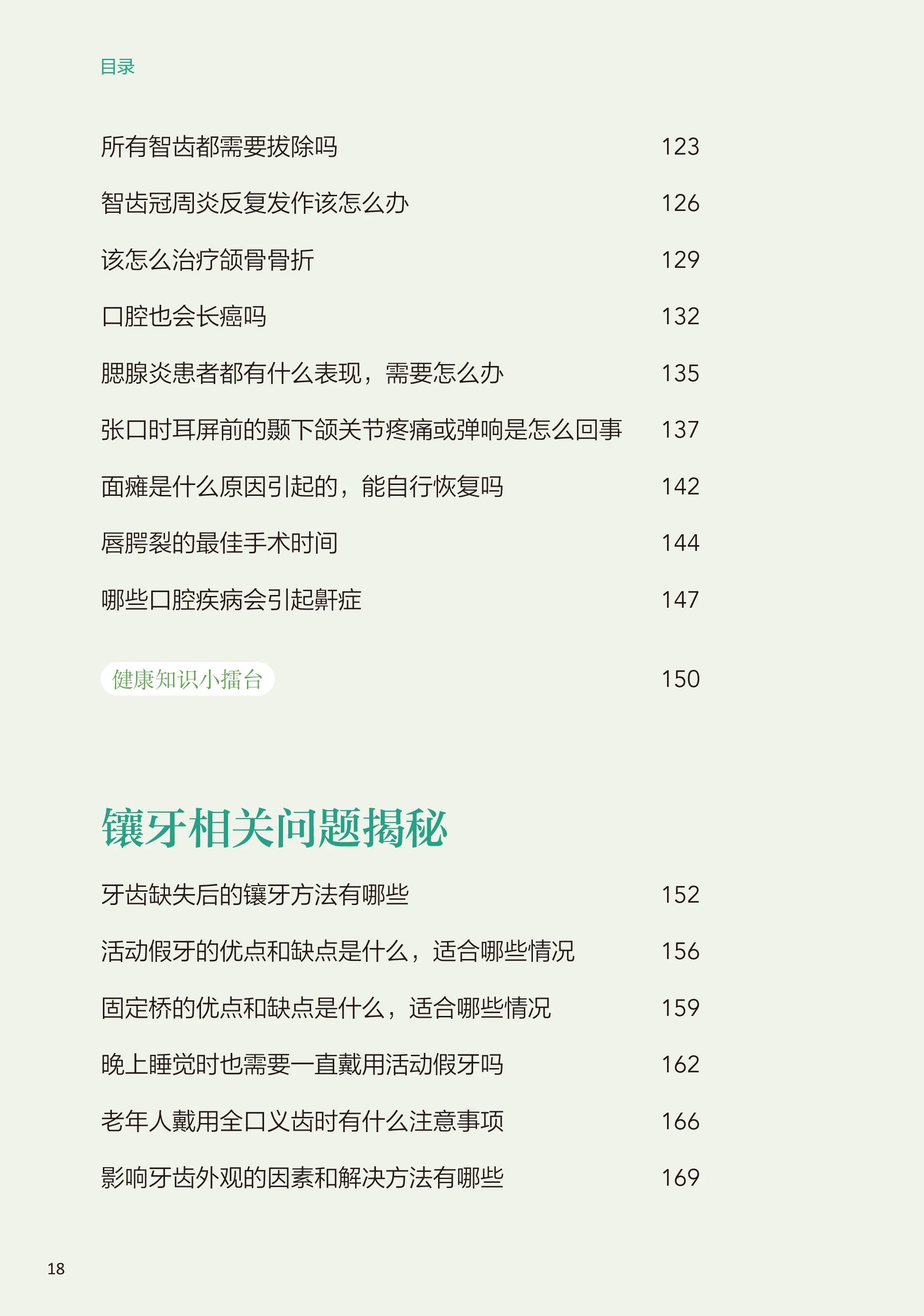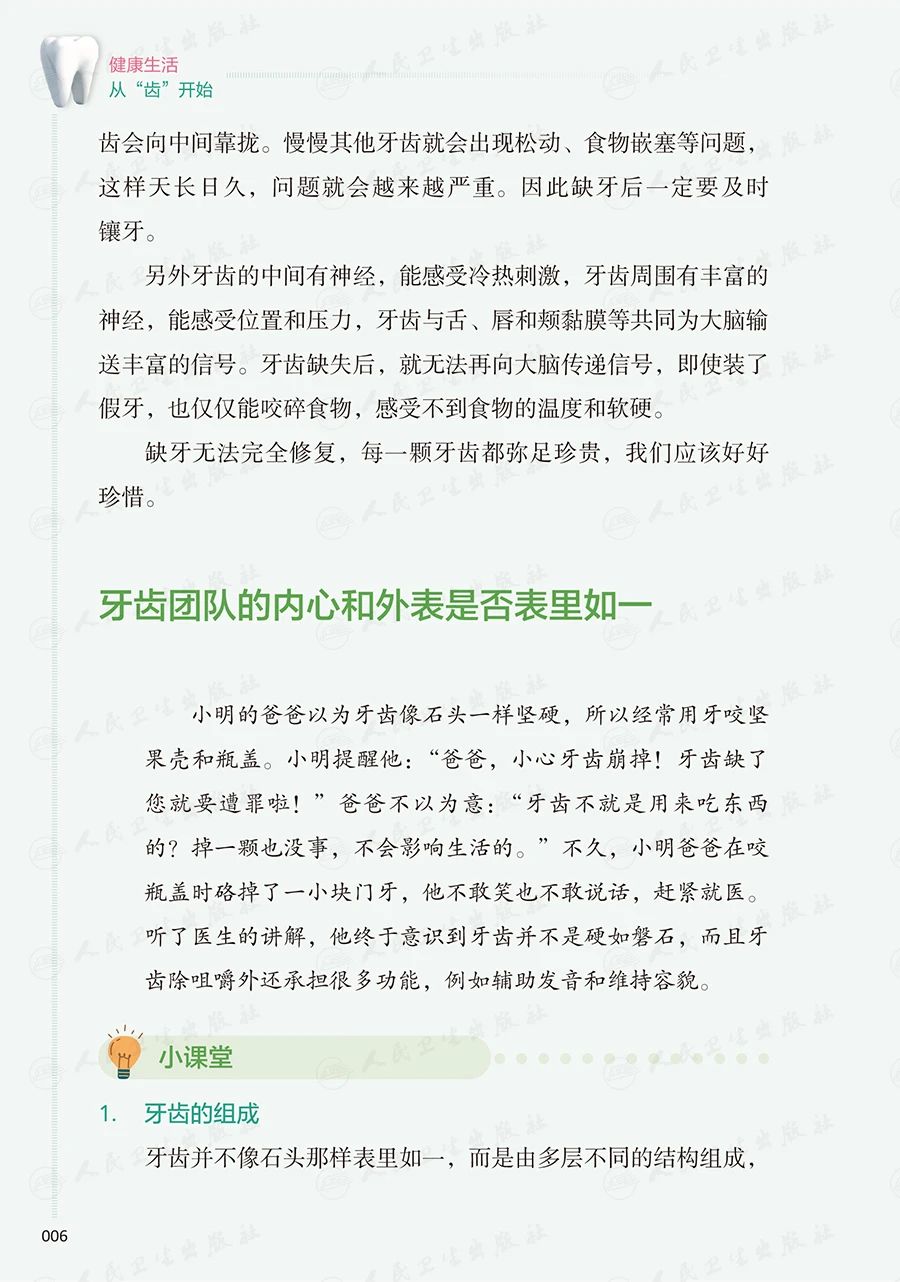 《健康生活,从“齿”开始》是“健康中国·你我同行”系列科普读物的又一新作。这部覆盖全生命周期的口腔健康百科全书,通过10章、70个知识点构建口腔健康的完整科普体系,系统解析口腔结构、疾病预防与治疗,从乳牙护理到种植修复,从日常牙齿保健到正畸美学需求,深度剖析牙体、黏膜、颌面等常见问题,创新性地将疾病治疗与预防体系相结合,通过场景化案例引发读者对口腔健康的关心关注,收获科学认知。