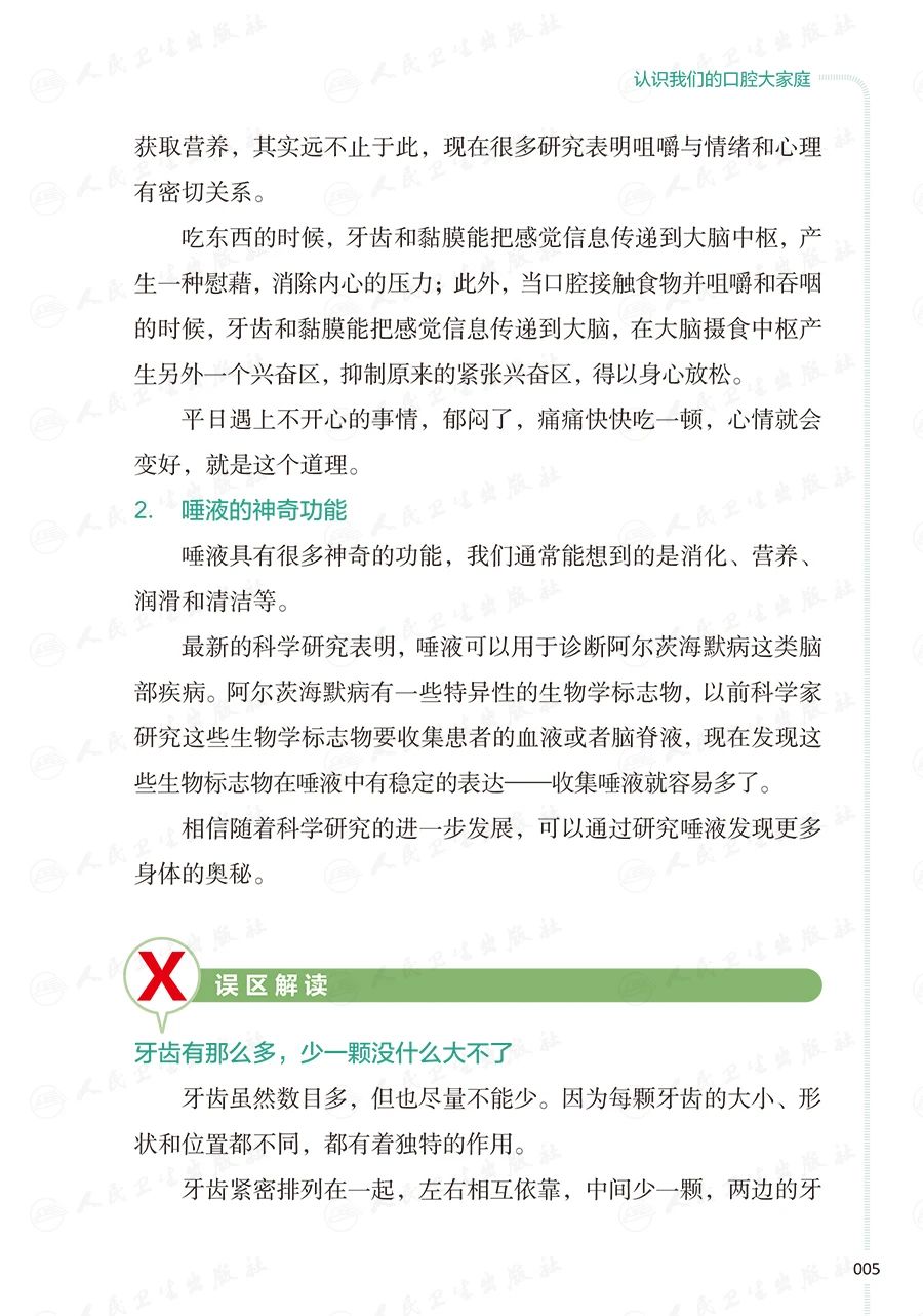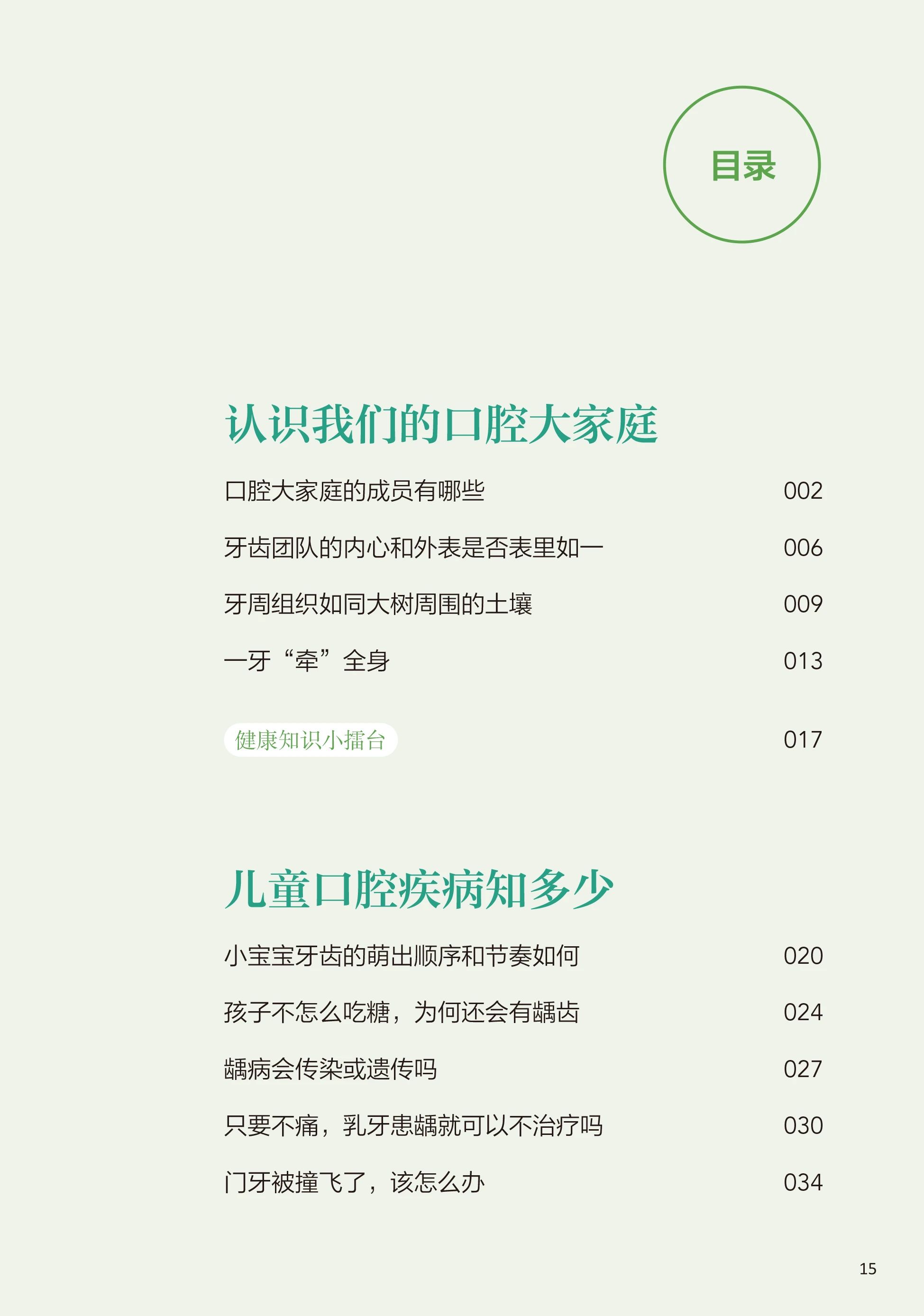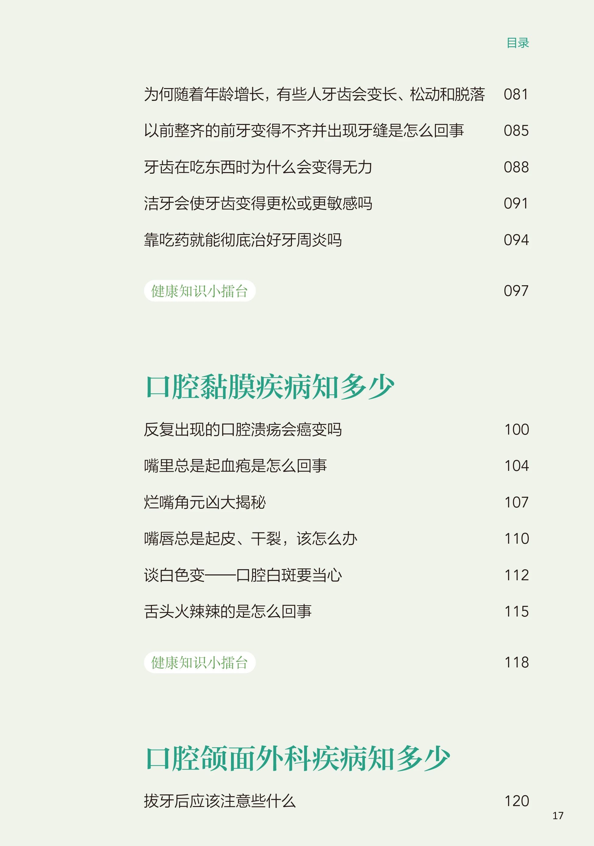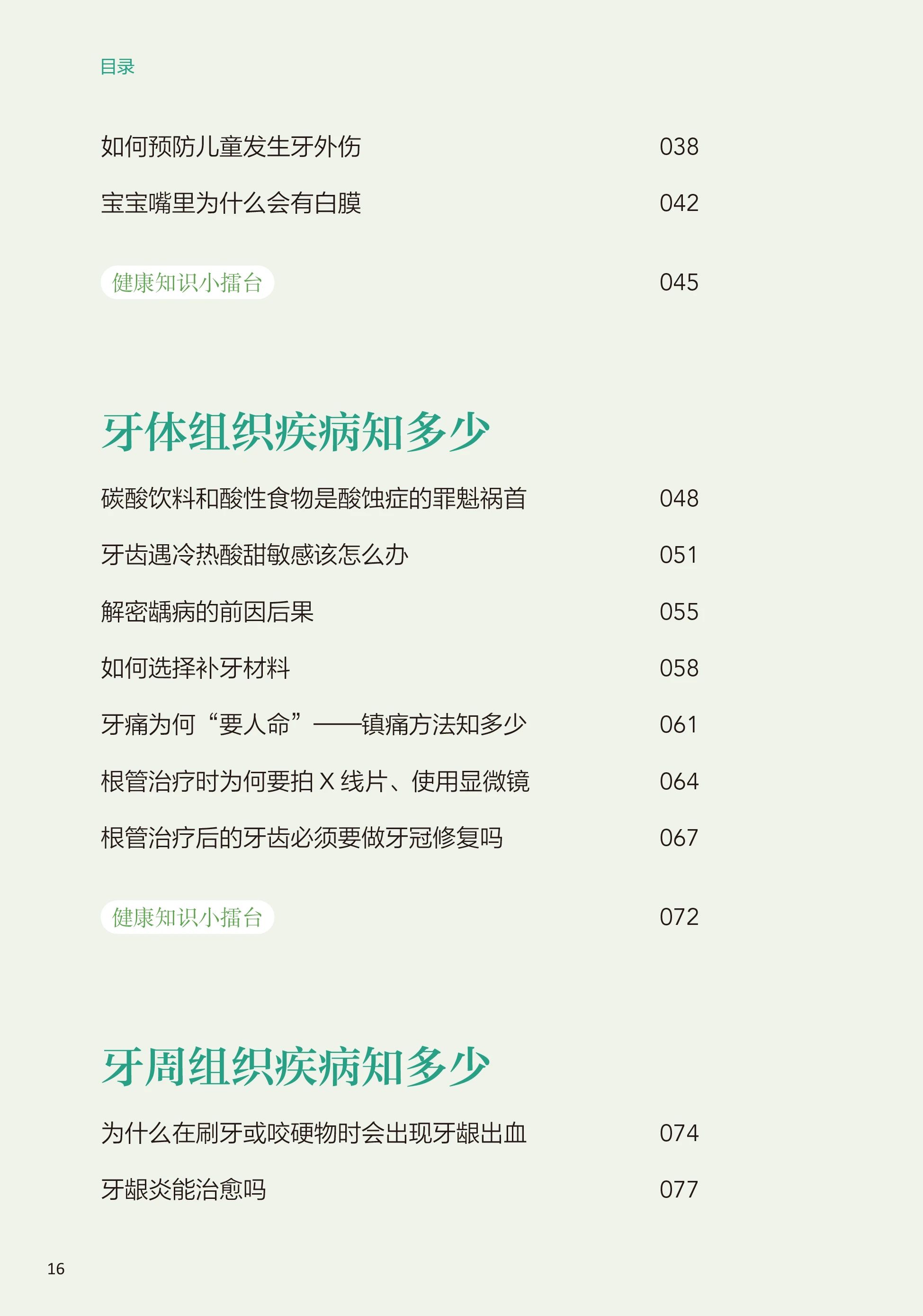 《健康生活,从“齿”开始》是“健康中国·你我同行”系列科普读物的又一新作。这部覆盖全生命周期的口腔健康百科全书,通过10章、70个知识点构建口腔健康的完整科普体系,系统解析口腔结构、疾病预防与治疗,从乳牙护理到种植修复,从日常牙齿保健到正畸美学需求,深度剖析牙体、黏膜、颌面等常见问题,创新性地将疾病治疗与预防体系相结合,通过场景化案例引发读者对口腔健康的关心关注,收获科学认知。