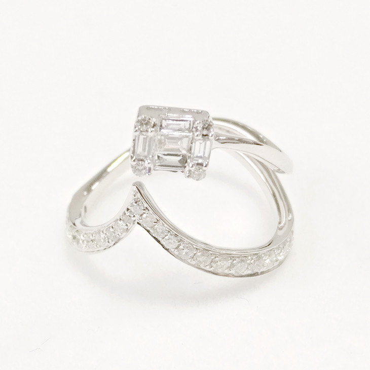 天然长方形切割钻石采用幻觉及光晕拼接镶嵌,方形钻石与下方尖形钻石戒臂相呼应,是一枚既有设计感,性价比又极高的钻石戒指。