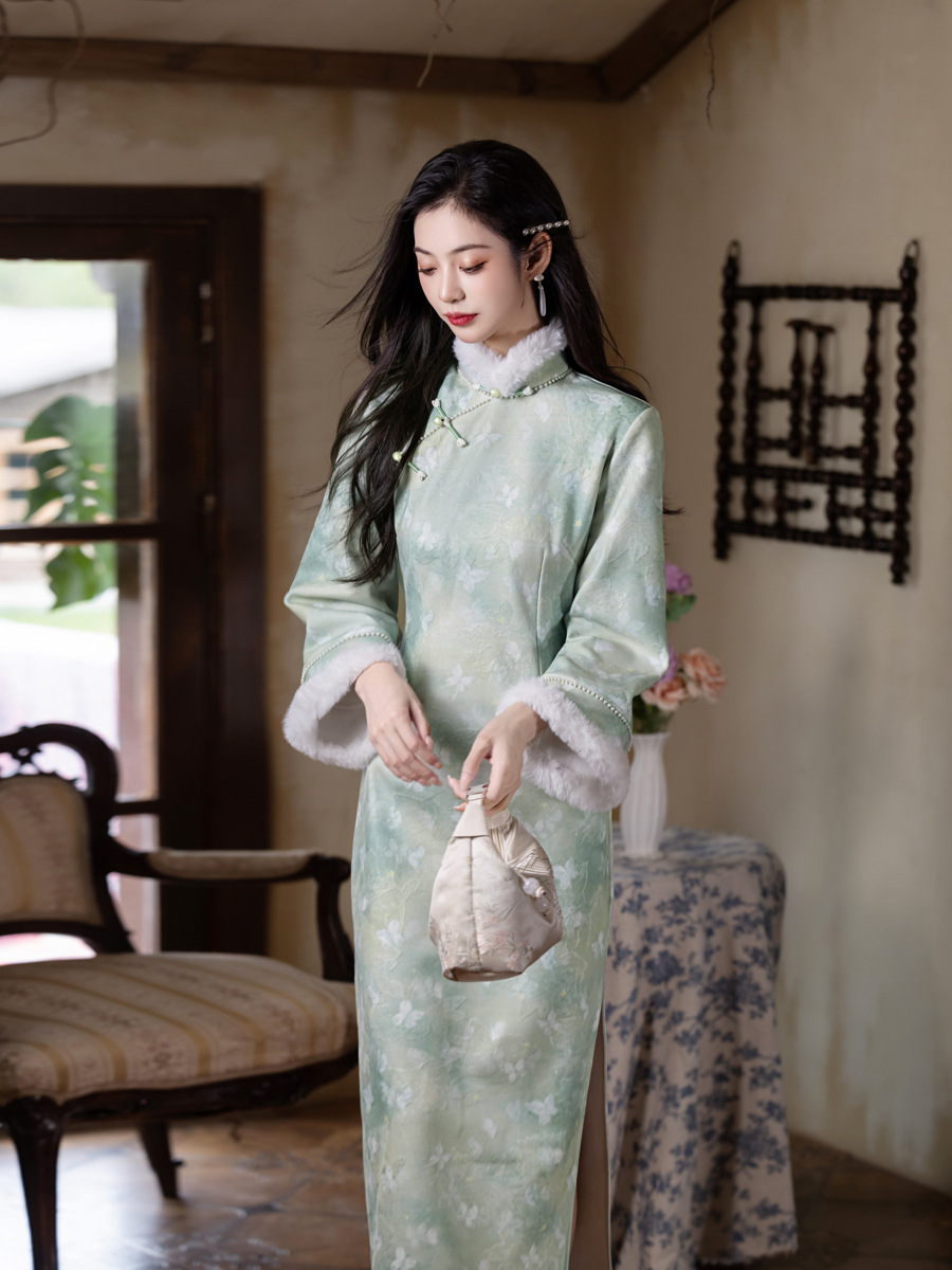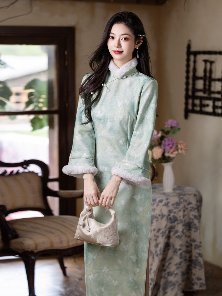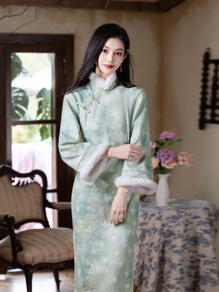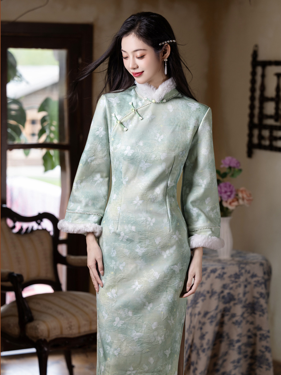 MYJ 绿色加绒加厚国风新中式长袖改良旗袍 商品图0