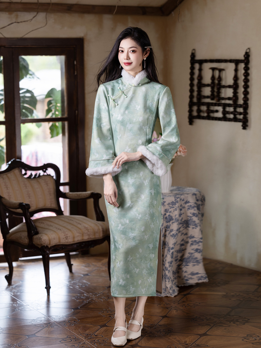 MYJ 绿色加绒加厚国风新中式长袖改良旗袍 商品图1