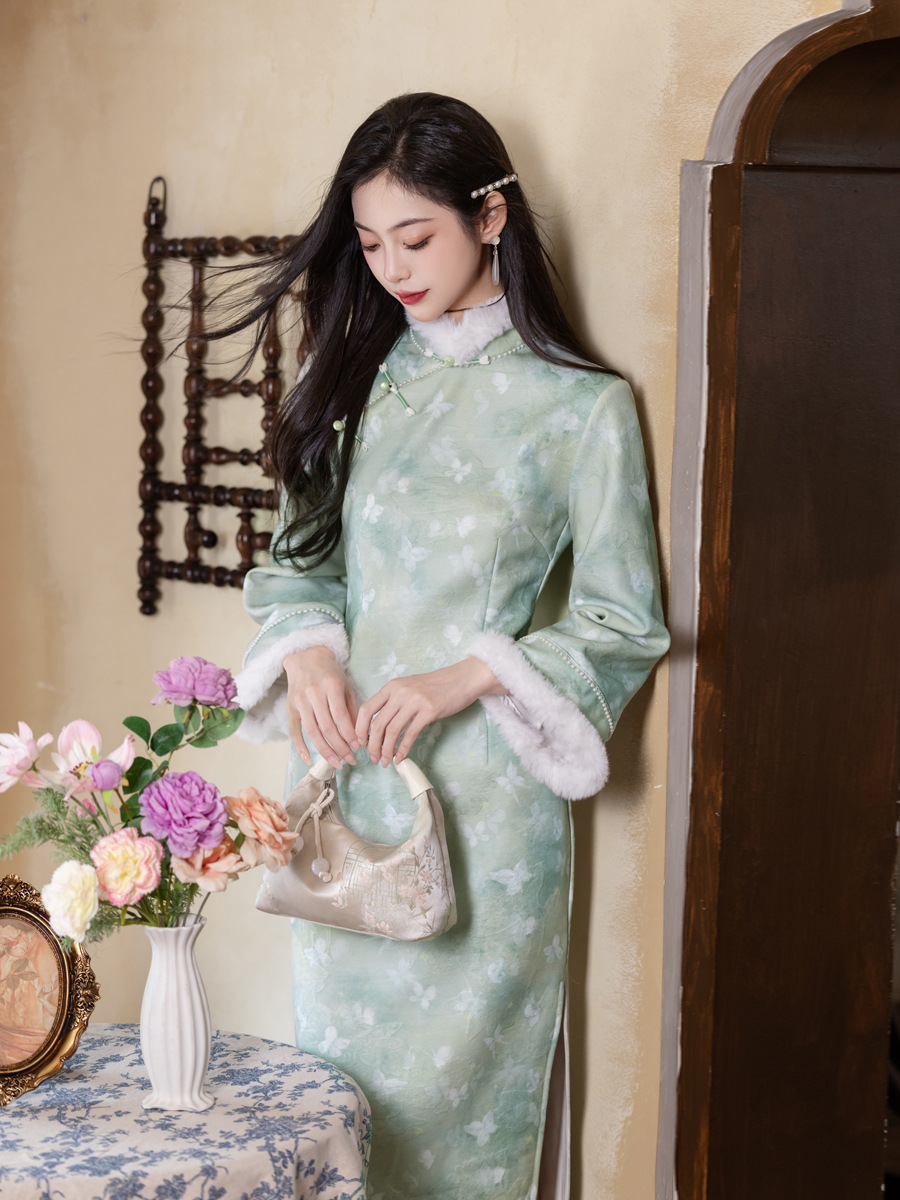 MYJ 绿色加绒加厚国风新中式长袖改良旗袍 商品图3