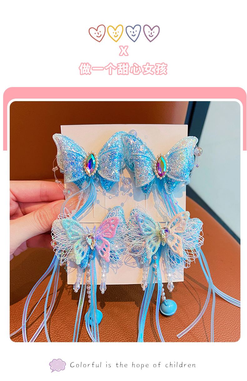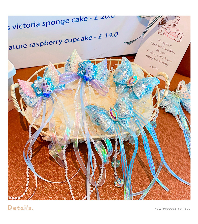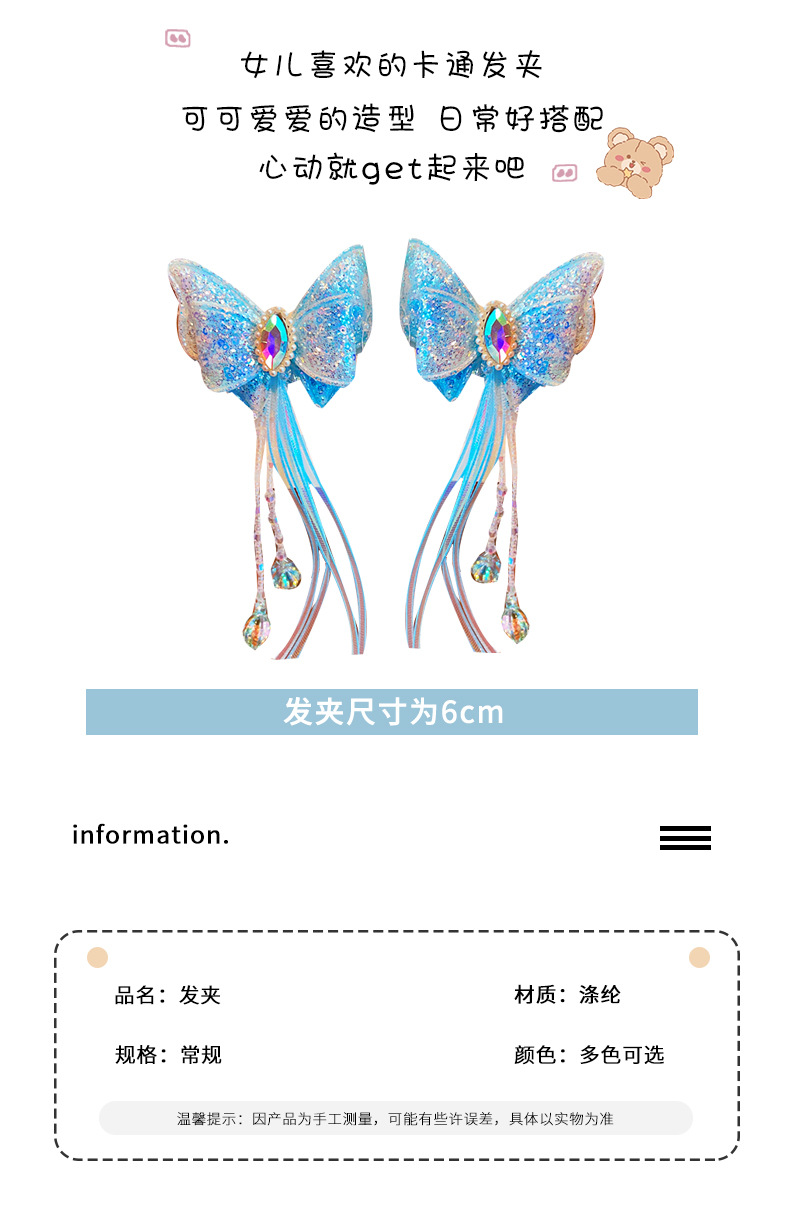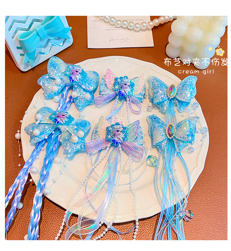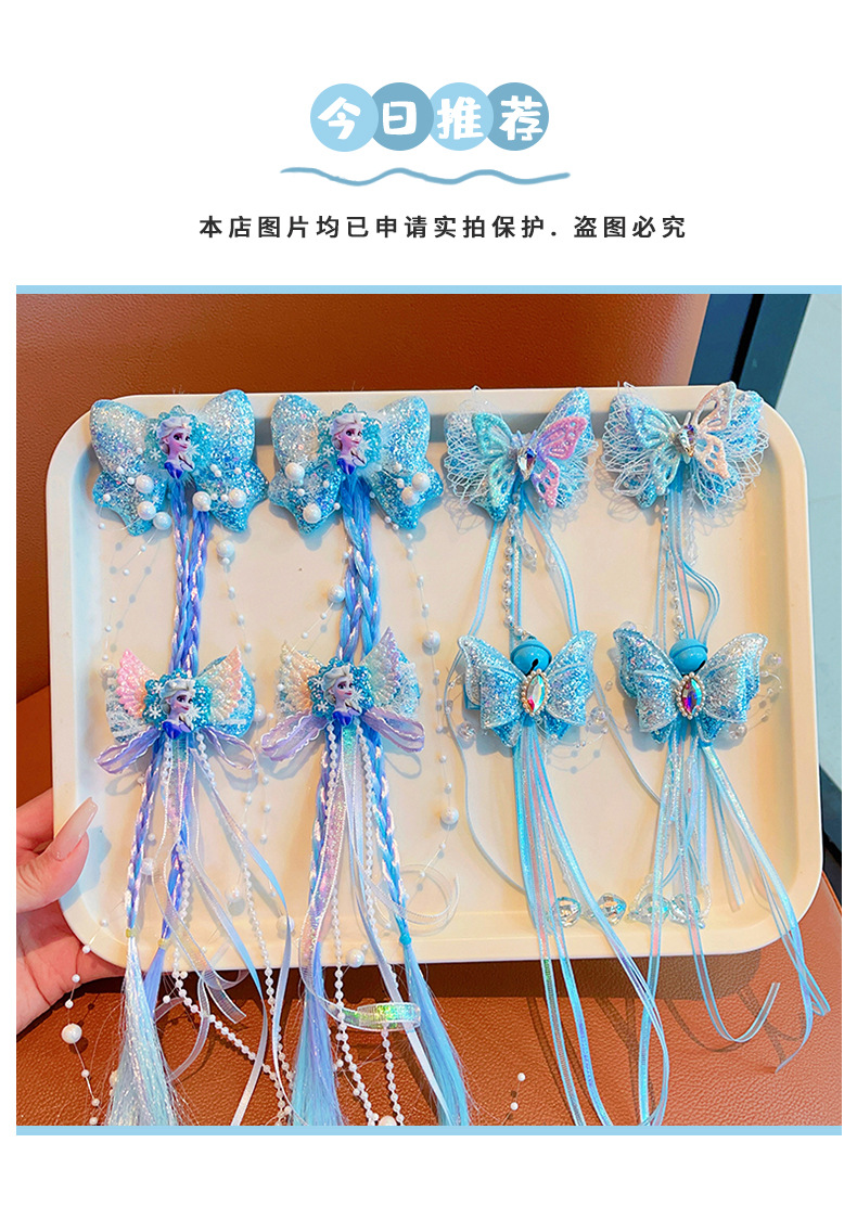 【精美飘带设计,宝宝造型亮眼!】蓝色蝴蝶冰雪发夹 布艺儿童不伤发 公主头饰飘带蝴蝶结 宝宝头饰-QQ