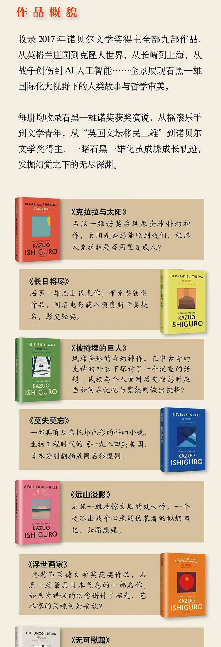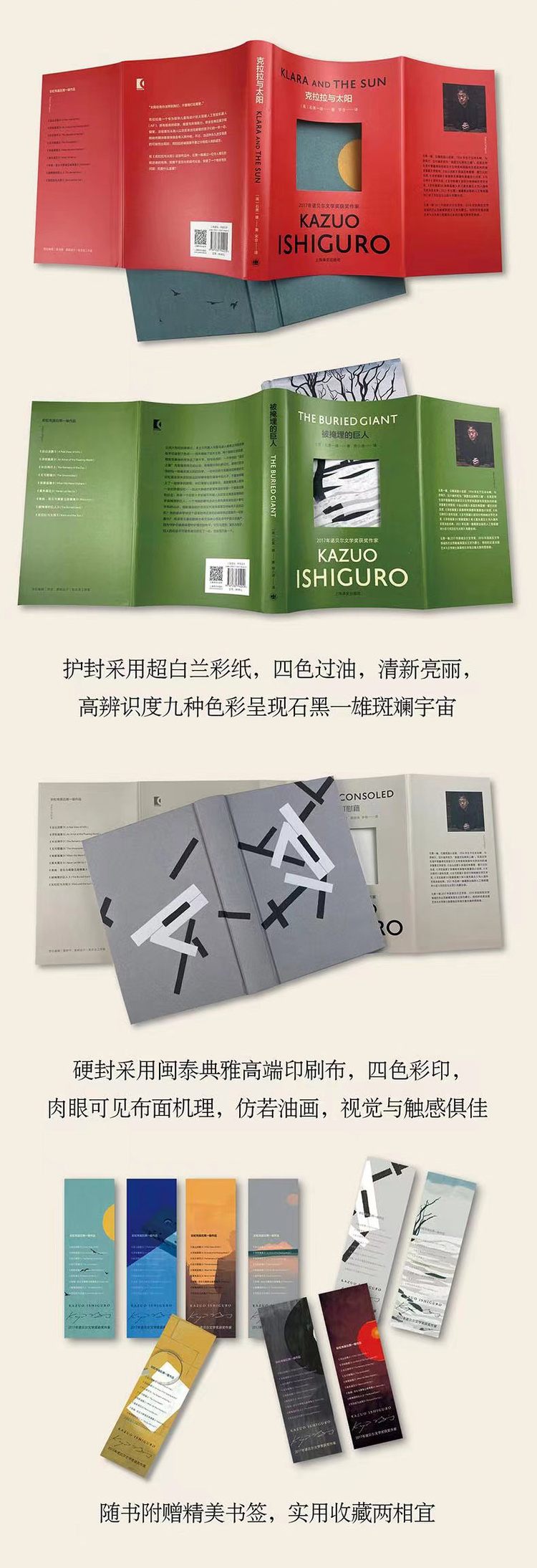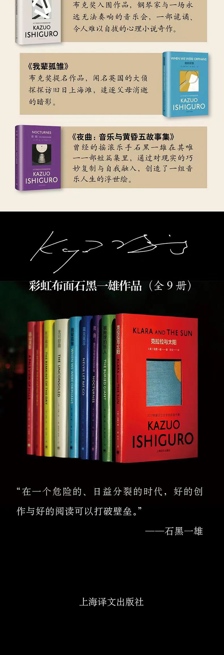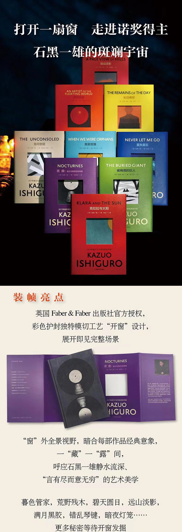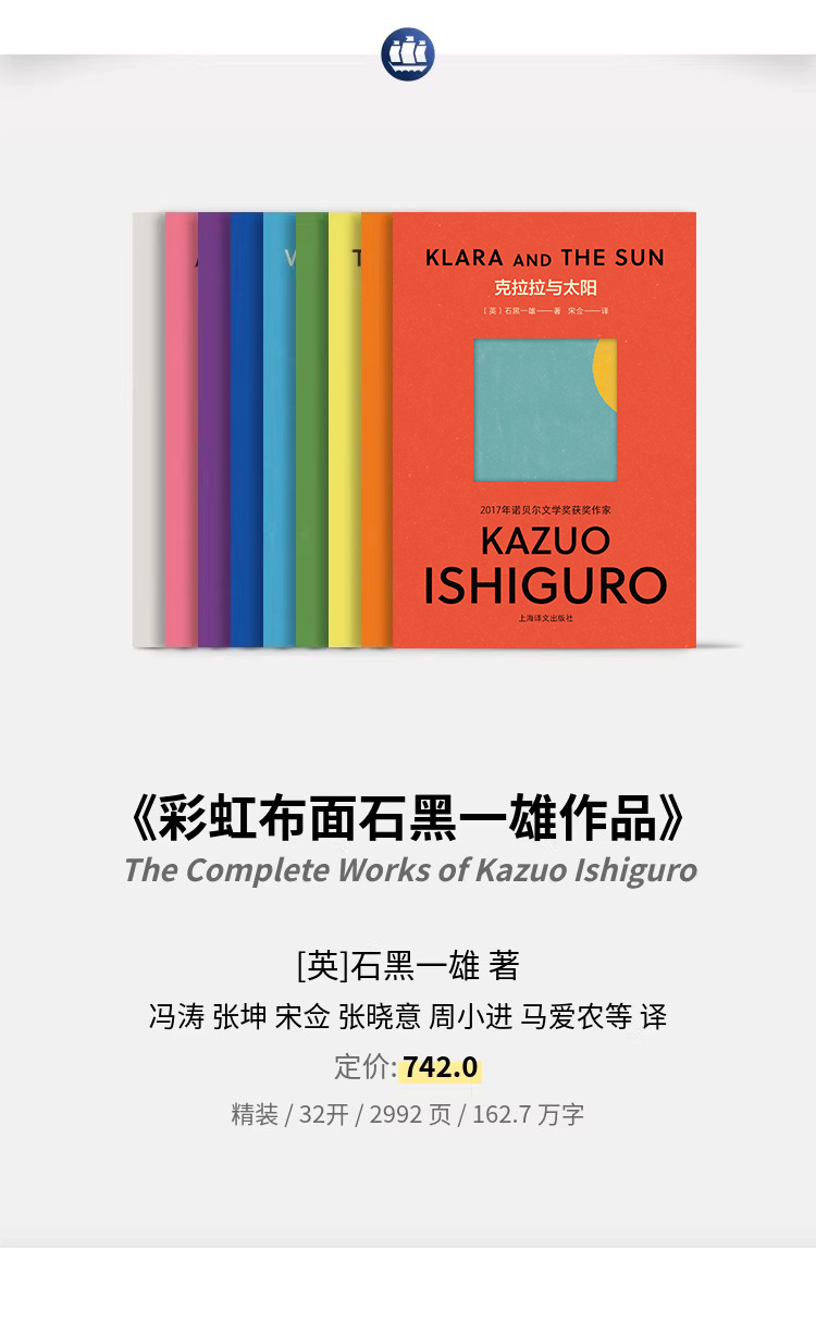 “彩虹布面石黑一雄作品”收录了2017年诺贝尔文学奖得主、英国作家石黑一雄的九种作品:《克拉拉与太阳》《被掩埋的巨人》《夜曲》《莫失莫忘》《我辈孤雏》《无可慰藉》《长日将尽》《浮世画家》和《远山淡影》。该文集在获得英国Faber&Faber原版官方授权设计的基础上,采用彩色护封“开窗”模切设计加全布面彩印的豪华工艺,不仅色彩清新、高端典雅,更完美契合了石黑一雄“静水流深”、含蓄幽婉的作品风格。 九部作品中有2021年最新出版、风靡全球的人工智能题材小说《克拉拉与太阳》;奠定石黑一雄国际文学声誉的重要代表作《长日将尽》;入围布克奖决选名单的《浮世画家》《我辈孤雏》和《莫失莫忘》,获温尼弗雷德·霍尔比纪念奖的《远山淡影》、获惠特布莱德年度最佳小说奖的《浮世画家》、奇幻史诗题材作品《被掩埋的巨人》,以及石黑一雄唯一一部短篇小说集《夜曲》。
