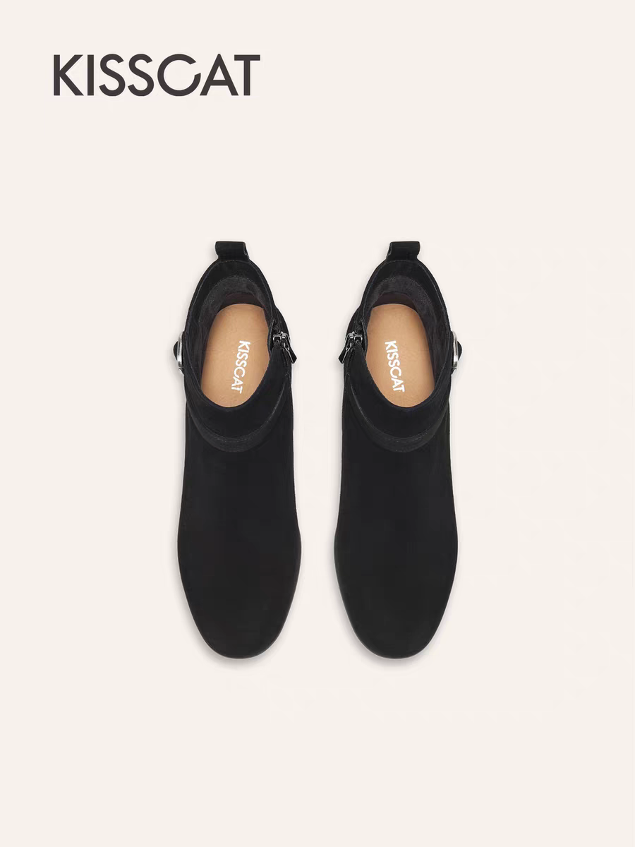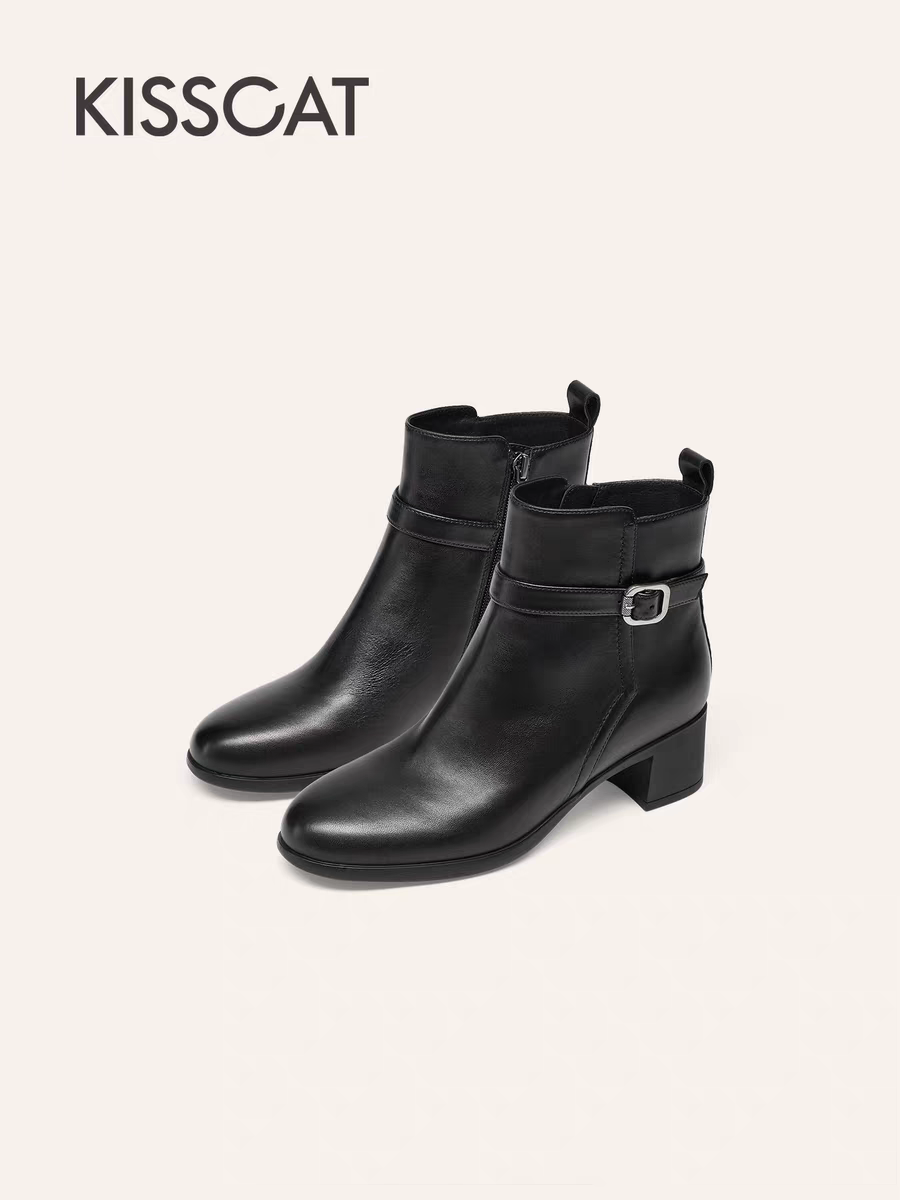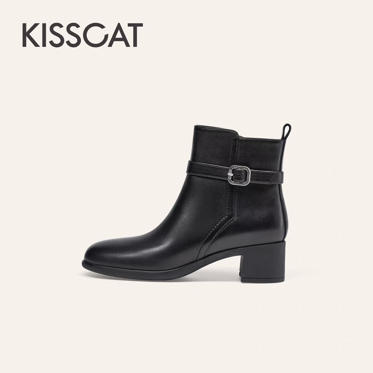 「KISSCAT接吻猫25冬季新款显瘦粗跟矮靴增高法式真皮黑色时装靴女」