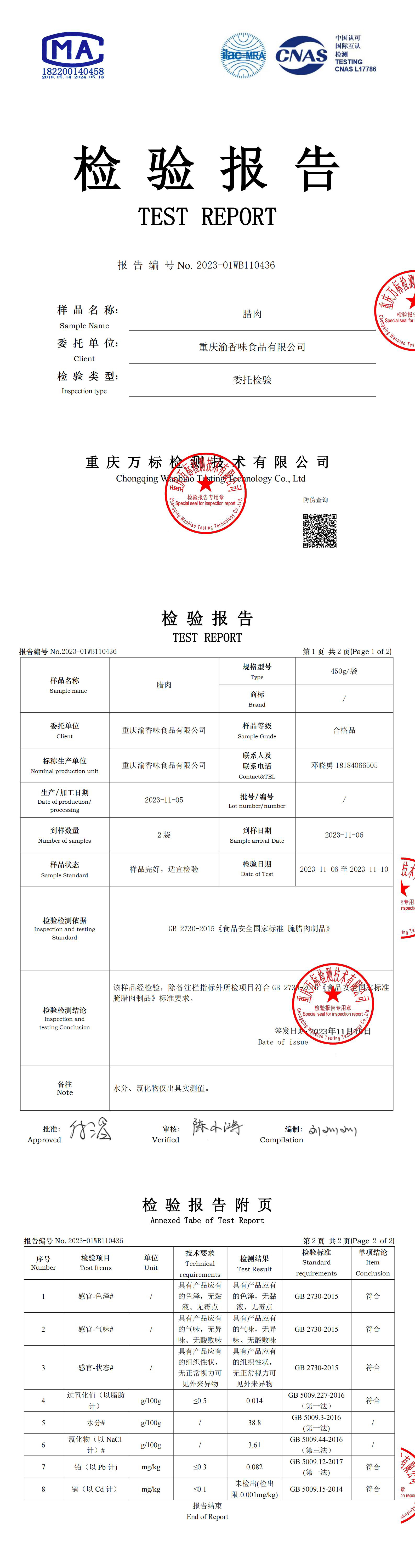 【腊味质检报告】我们的制作车间保持着干净卫生的环境,符合相关规定。我们不仅拥有肉品检疫合格证明和食品生产许可证,而且在腊味的制作过程中,严格按照规定的操作流程进行操作。我们每年都会将产品送检,在确保符合质量标准后才上市销售。针对香肠和腊肉,它们的各项检测指标均符合合格要求。为了确保可信度,我们愿意提供相关的检测报告供您参考,详情请见附件。