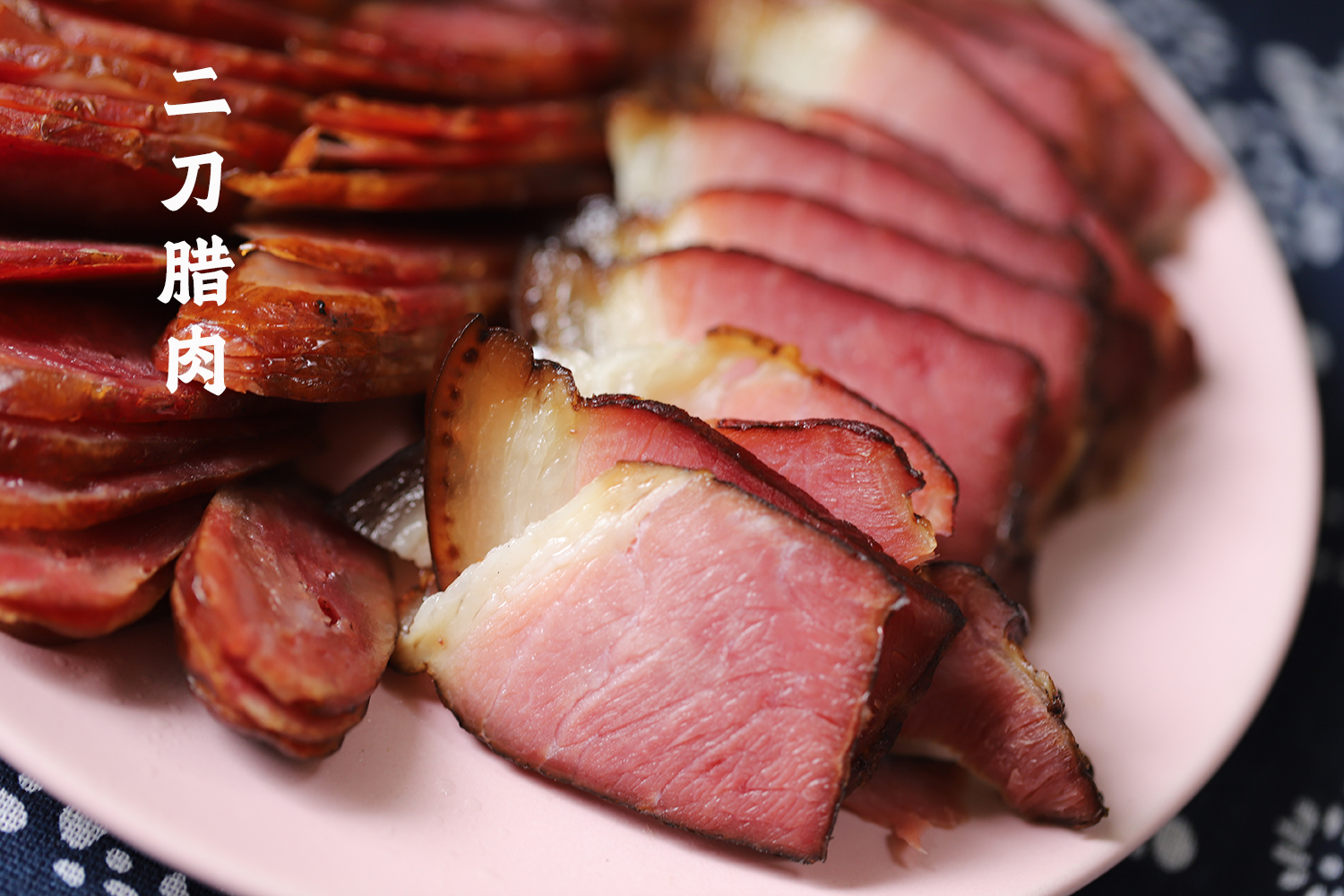 腊肉二刀腊肉(后腿肉):后腿腊肉偏瘦,相对传统腊肉烟熏味较轻,但肉质仍保持鲜美,肉皮经过处理易在烹饪中变软;