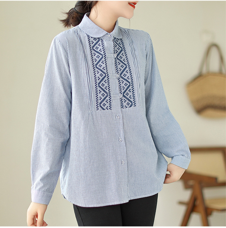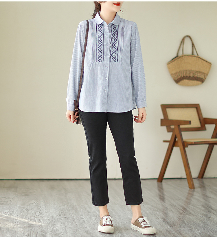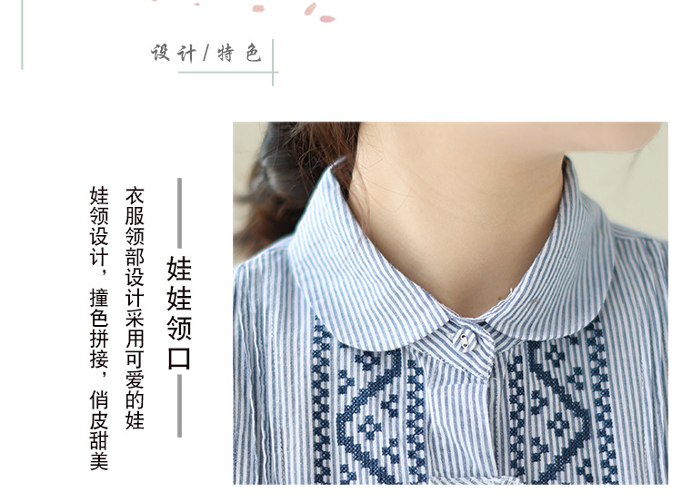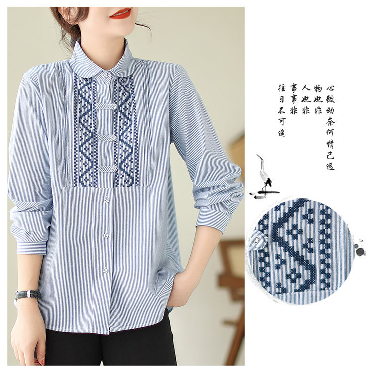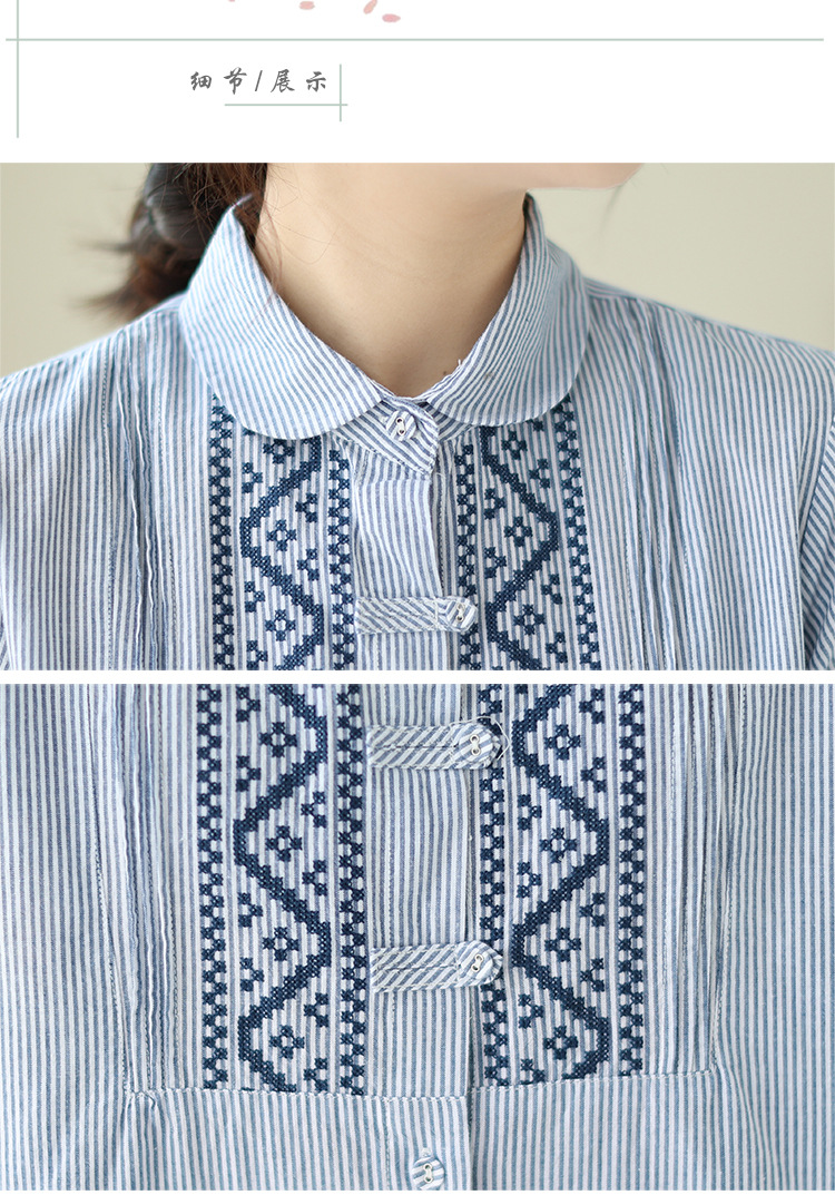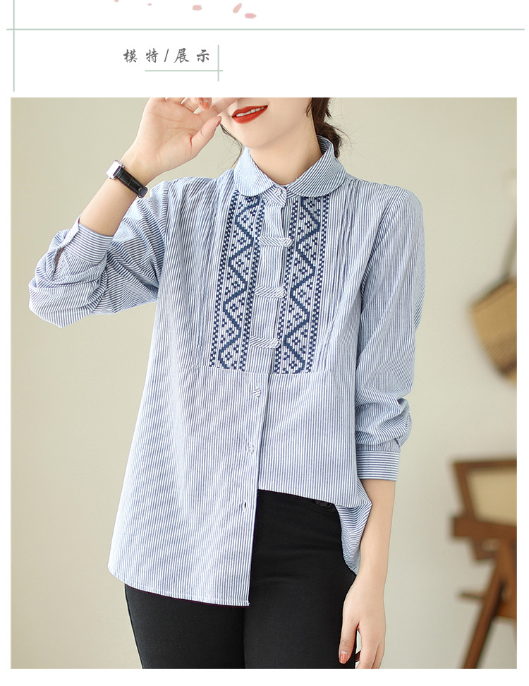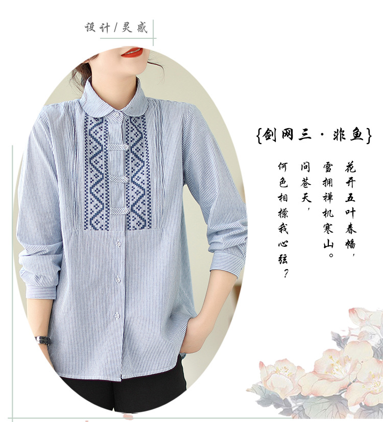 雀说民族风刺绣设计感小众纽扣显瘦条纹衬衫女长袖AL3073