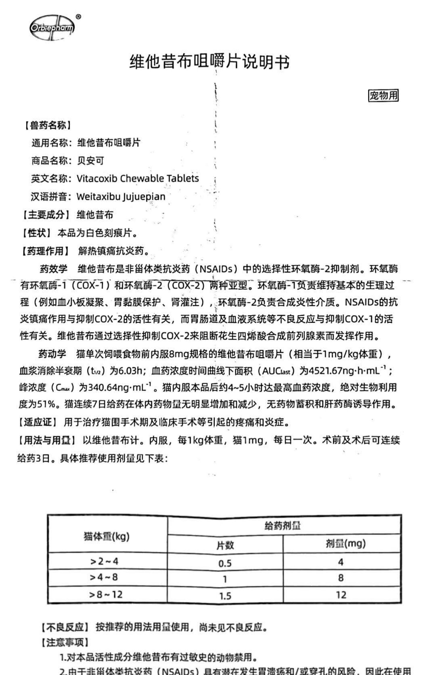 贝安可维他昔布咀嚼片8mg宠物猫用止疼药猫咪止痛药术后关节疼痛