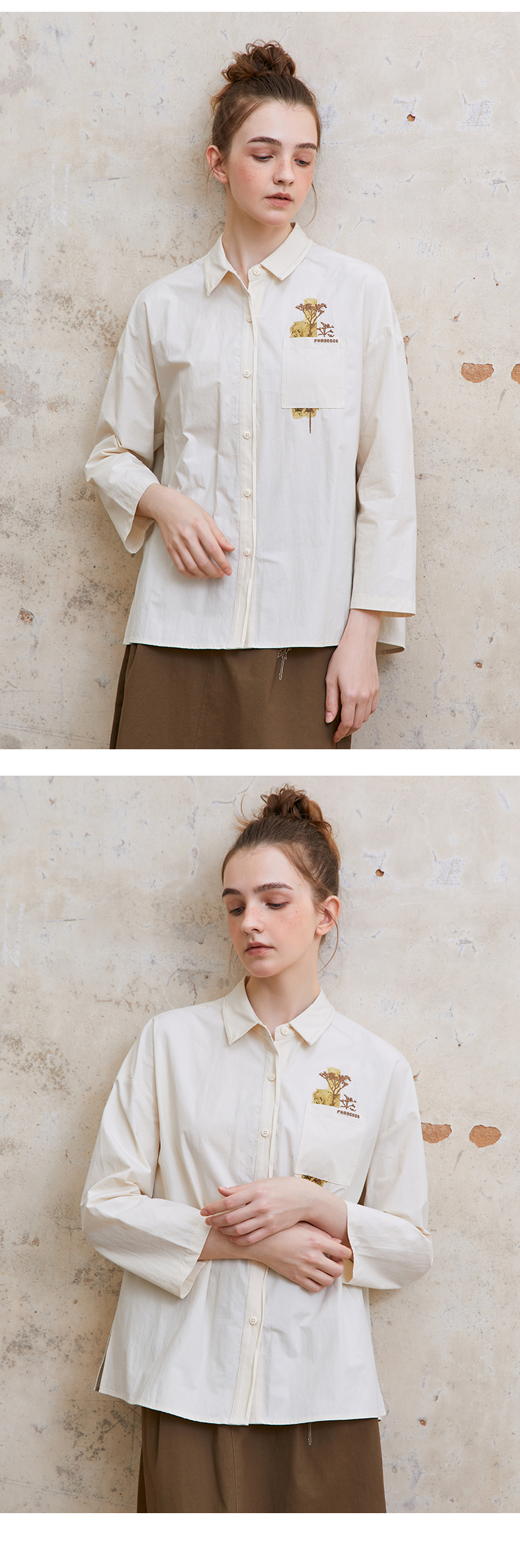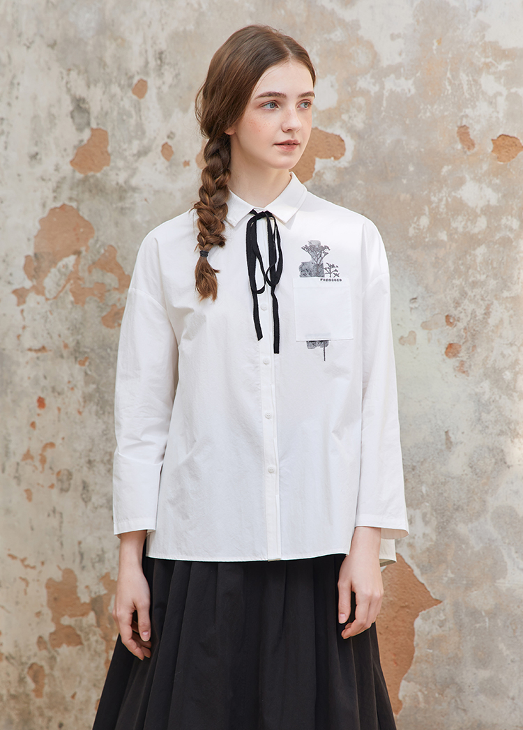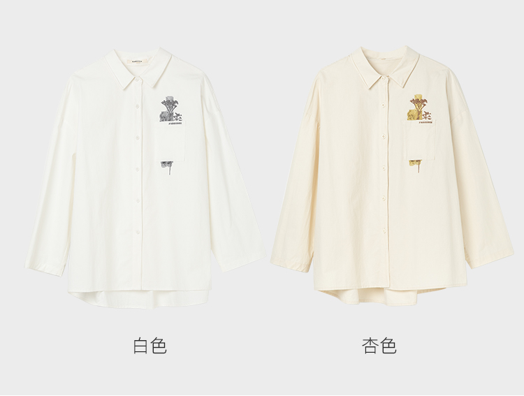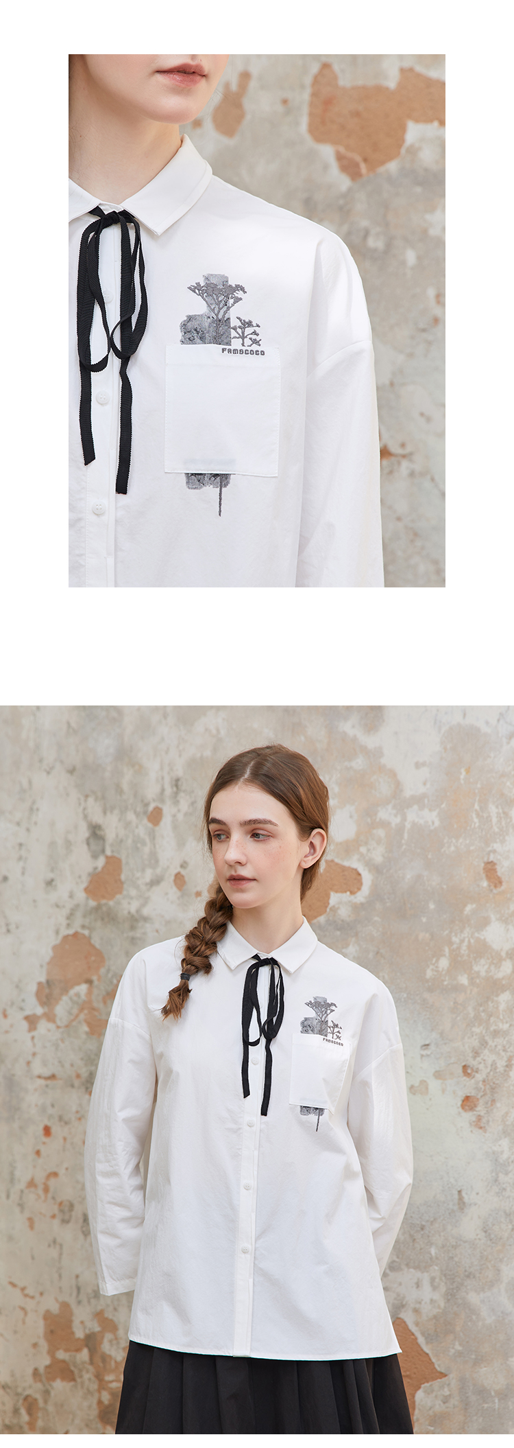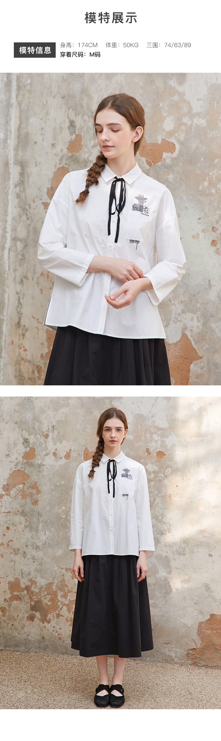 Famecoco范可儿印花刺绣宽松白衬衫女士落肩长袖衬衣FAC1BH010