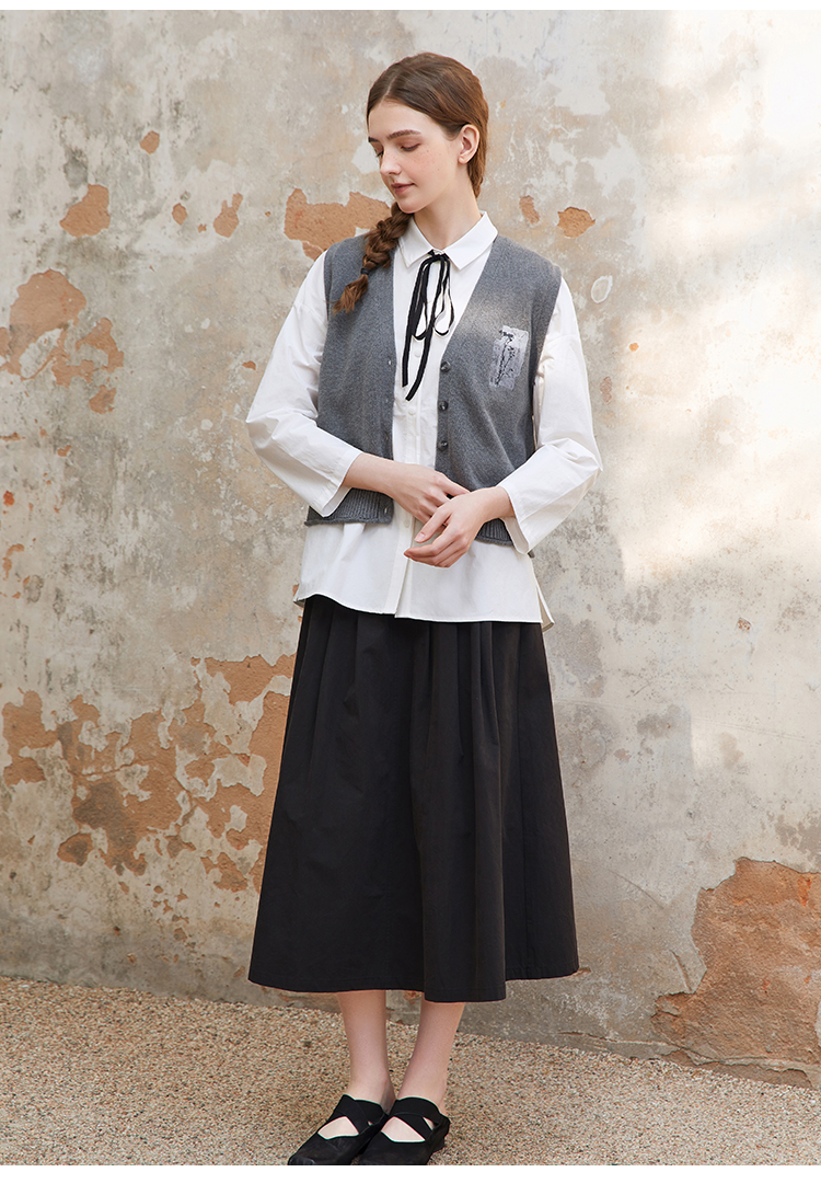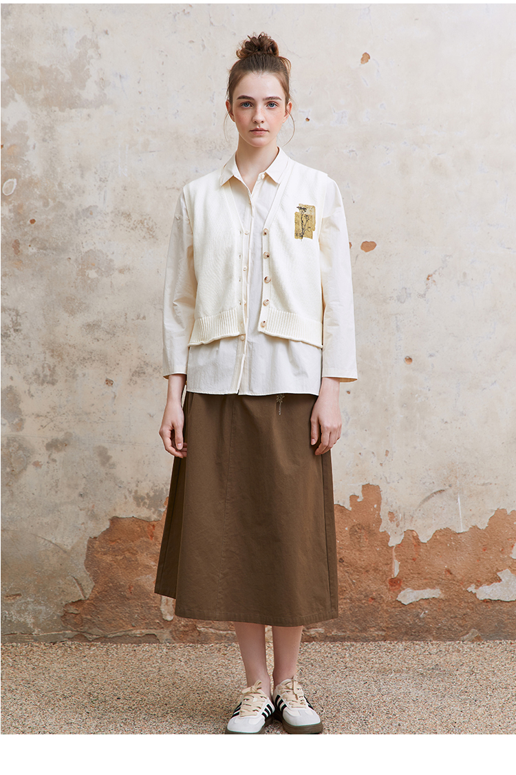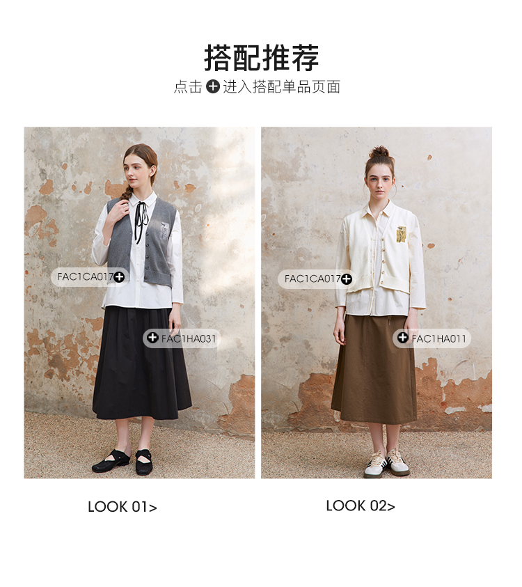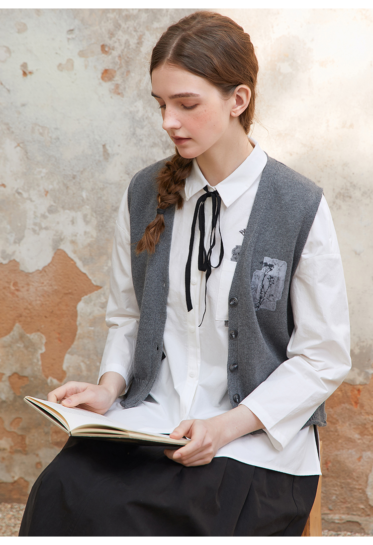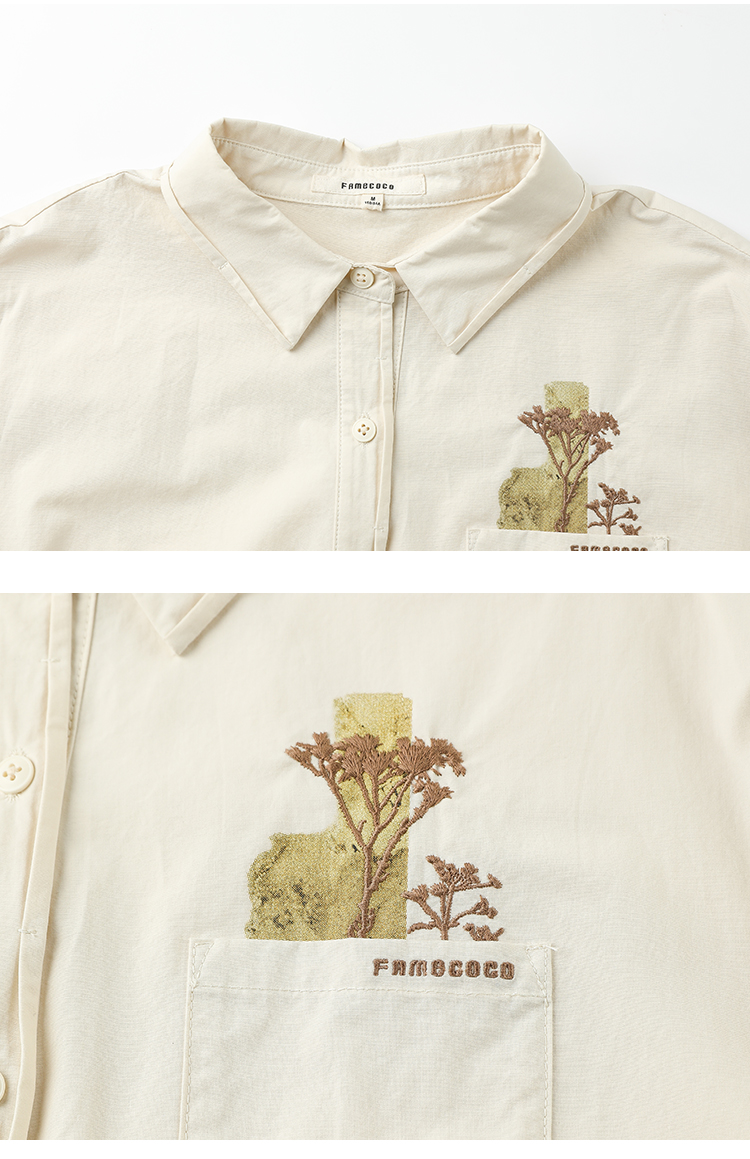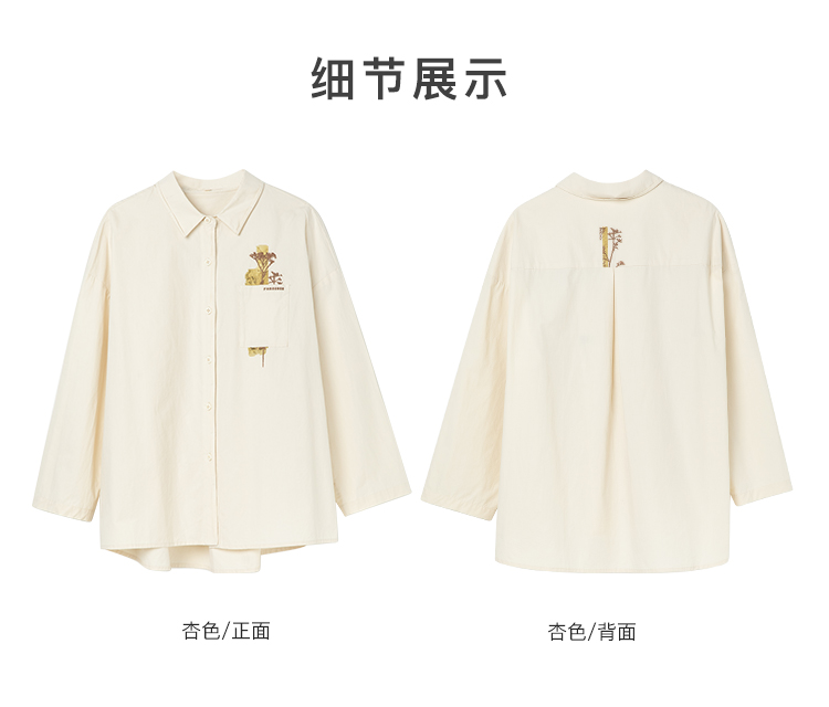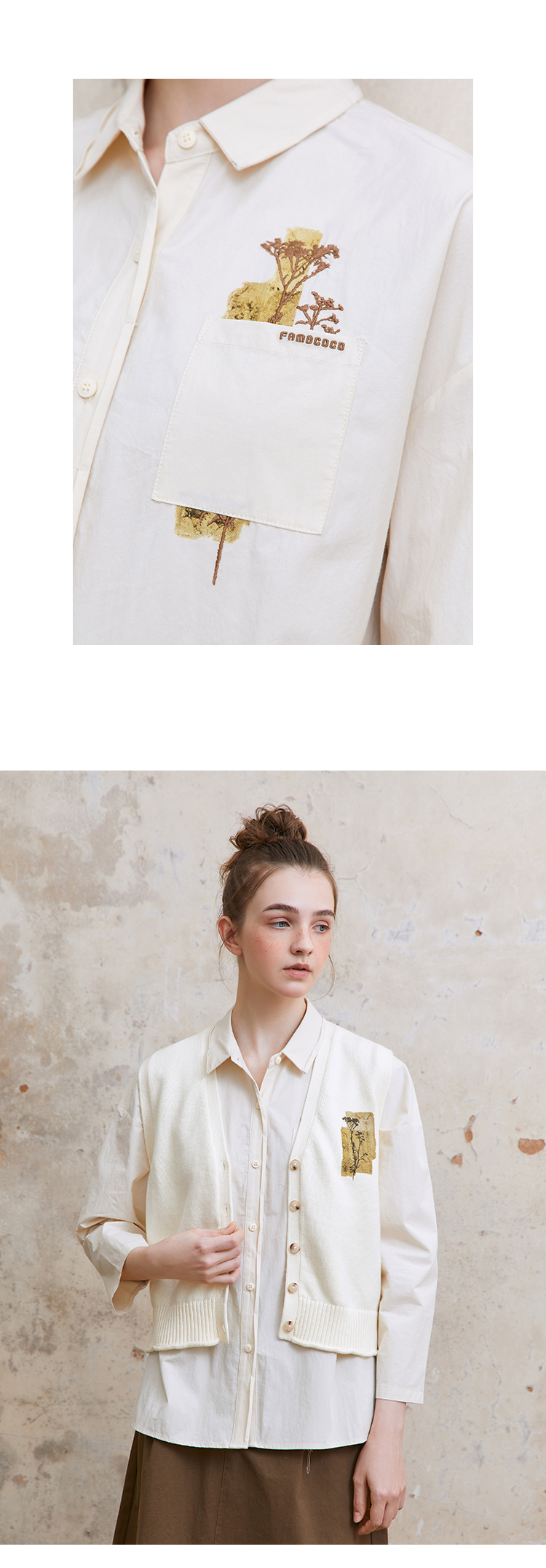 Famecoco范可儿印花刺绣宽松白衬衫女士落肩长袖衬衣FAC1BH010