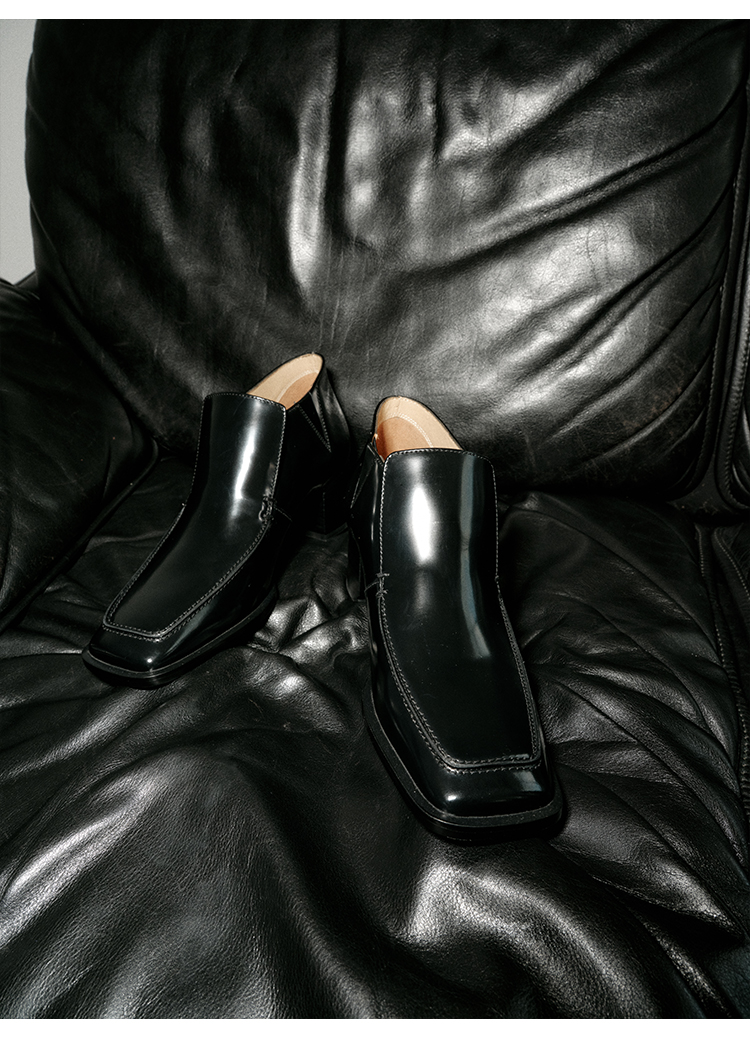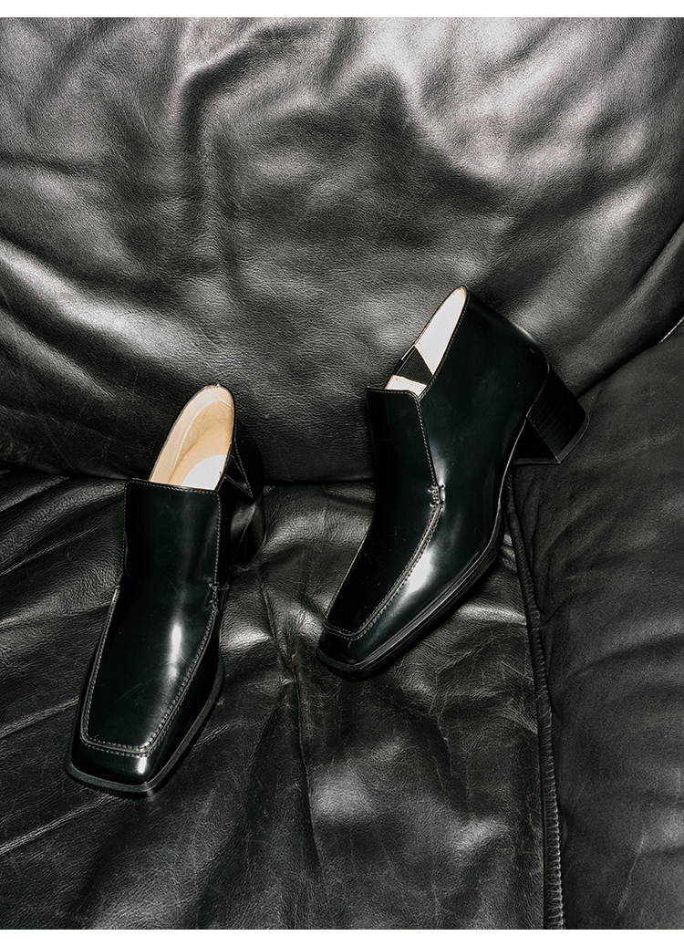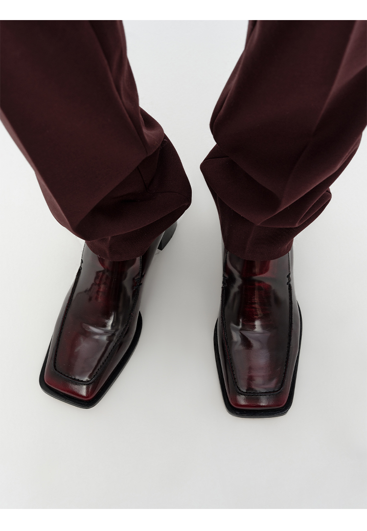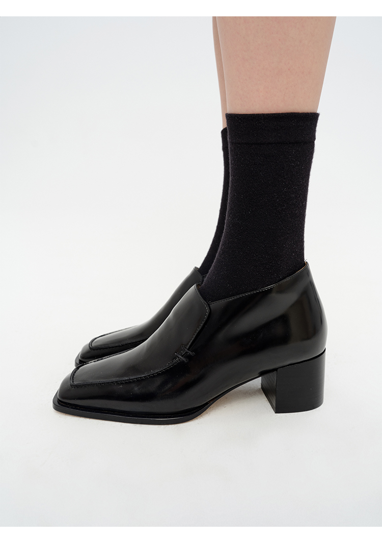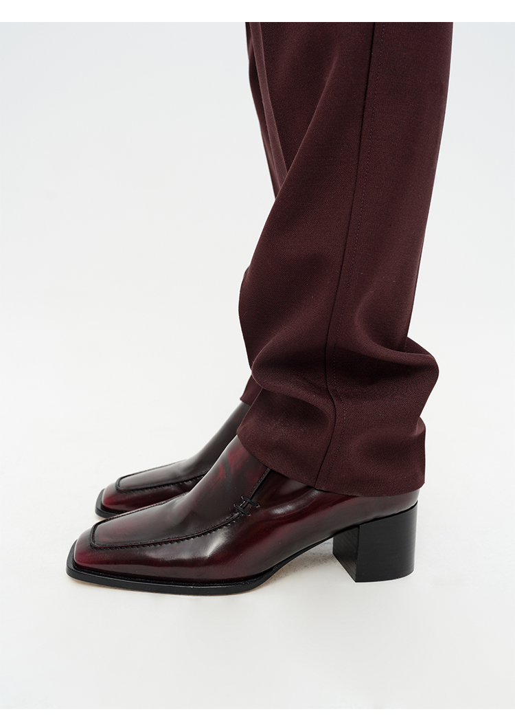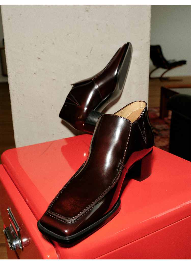 HIDEMI 极简方头都市感方跟粗跟进口雾面亮皮牛皮手工感中跟皮鞋 黑色/复古酒红