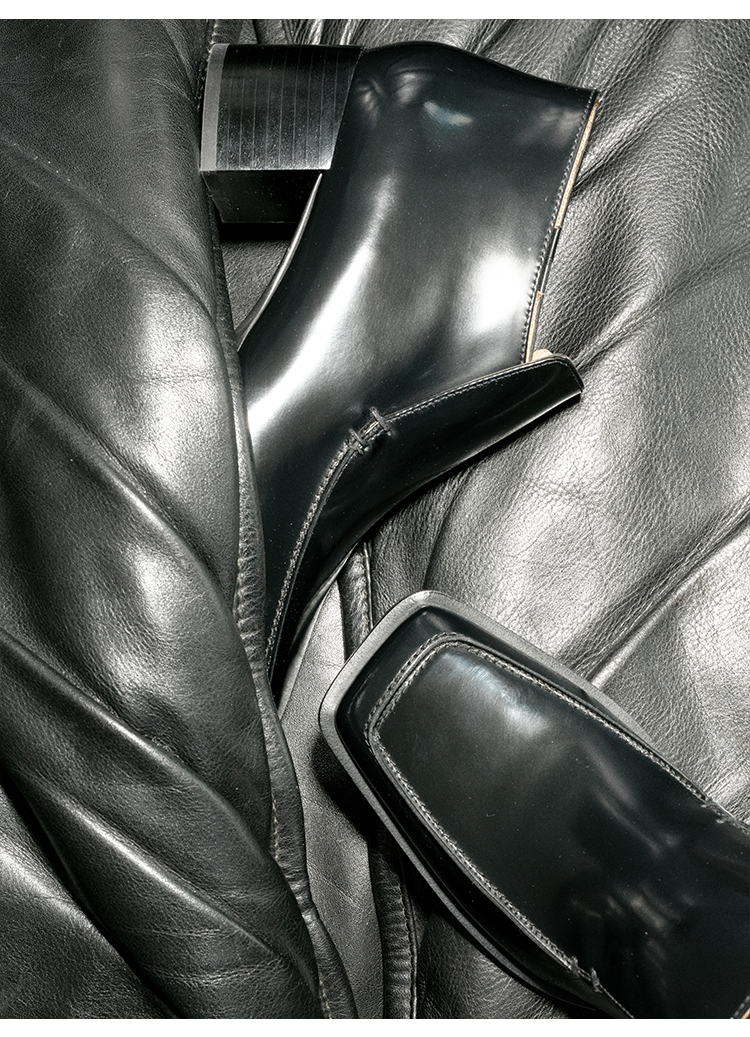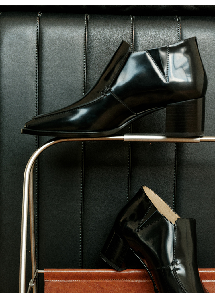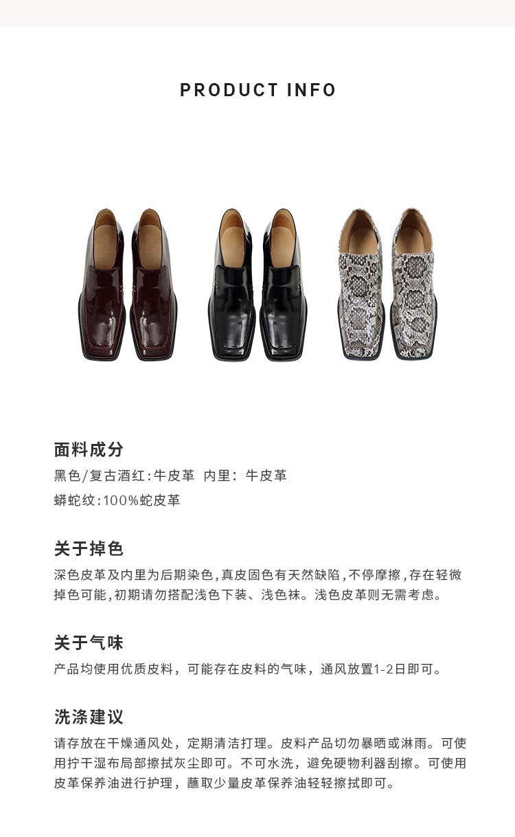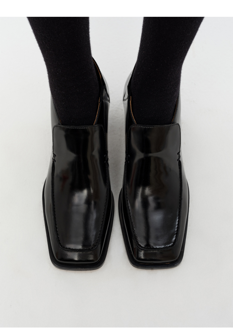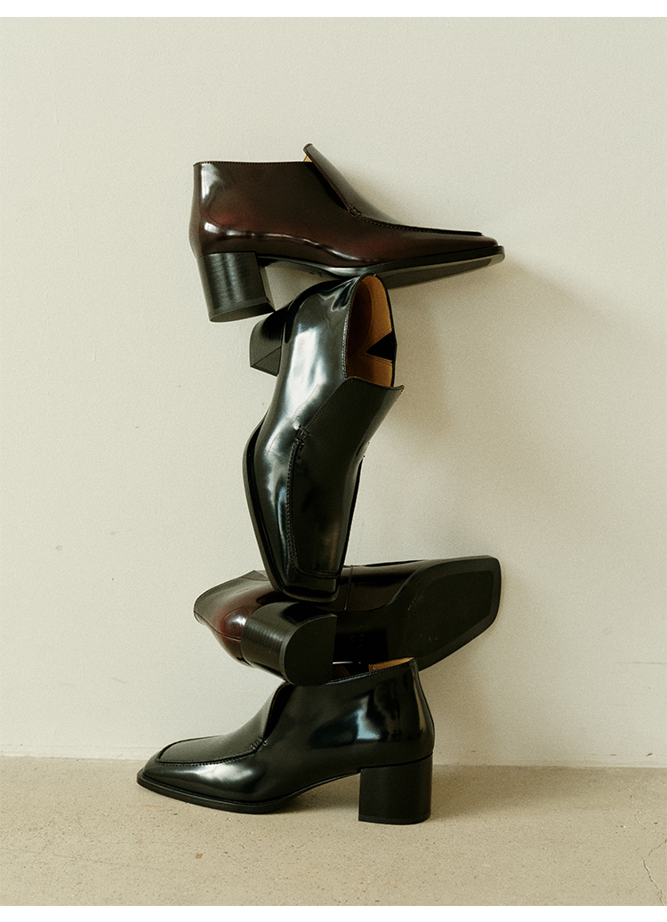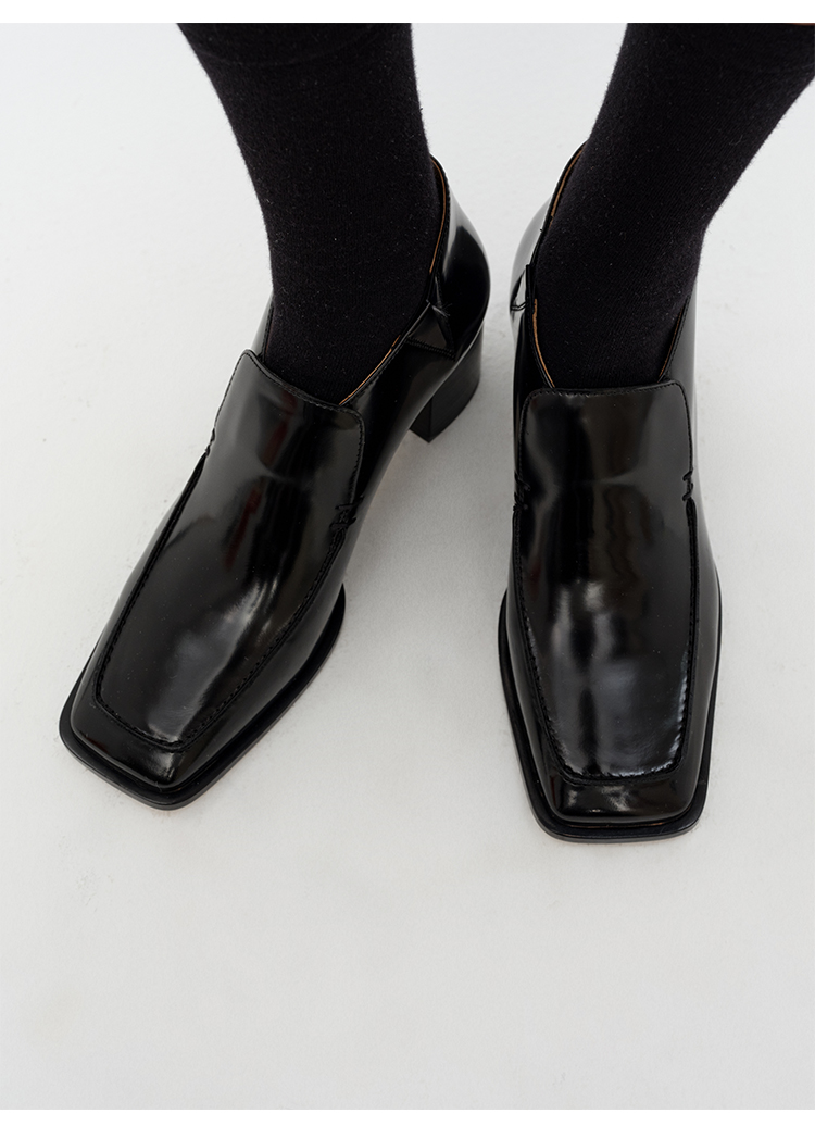 HIDEMI 极简方头都市感方跟粗跟进口雾面亮皮牛皮手工感中跟皮鞋 黑色/复古酒红