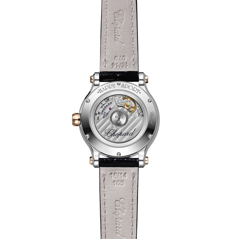 镜面材质 | 蓝宝石水晶玻璃 | 表盘 | 18k玫瑰金/精钢表壳 镶钻表圈 银白色表盘,中央饰有玑镂雕纹,饰有玑镂雕纹 5颗灵动钻石(1.49克拉),金色罗马数字时标和海蓝色铁轨式分钟圈,镀金锥形时针和分针,镀金棒形秒针 透底,透明蓝宝石底盖 |