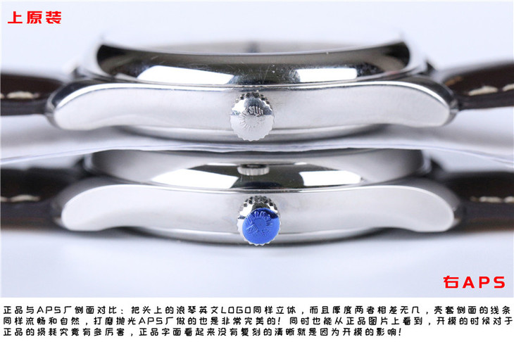 正品与APS厂侧面对比:把头上的浪琴英文logo同样立体,而且厚度两者相差无几,壳套侧面的线条同样流畅自然,打磨抛光APS厂做的也是非常完美的!正品开模损耗的太厉害,壳套划痕非常多!