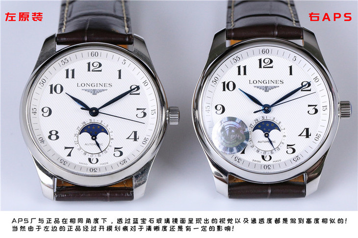 一直以来浪琴表在国内的市场流通性都非常强,主要还是性价比高,属于低中端腕表,也是很多表友第一款表首款入手佳品,其中名匠系列月相表也是最受表友喜爱的产品,到现在热度不减,当然也不是每个人都会去选在一款价值两万块的正品,更多的表友会去选择复刻浪琴月相表,不过现在市场鱼龙混杂,大厂小厂都有,不懂复刻表的表友很容易吃亏,这次小编就给大家介绍一款市场最高版本的APS厂浪琴名匠月相复刻表,下面对比正品来看一看这款表做工到底如何!