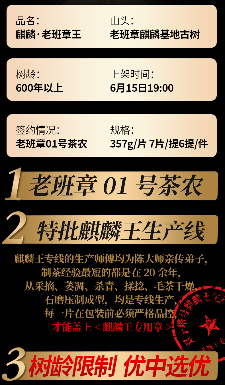 【6月15日19:00准时开抢!】【专柜价:9980元/片 仅限前18名VIP抢购:699元/片 !附赠收藏证书】【拍7发8拍42发48】2025头春【麒麟·老班章王】陈道峰大师签约老班章01号监