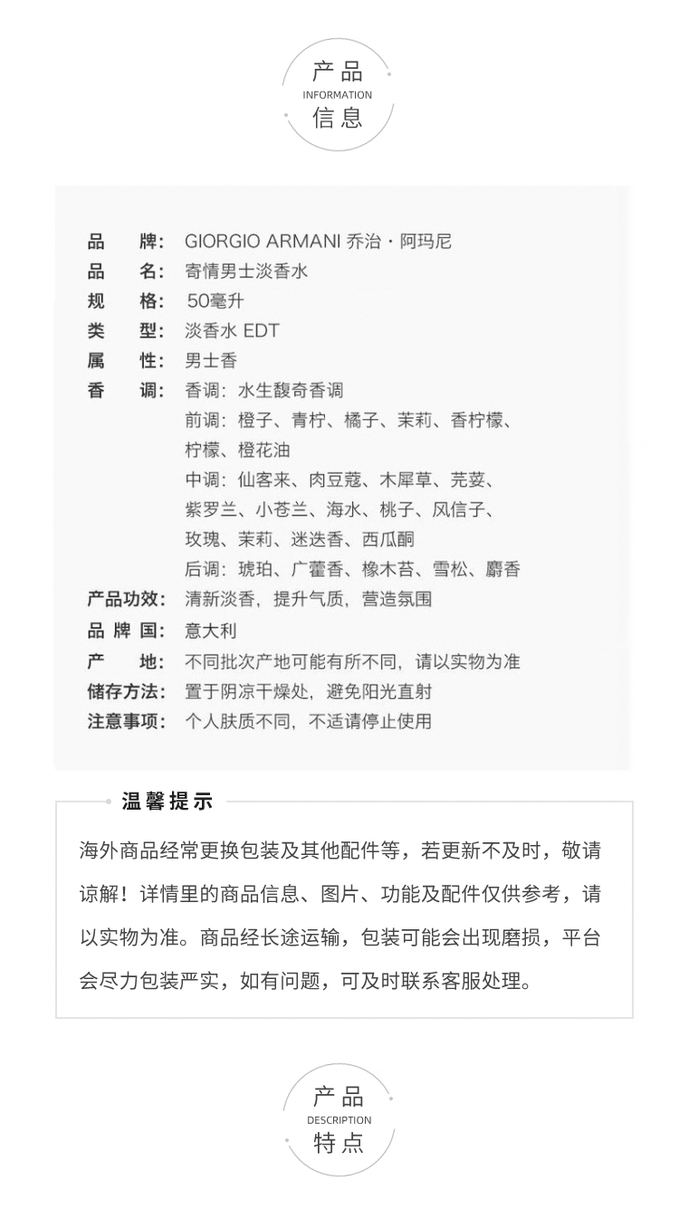 阿玛尼(ARMANI)寄情男士香水 经典版50ml柑橘海洋调清新男士持久留香 生日父亲节礼物送男生男友【CDF】