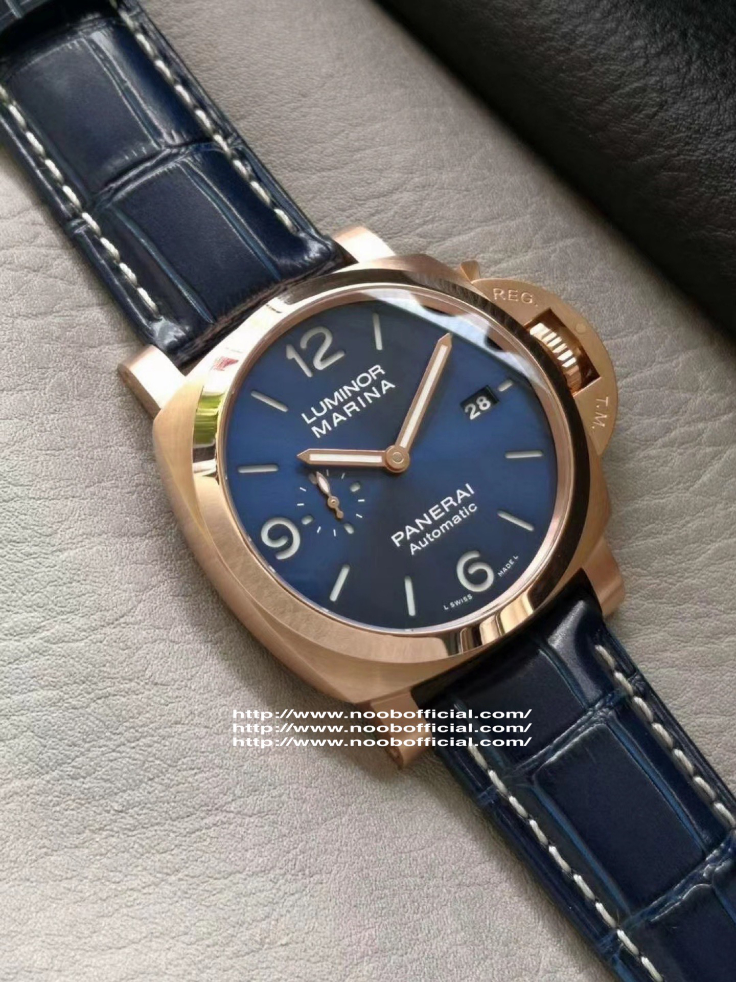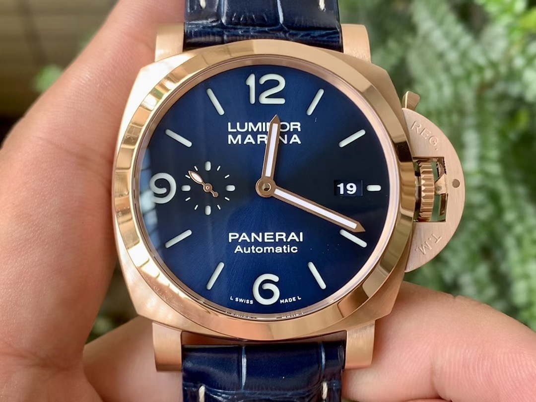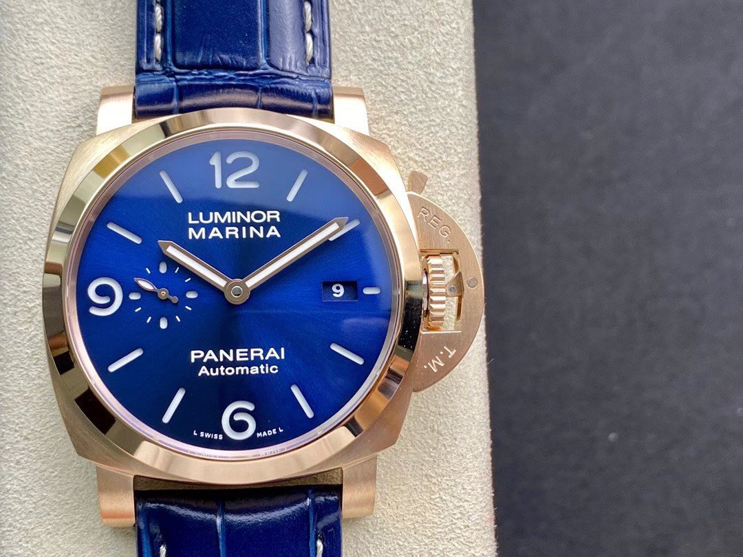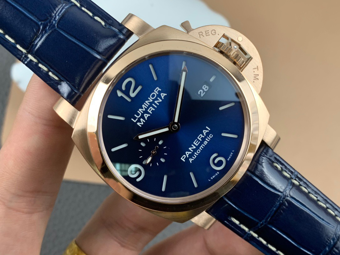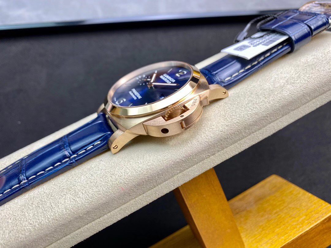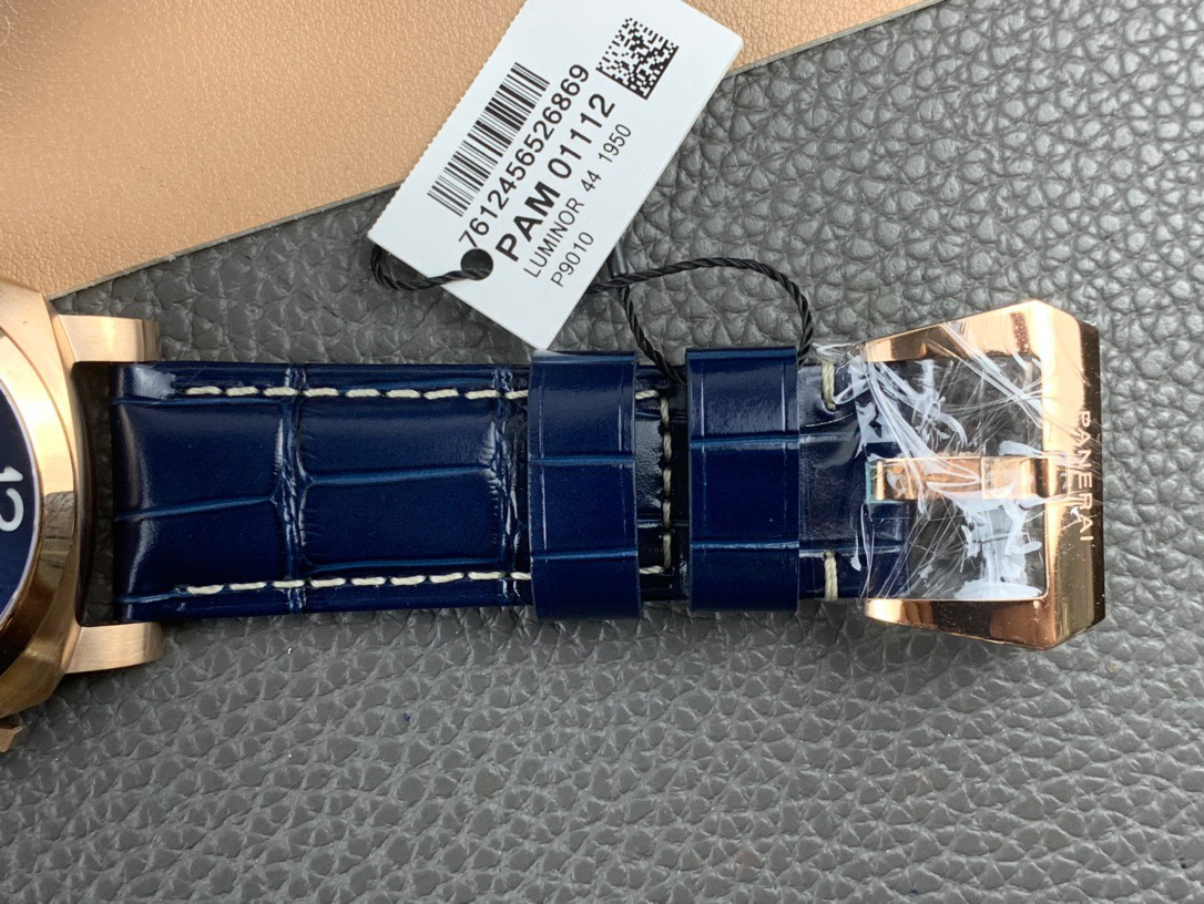 VS 2020 新品:44MM"骚蓝"庐米诺红金腕表PAM 1112。金表无数,唯有沛 Na 海红金表浓郁深厚,特征性设计,视觉上独特,形态上扎实,戴着过瘾!买红金系列的那必定是真爱粉无疑!