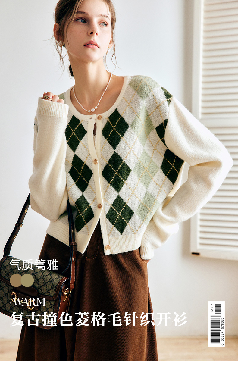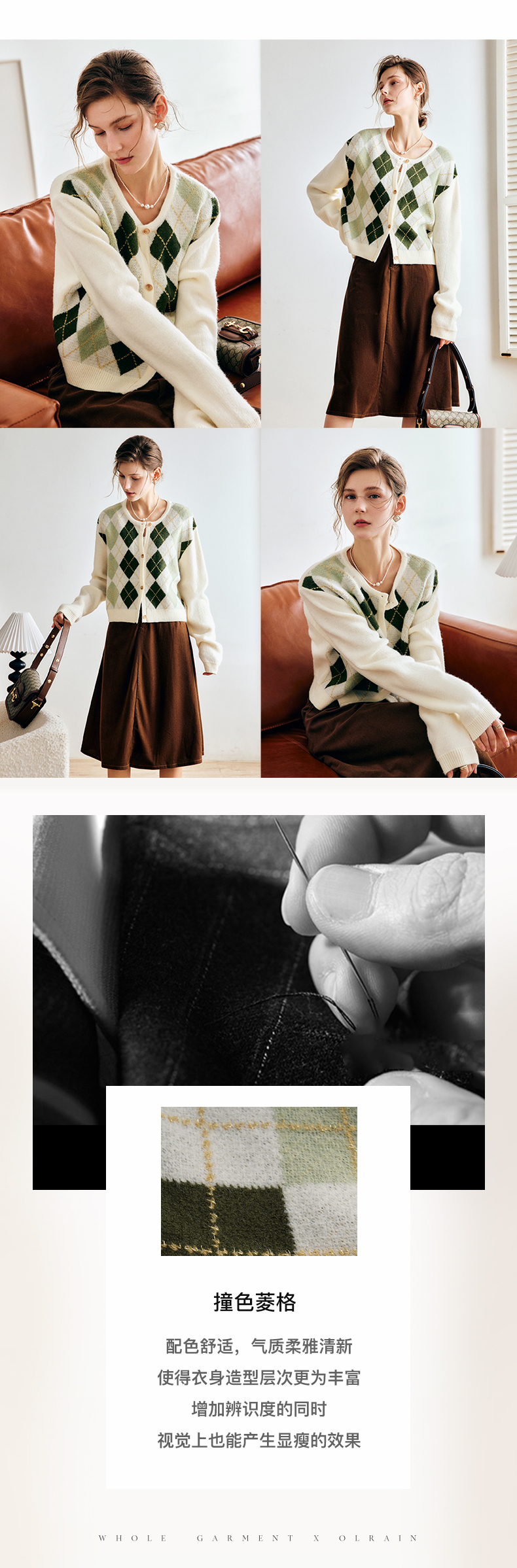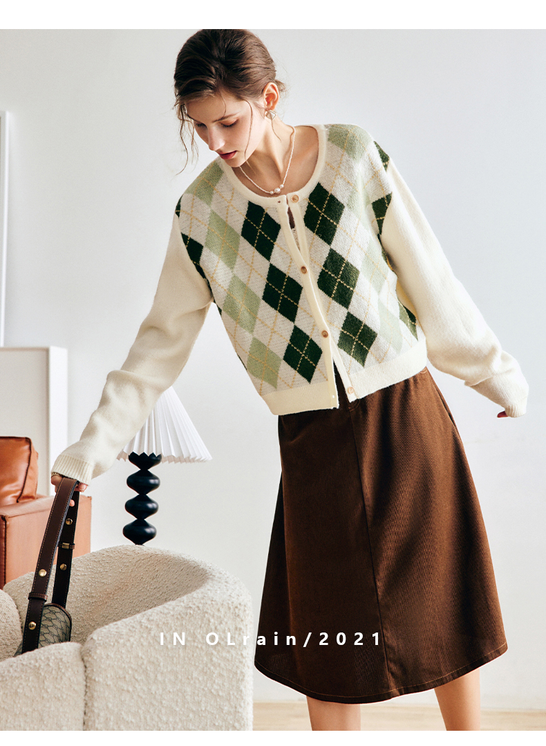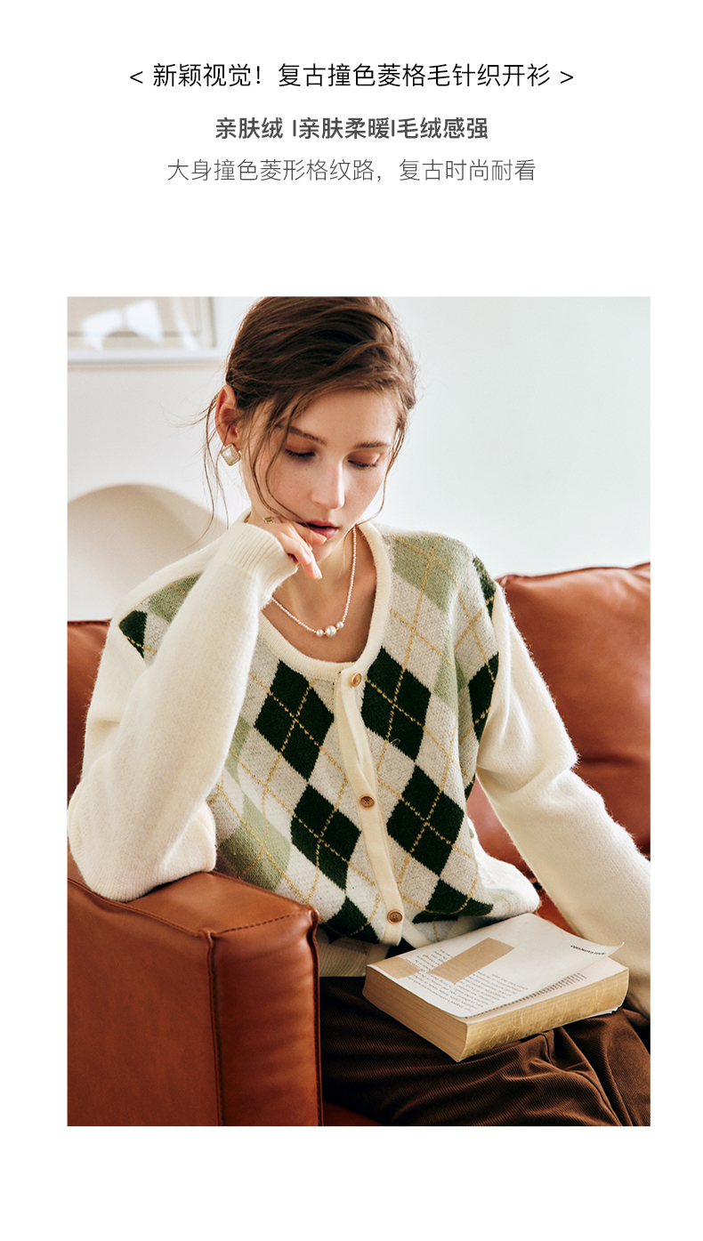 OLrain欧芮儿法式菱格针织开衫毛衣女早秋2022年新款复古撞色上衣