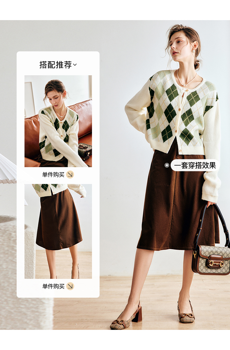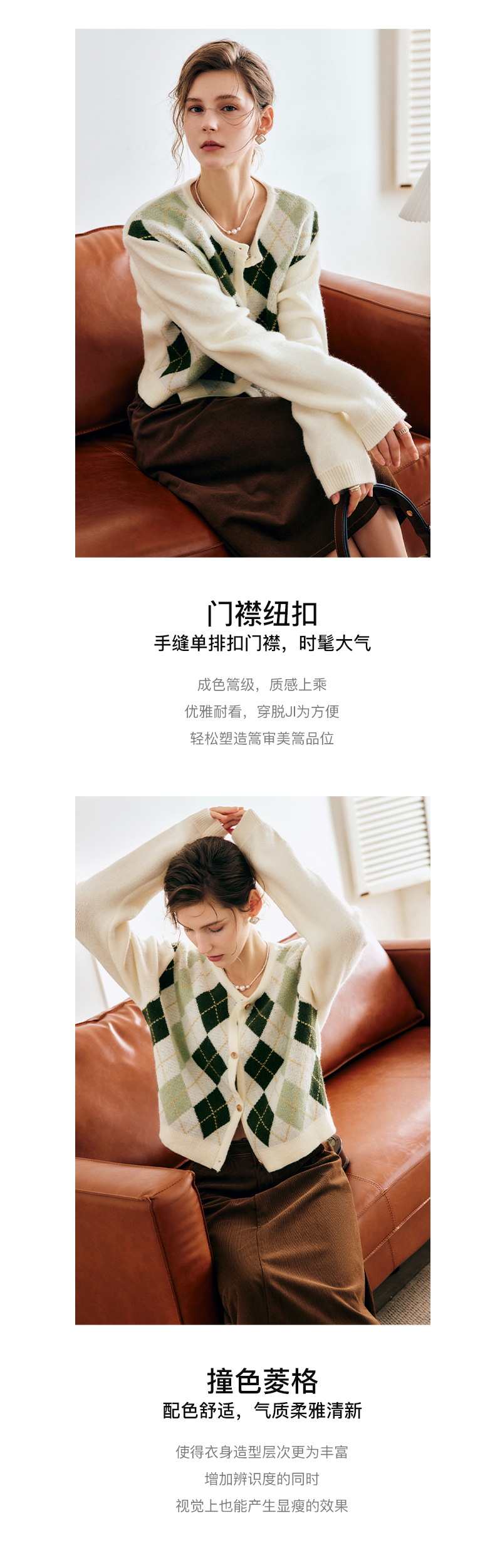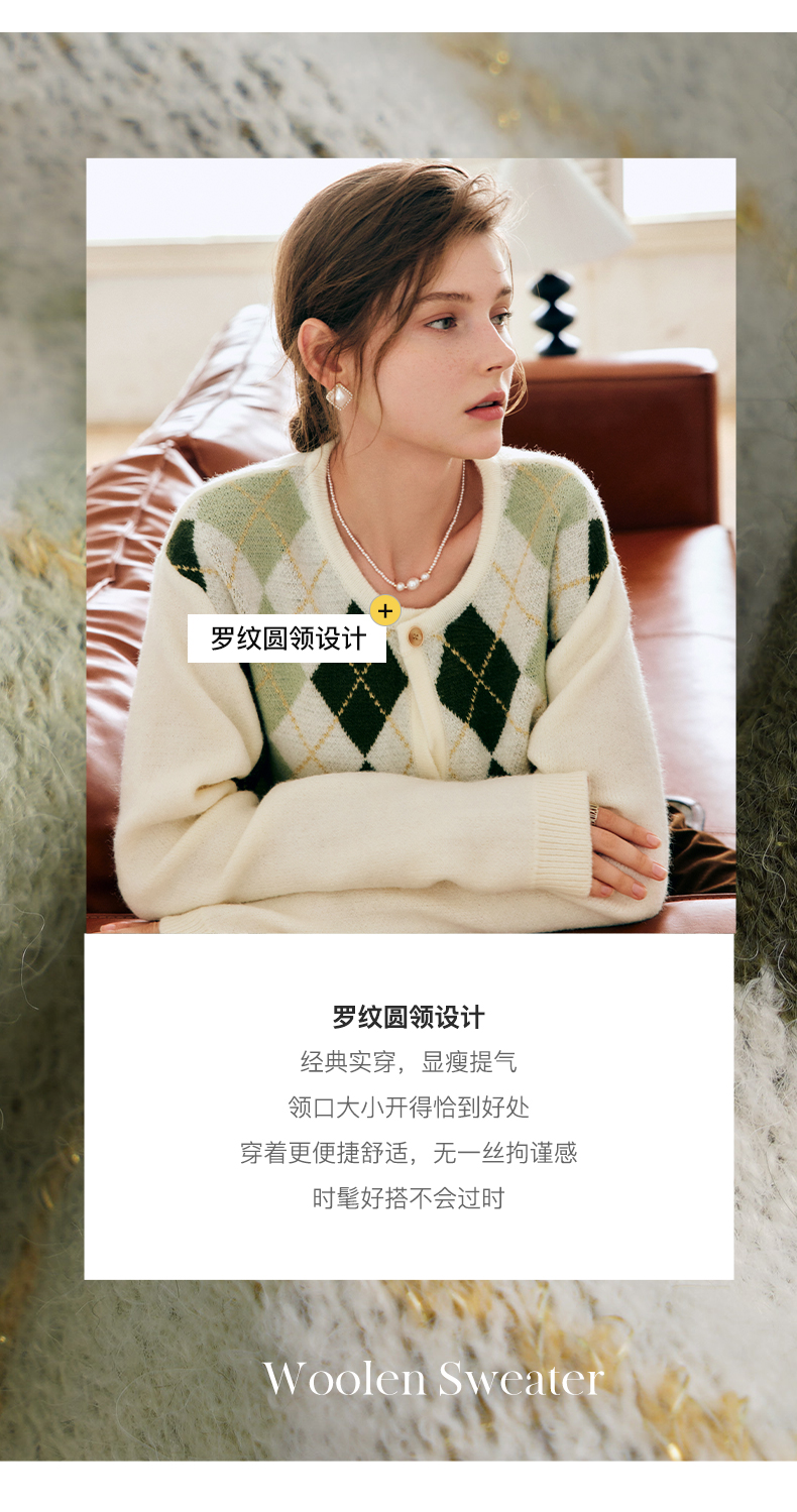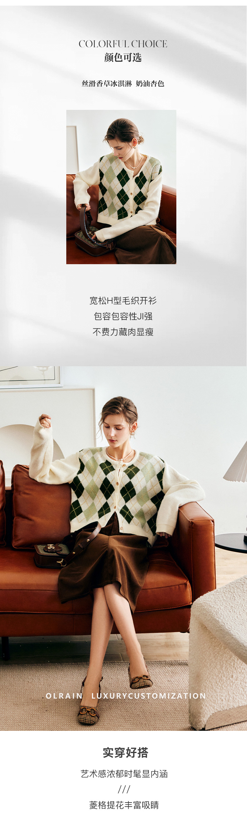 OLrain欧芮儿法式菱格针织开衫毛衣女早秋2022年新款复古撞色上衣