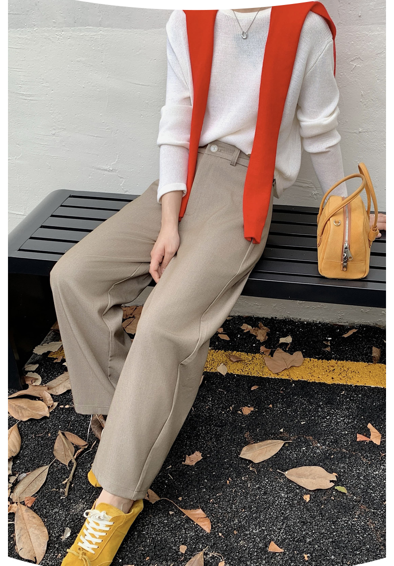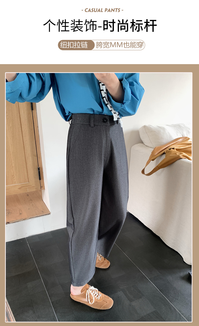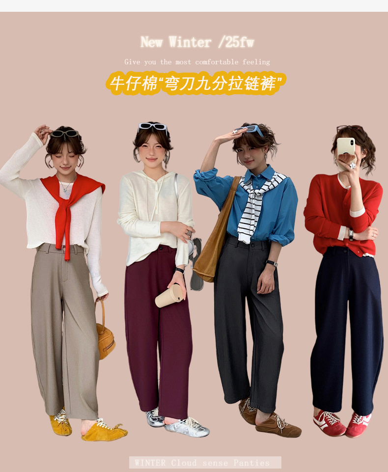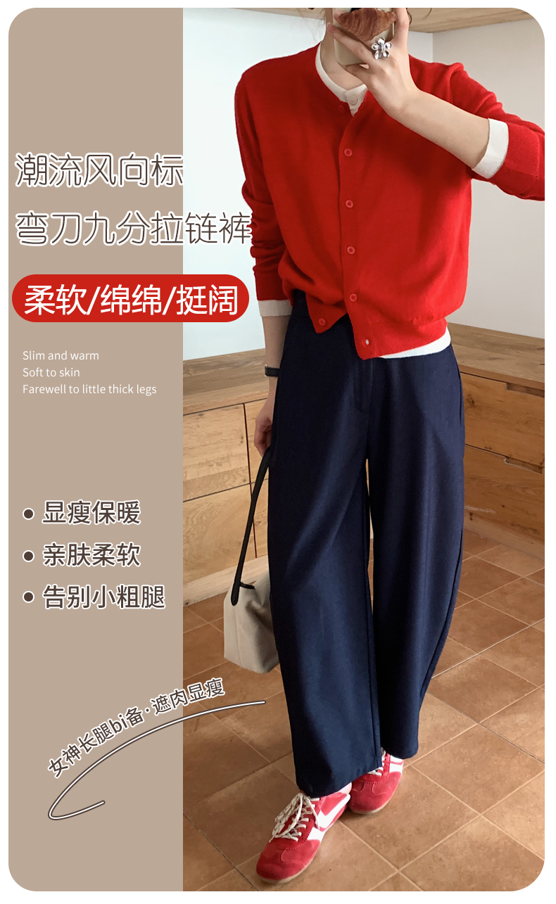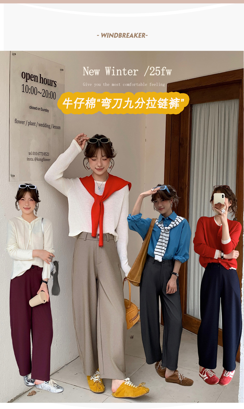 骆柒柒牛仔棉弯刀九分拉链裤 牛仔梭织面料柔软垂顺 弯刀九分裤型修饰各种身材 半松紧腰穿着更舒适 时尚百搭
