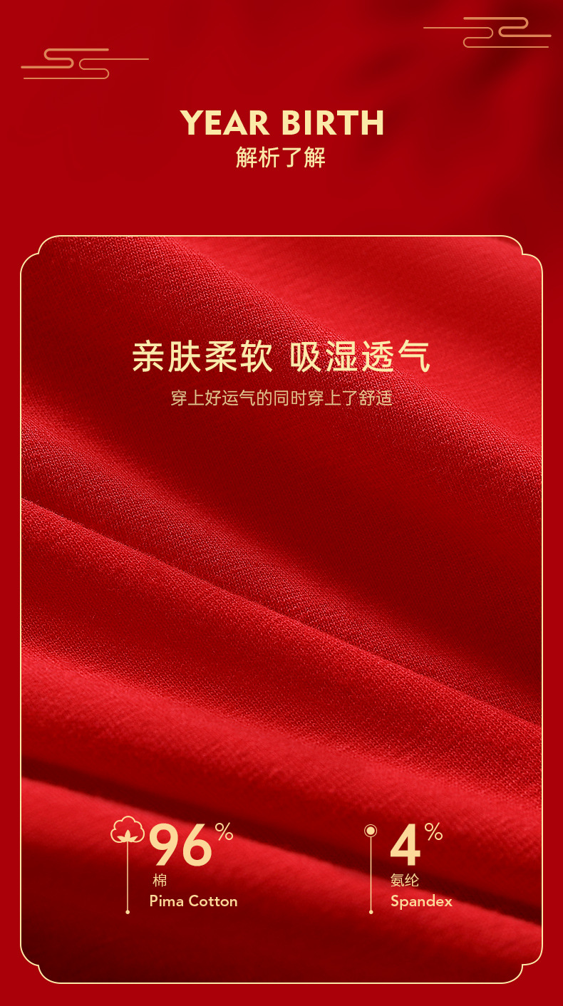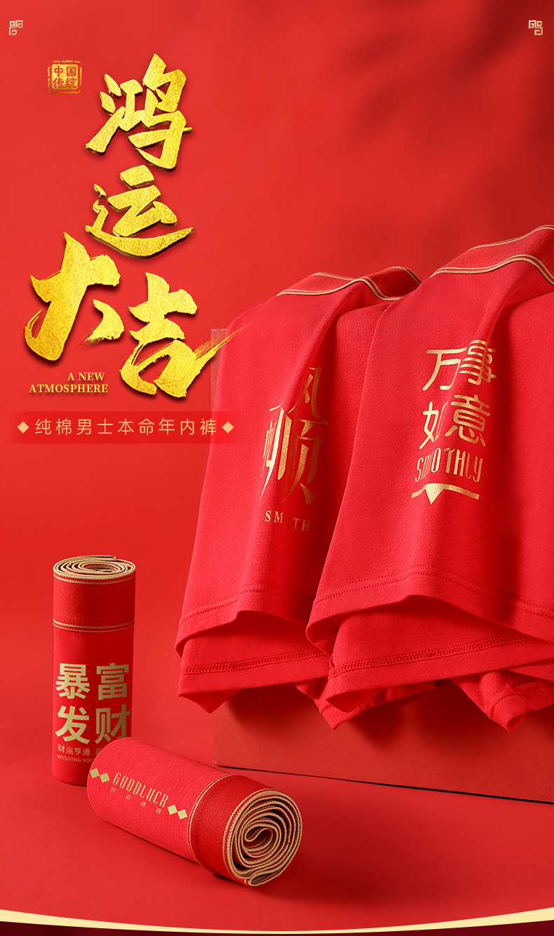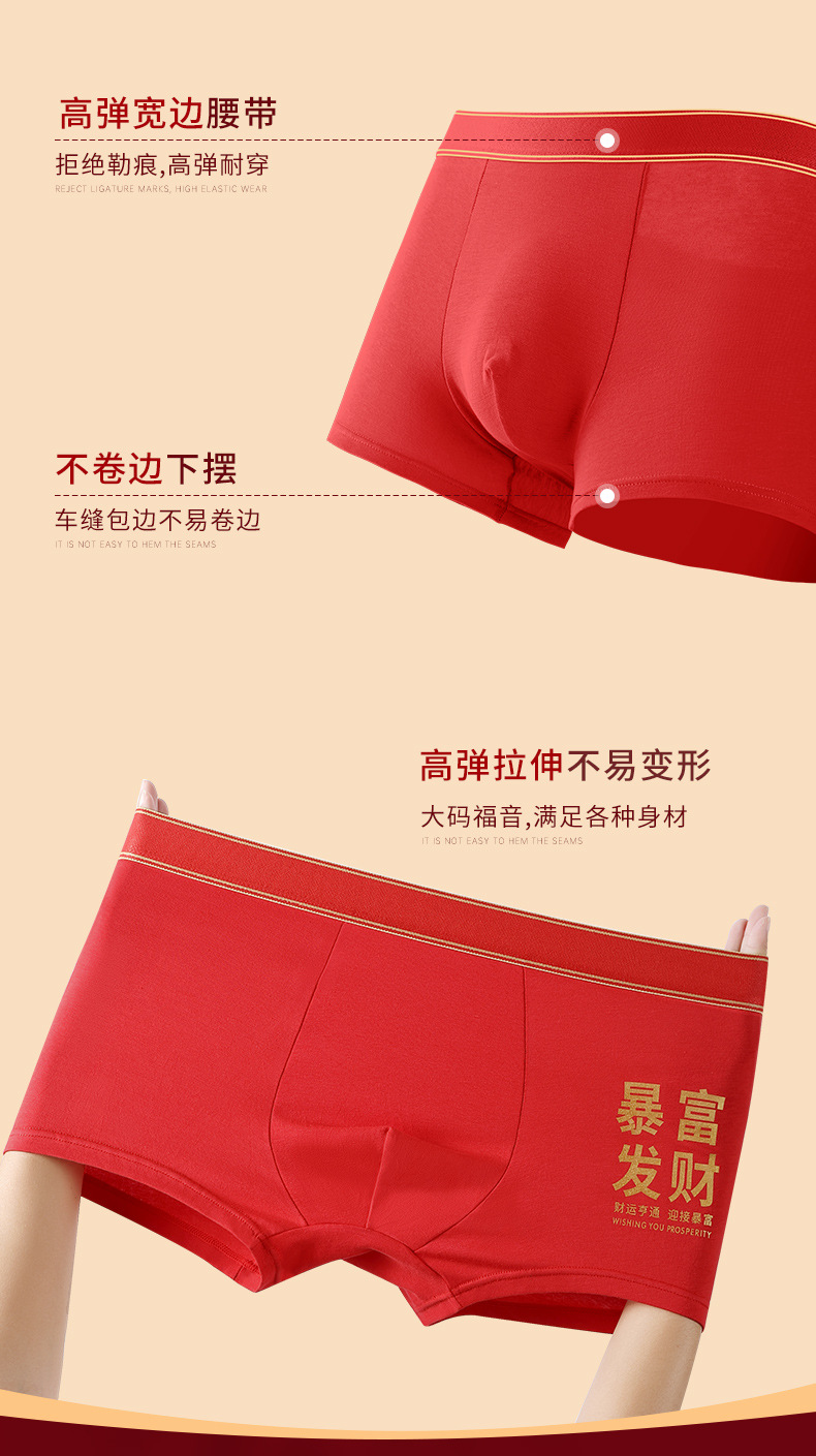 鸿运大吉【纯棉男士本命年红色内裤礼盒】结婚 舒适桑蚕丝 抑菌档 吸湿透气 平角四角裤