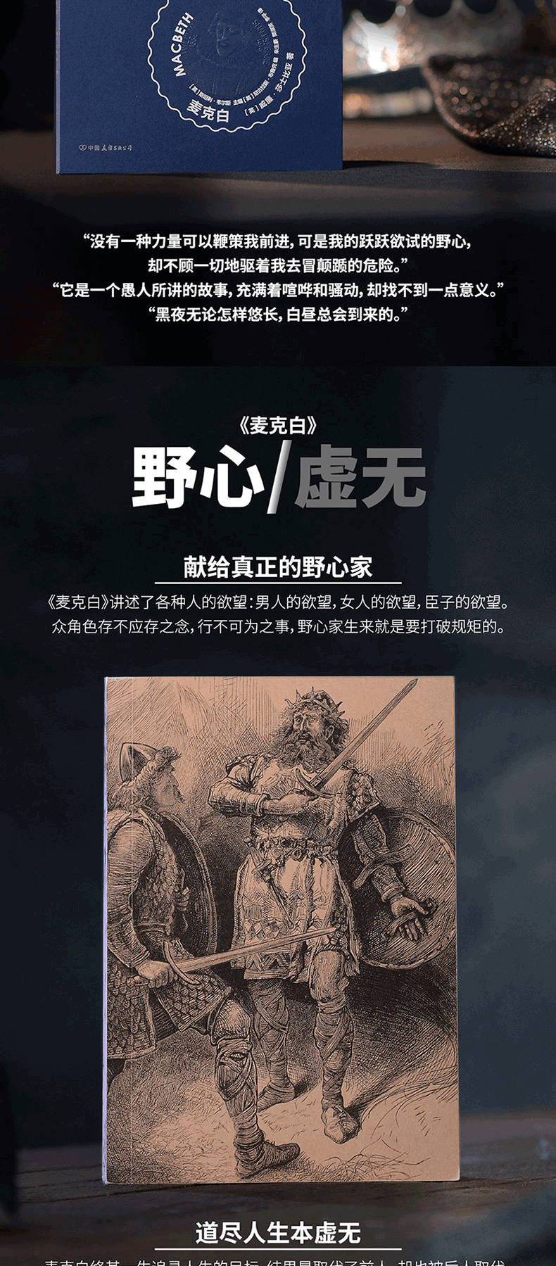"苏格兰将军麦克白从命运三姐妹处得知自己即将成为新王。在老国王邓肯留宿当晚,麦克白受到妻子鼓动,用小刀杀死邓肯。当预言终于实现,麦克白被野心与罪恶反噬,变得疑神疑鬼,精神错乱,最终被起义的部下砍下头颅。 《麦克白》是众多莎剧中戏剧冲突强烈的作品之一,它体量小,却拥有多重高潮和层叠反转,以及复杂性不亚于哈姆雷特的主人公——麦克白。本剧的精妙之处在于对人心深层的探索与揭露,在麦克白大段独白中,我们得以窥见个体灵魂中野心与良心、欲望与胆怯、善与恶的交织与对抗。众多幻象游走其间,更增添了浪漫主义色彩。 本书导读及注释由东英吉利大学尼古拉斯·布鲁克教授编撰,从多样的戏剧幻象、出色的语言效果、巴洛克审美下的《麦克白》、四百多年的演出史等种新颖角度切入分析这部莎翁经典悲剧。"