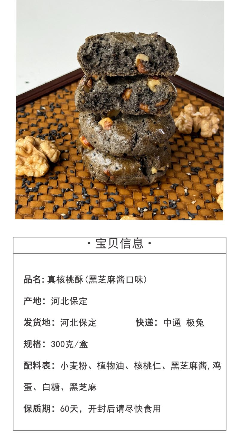 【真核桃酥(黑芝麻酱口味)】酥松香浓,核桃仁的脆香与黑芝麻酱的细腻完美融合,入口即化,满口留香!纯手工制作,轻烘慢焙,每一块都酥到掉渣!规格:2盒装(300克/盒,10个装)