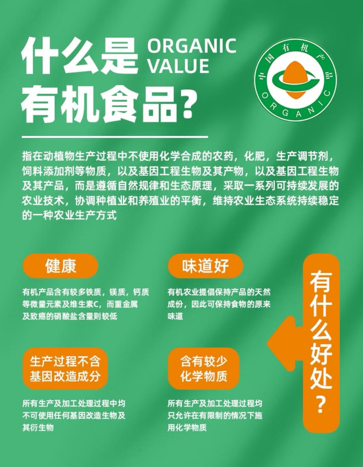 1.自然种植与养殖:有机食品通常采用有机肥料和天然的农业方法种植或养殖,比如,土壤中不使用化学肥料,而是通过有机堆肥、轮作等方法保持土壤的健康 2.无化学农药:在有机农业中,农民不会使用化学合成的农药来防治害虫或病菌,而是使用天然的方式,如生物防治、物理方法等 3.无转基因成分:有机食品不含转基因成分,这是有机认证的重要标准之一 4.严格的生产认证:有机食品的生产、加工和包装都需要符合严格的认证标准。比如在中国和全球范围内,许多国家和地区都有专门的有机认证机构,对这些食品进行监督和认证。✅ 5.生态友好:有机农业提倡可持续发展,注重生态平衡,避免土地的过度开垦或水源的污染,尽量减少对环境的负面影响。💦 6.健康与营养:虽然有机食品的健康和营养优势存在一定争议,但一些研究表明,有机食品通常含有更高的抗氧化物质和某些营养成分,且因为没有使用化学添加剂,对人体的健康负担更小