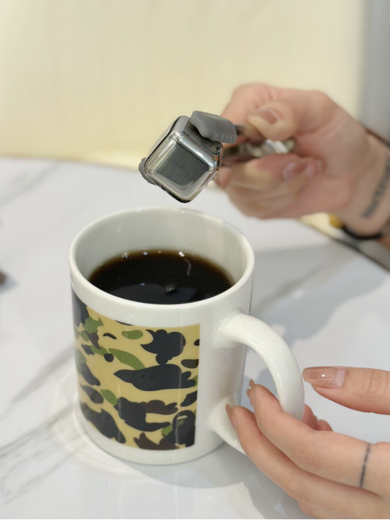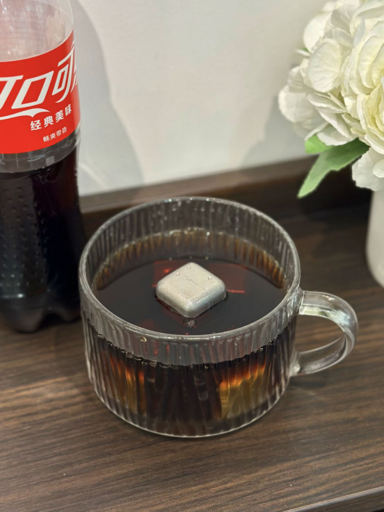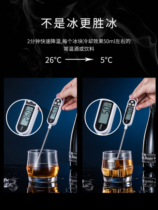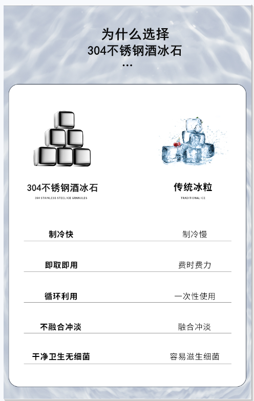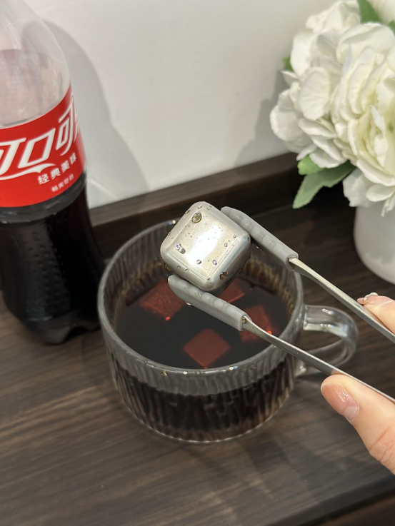 饮品里加冰,虽然能缓慢降温 但随着冰块渐渐融化 饮品的口感、纯度总会受到影响 不锈钢冰酒石有效解决鸡胁冰块的操作问题