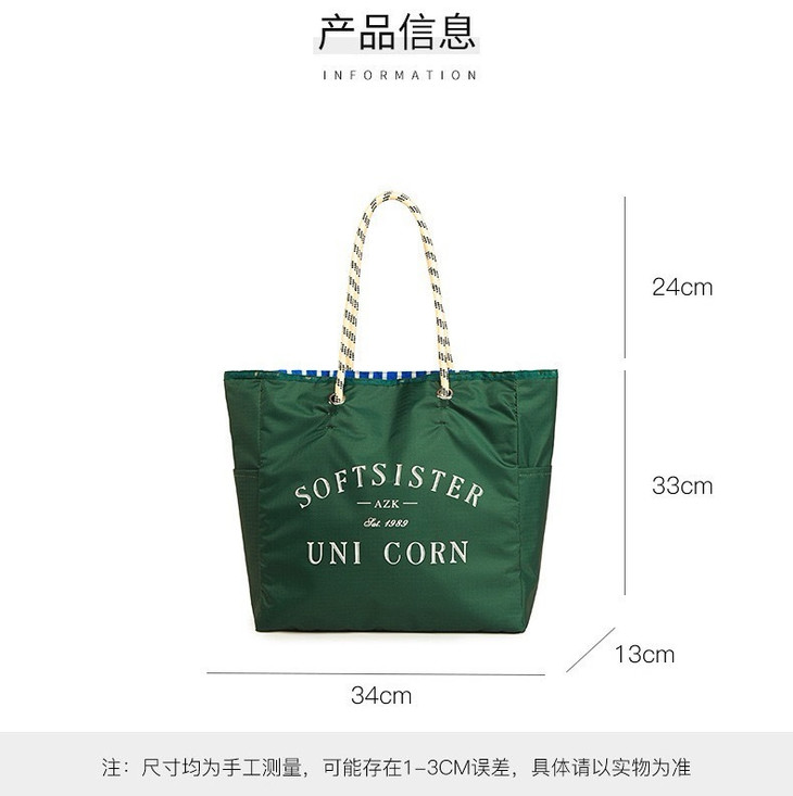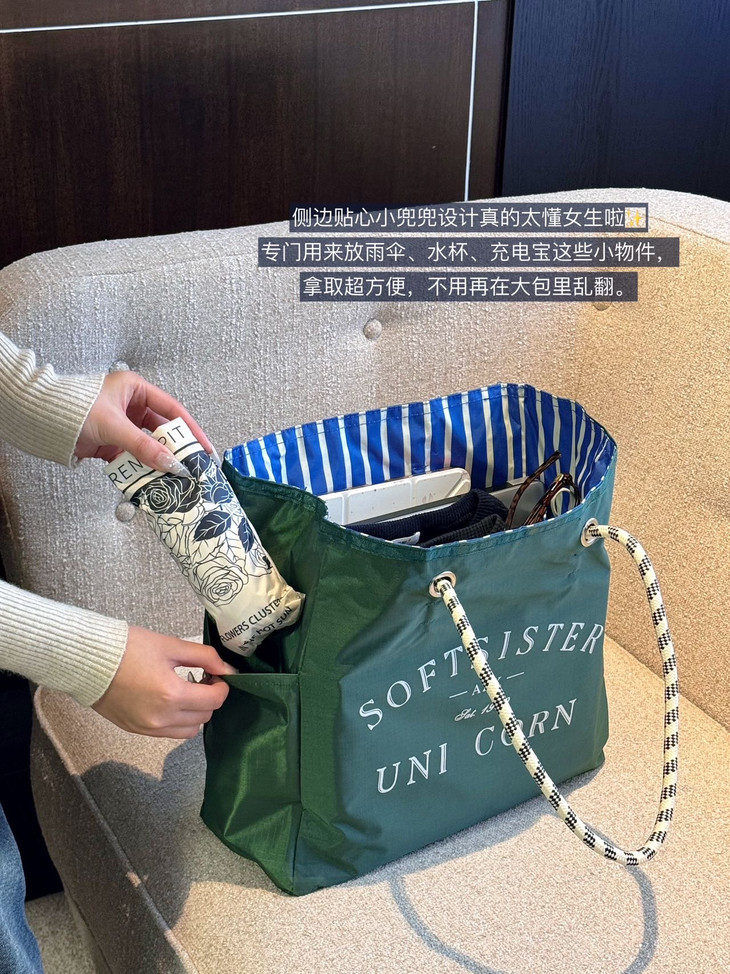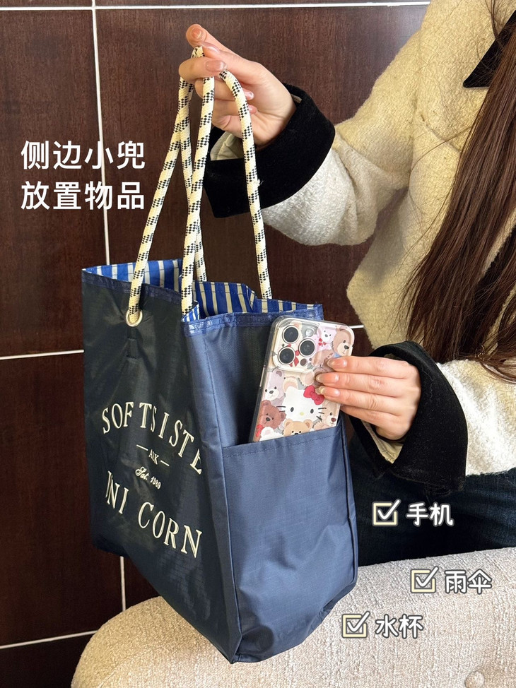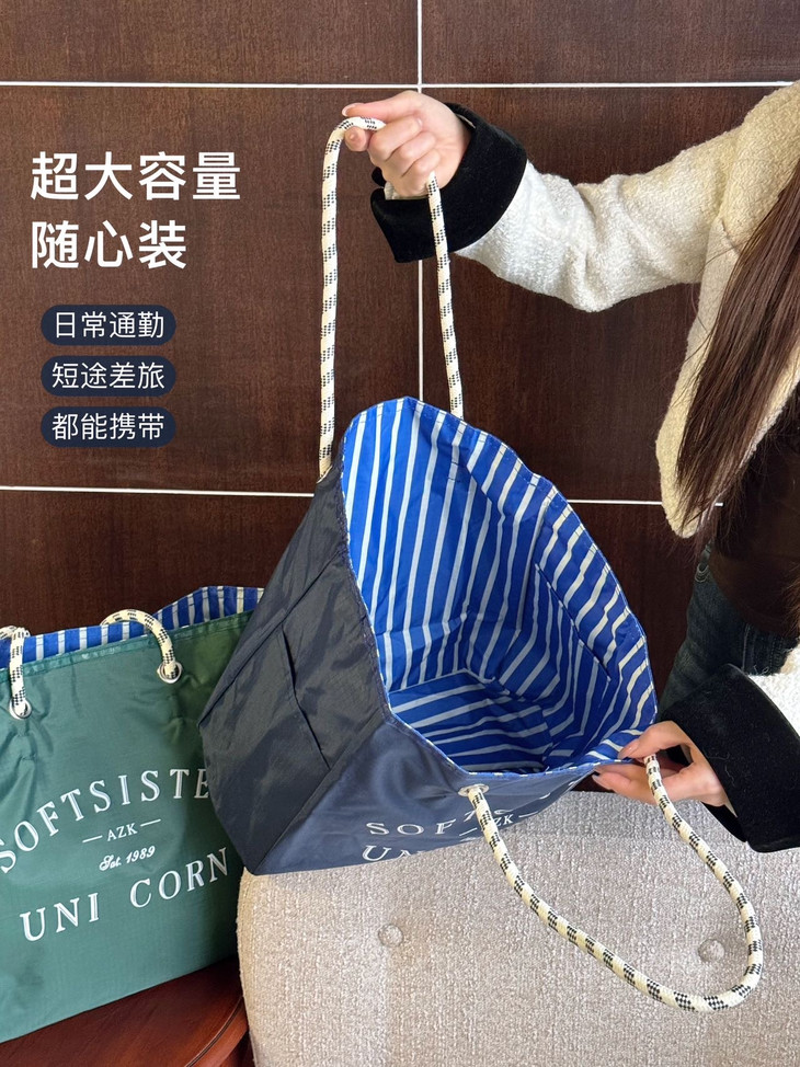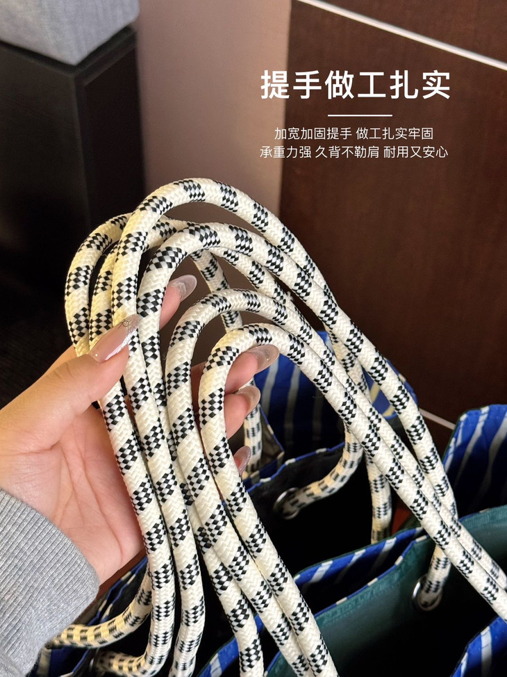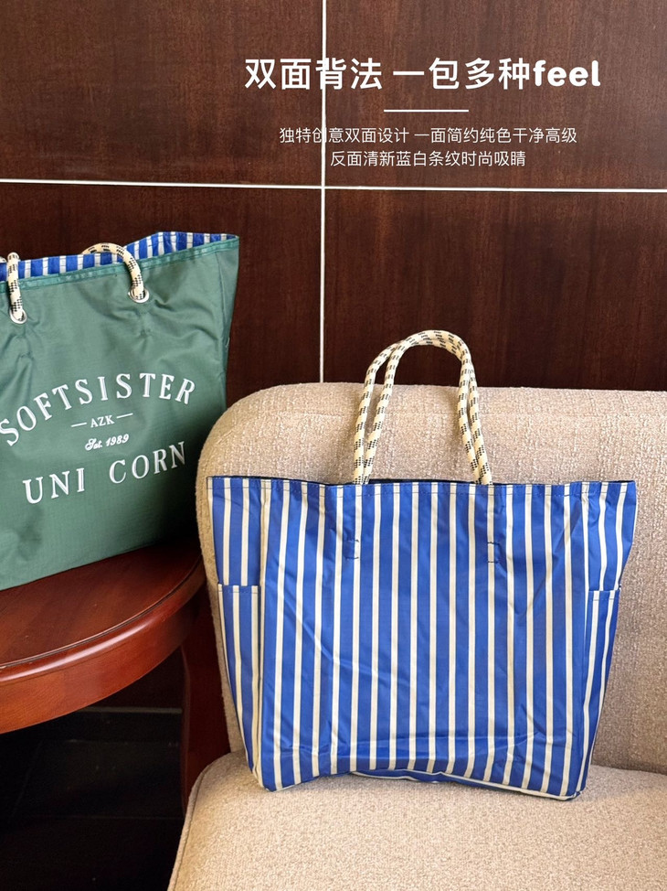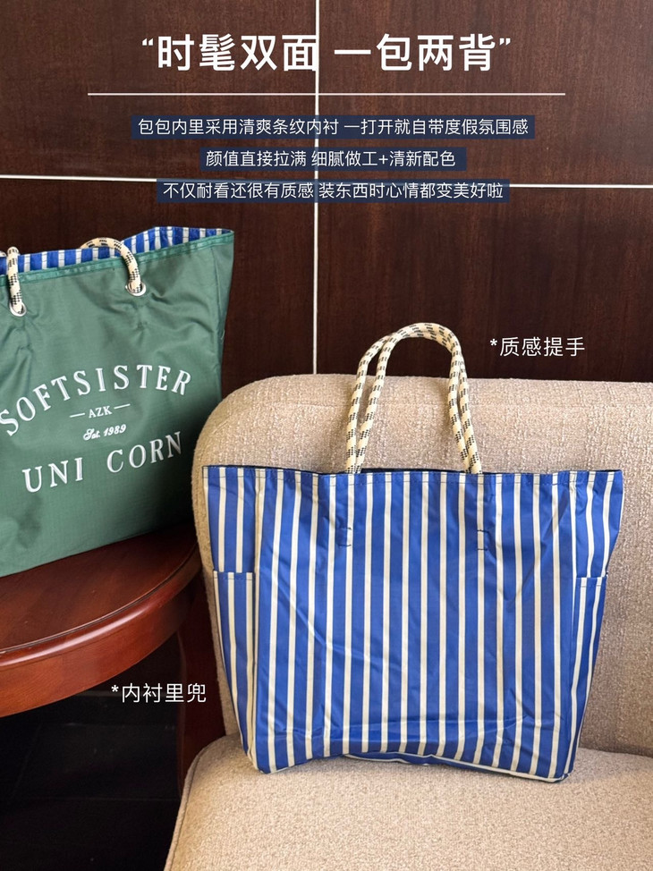 整体做工精致细腻走线工整均匀 细节处尽显用心 双面设计一面简约纯色一面字母印花 颜值与实用性双在线 搭配清爽条纹内里度假感十足 侧边小兜贴心实用配色高级耐看 从面料到剪裁都透着用心❤️强烈推荐!