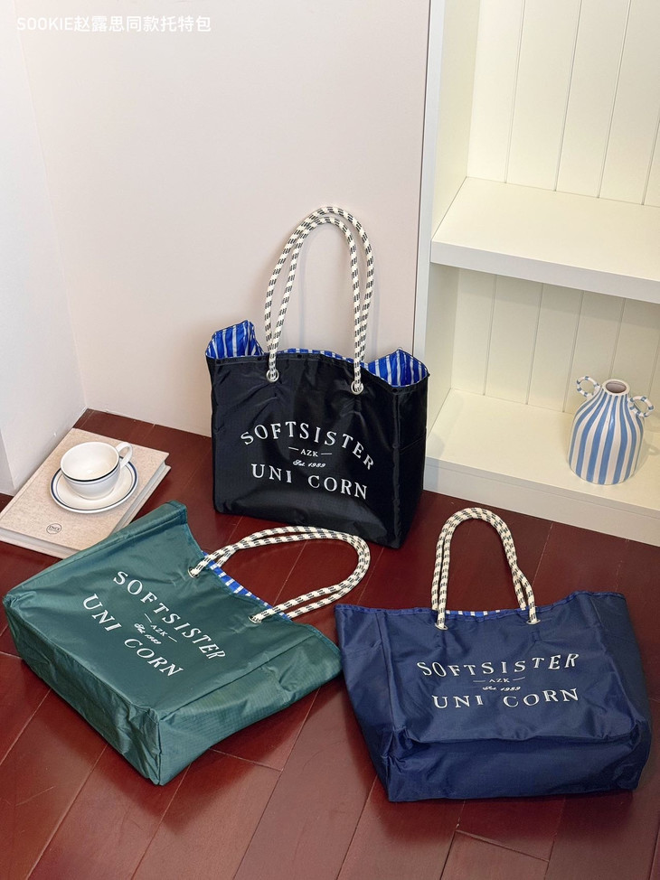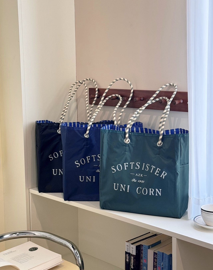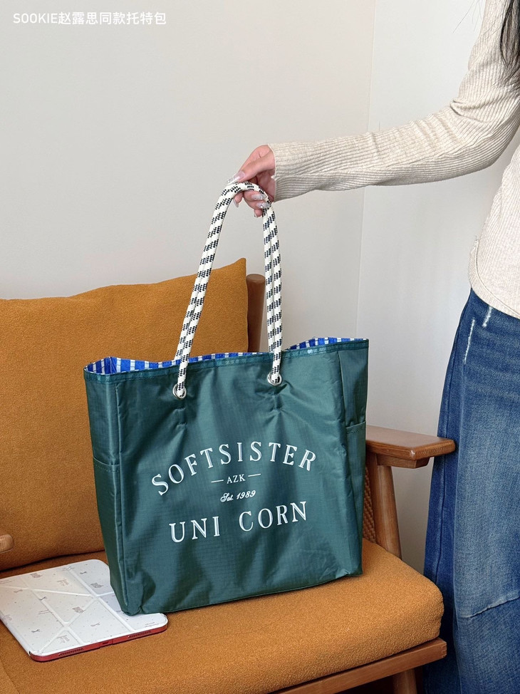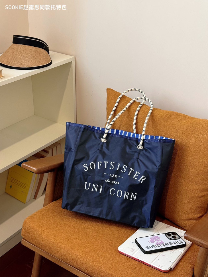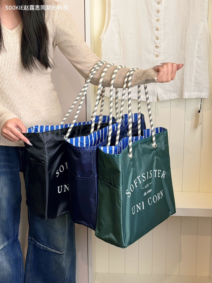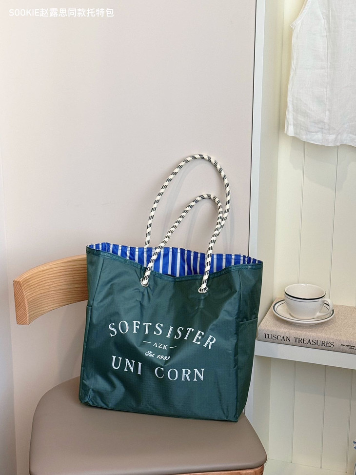 整体做工精致细腻走线工整均匀 细节处尽显用心 双面设计一面简约纯色一面字母印花 颜值与实用性双在线 搭配清爽条纹内里度假感十足 侧边小兜贴心实用配色高级耐看 从面料到剪裁都透着用心❤️强烈推荐!