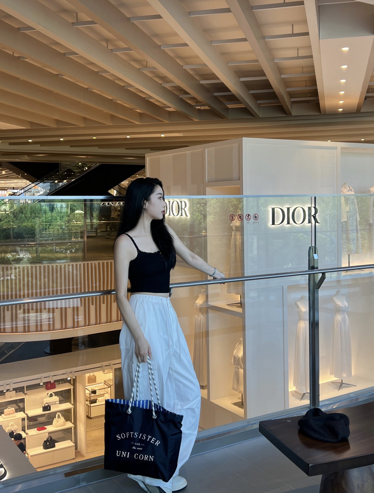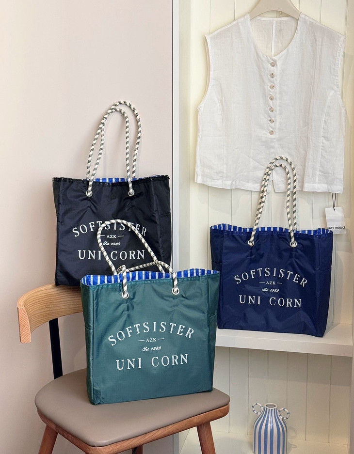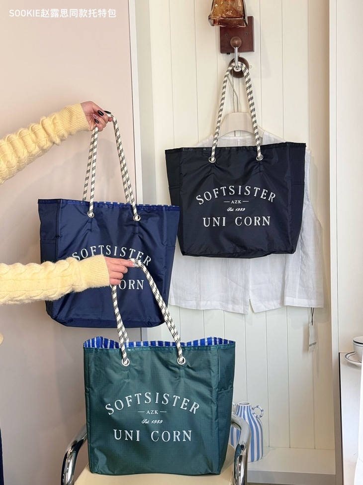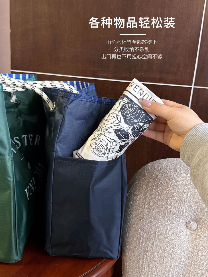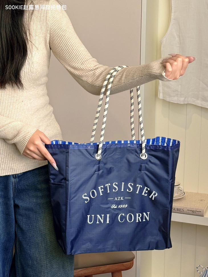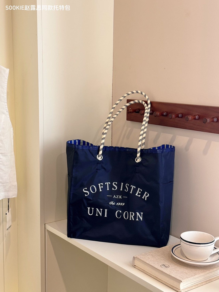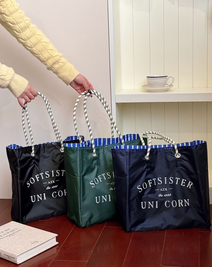 整体做工精致细腻走线工整均匀 细节处尽显用心 双面设计一面简约纯色一面字母印花 颜值与实用性双在线 搭配清爽条纹内里度假感十足 侧边小兜贴心实用配色高级耐看 从面料到剪裁都透着用心❤️强烈推荐!