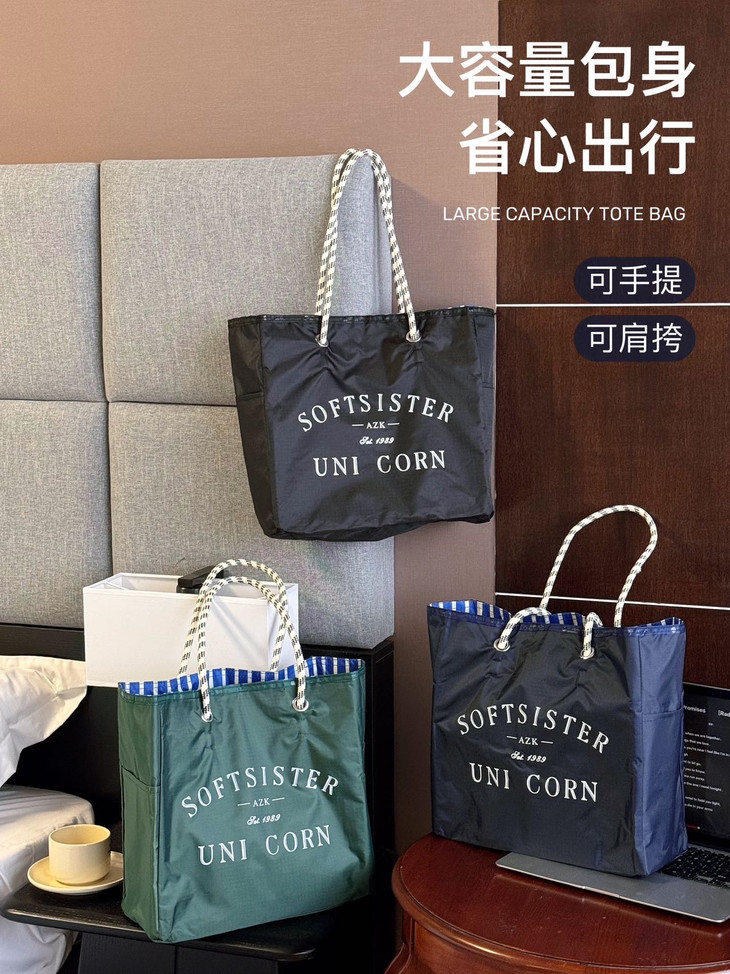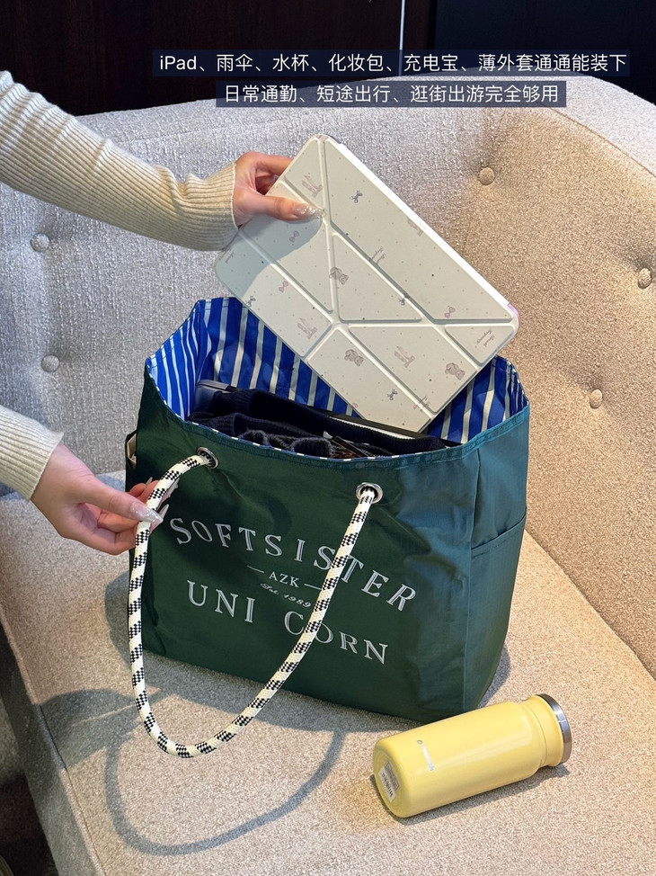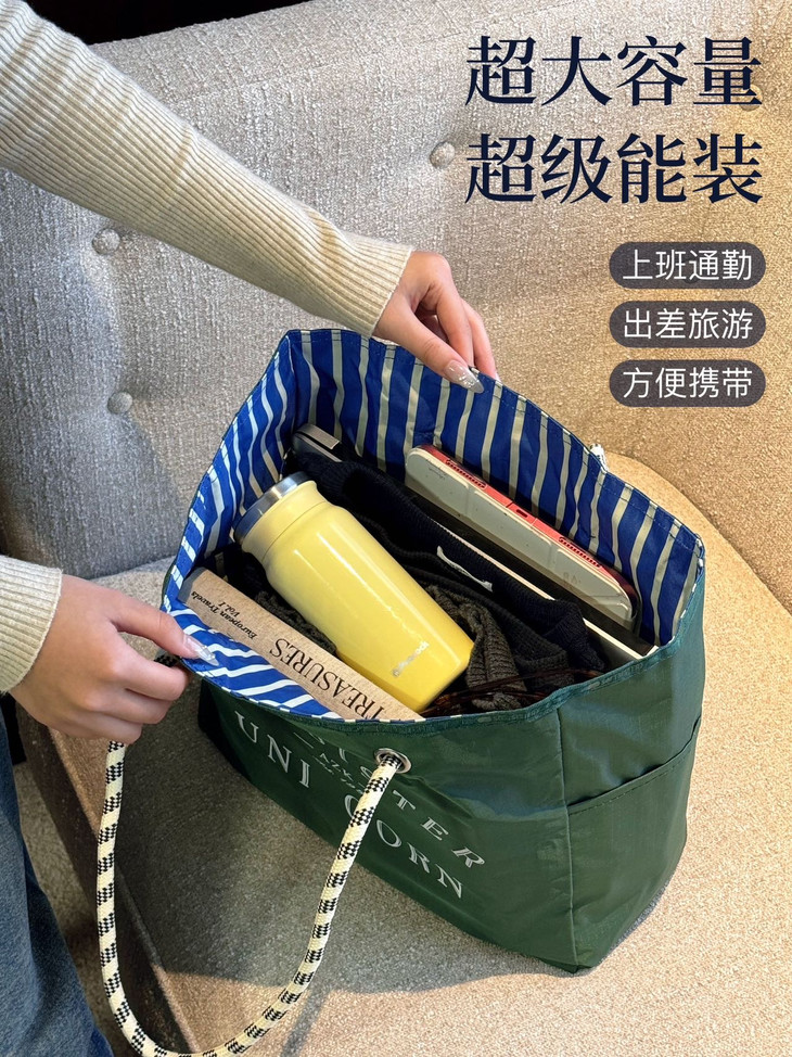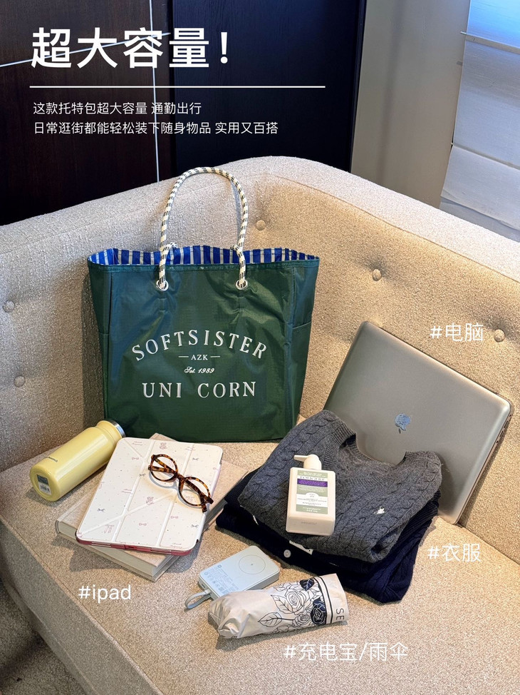 这只托特包容量真的巨能装📦 iPad、雨伞、化妆包、水杯、薄外套 各种小物件统统轻松放下 日常上班、上学、短途出差 周末出游一包搞定再也不用大包小包 清爽出门超方便实用性直接封神! 😆细节控真的会爱! 包包内里采用清爽条纹内衬 一打开就自带度假氛围感 颜值直接拉满细腻做工 不仅耐看还很有质感 装东西时心情都变美好 日常通勤、出游、海边度假背 氛围感瞬间拉满出门超吸睛~
