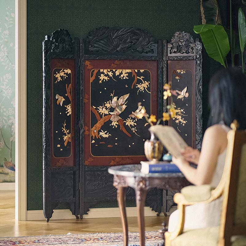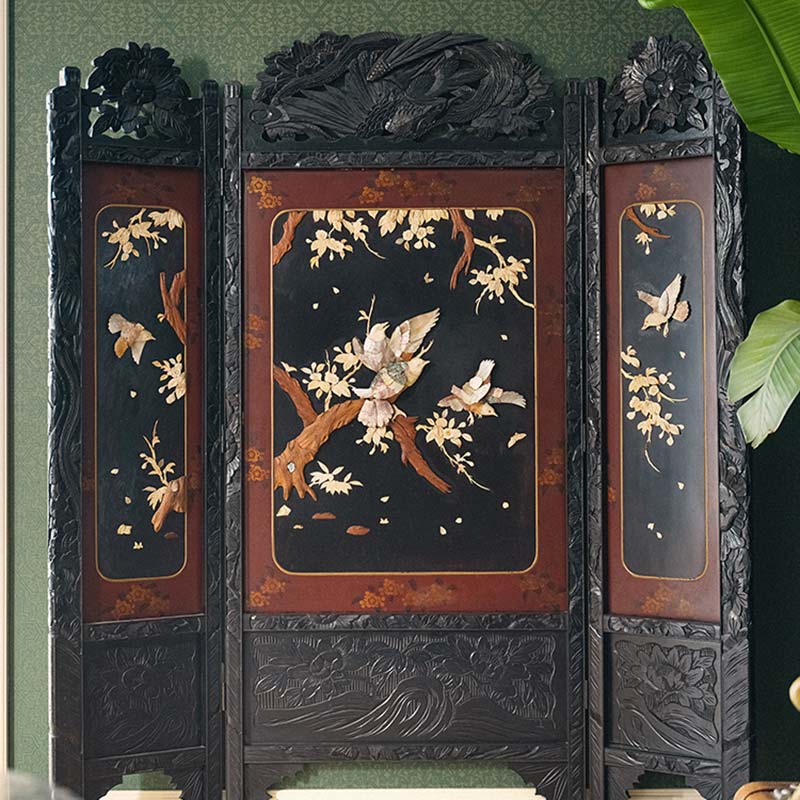 【已售】独角鹿西洋古董 20世纪初日本大正时期出品硬木镂雕「花卉飞鸟图」芝山镶嵌三曲屏风
