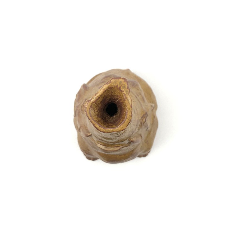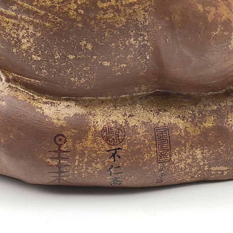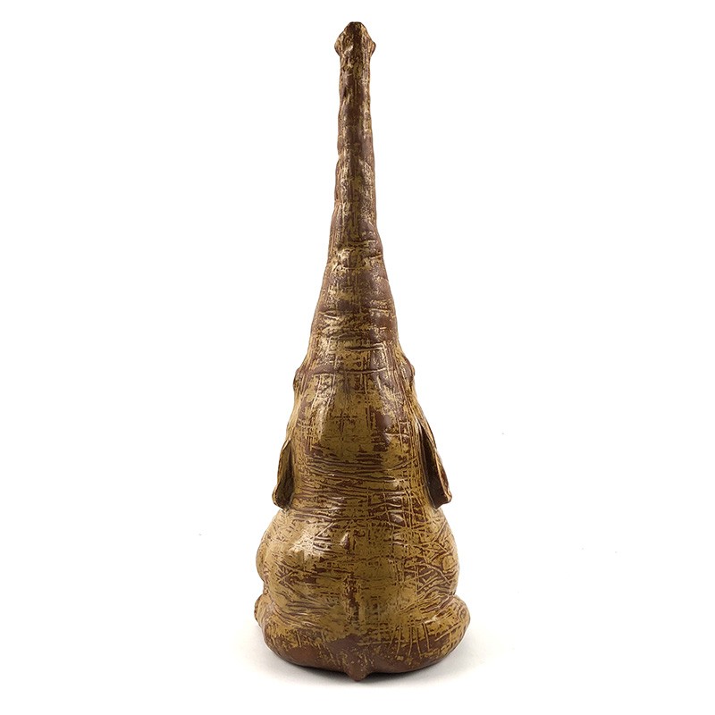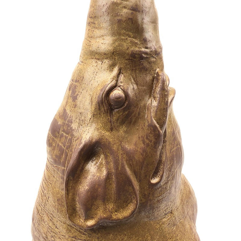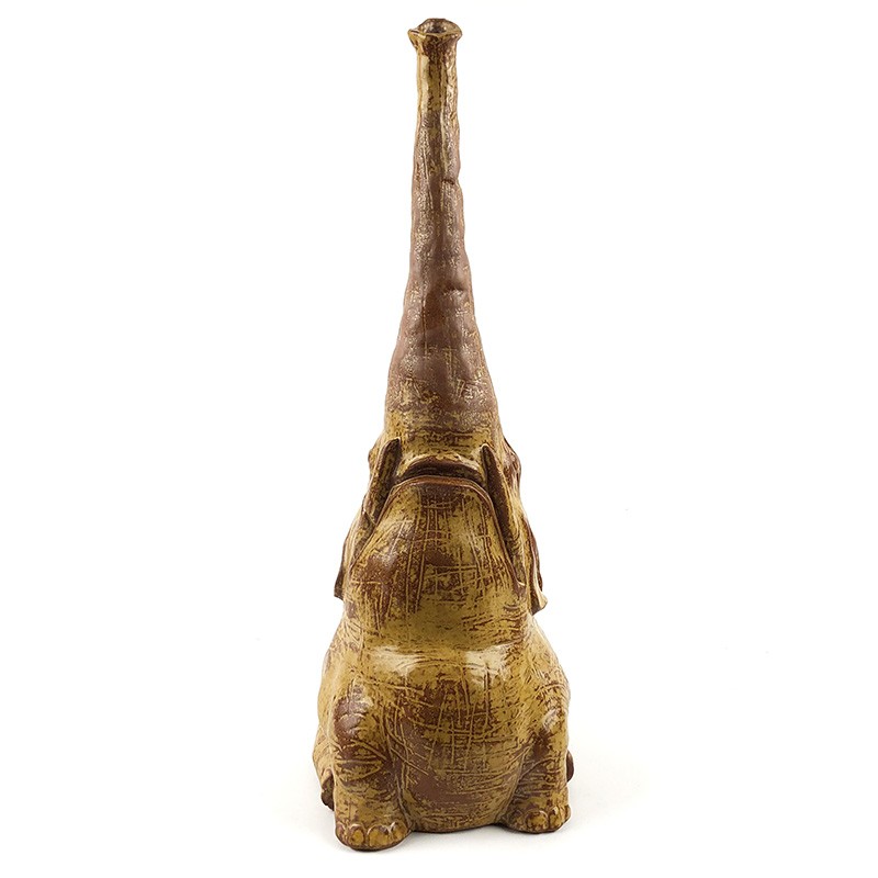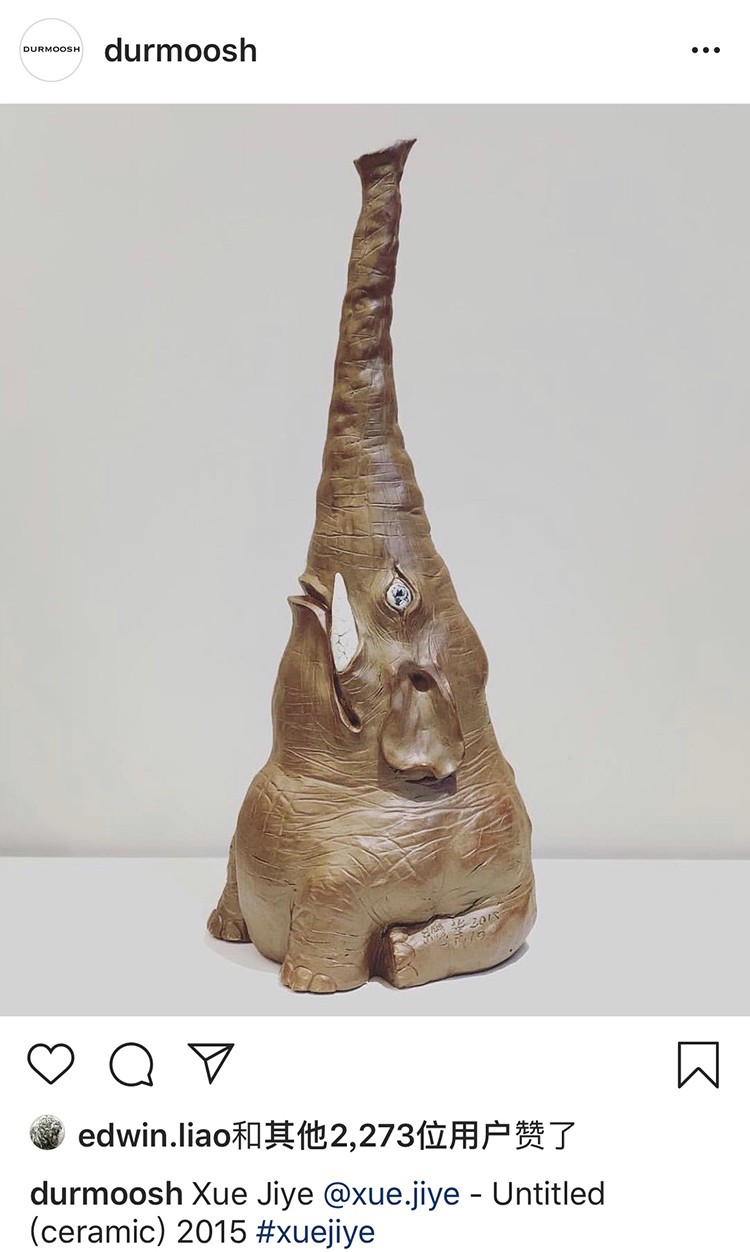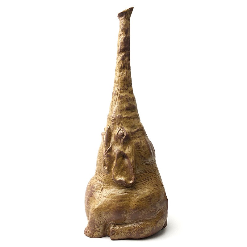 这具陶瓷大象是由薛继业老师创作的雕塑作品,由陶泥塑形,处处都是细节。象鼻笔直朝天,象眼炯炯有神十分可爱。大型的瓷器要烧出如此直挺的象鼻十分不容易,窑中各处温度都必须要十分均匀,稍有不慎象鼻就会烧垮,失去它本有的神气,陶泥柴窑表面颜色变化丰富,难得的陶瓷艺术精品。高:58cm 径:18cm薛继业老师在创作中:揉好的陶泥擀成泥片,围成泥筒从下往上围出整个大象的基础造型细节刻画空心陶泥坯完成陶泥经过半个月阴干,象牙部分和眼睛用白瓷泥浆覆盖,釉下彩勾画眼睛。1300度高温烧成,整体形状完好因为要翻制白瓷雕塑,陶泥表面不施釉,保留所有细节作品完成后在Instagram上广受世界各地艺术爱好者的喜爱加入不仁斋大萌宠家庭扎堆儿更好看,这么大体型的陶瓷雕塑烧制成功率很低,但烧成的大象形体重心稳定,不宜翻倒。